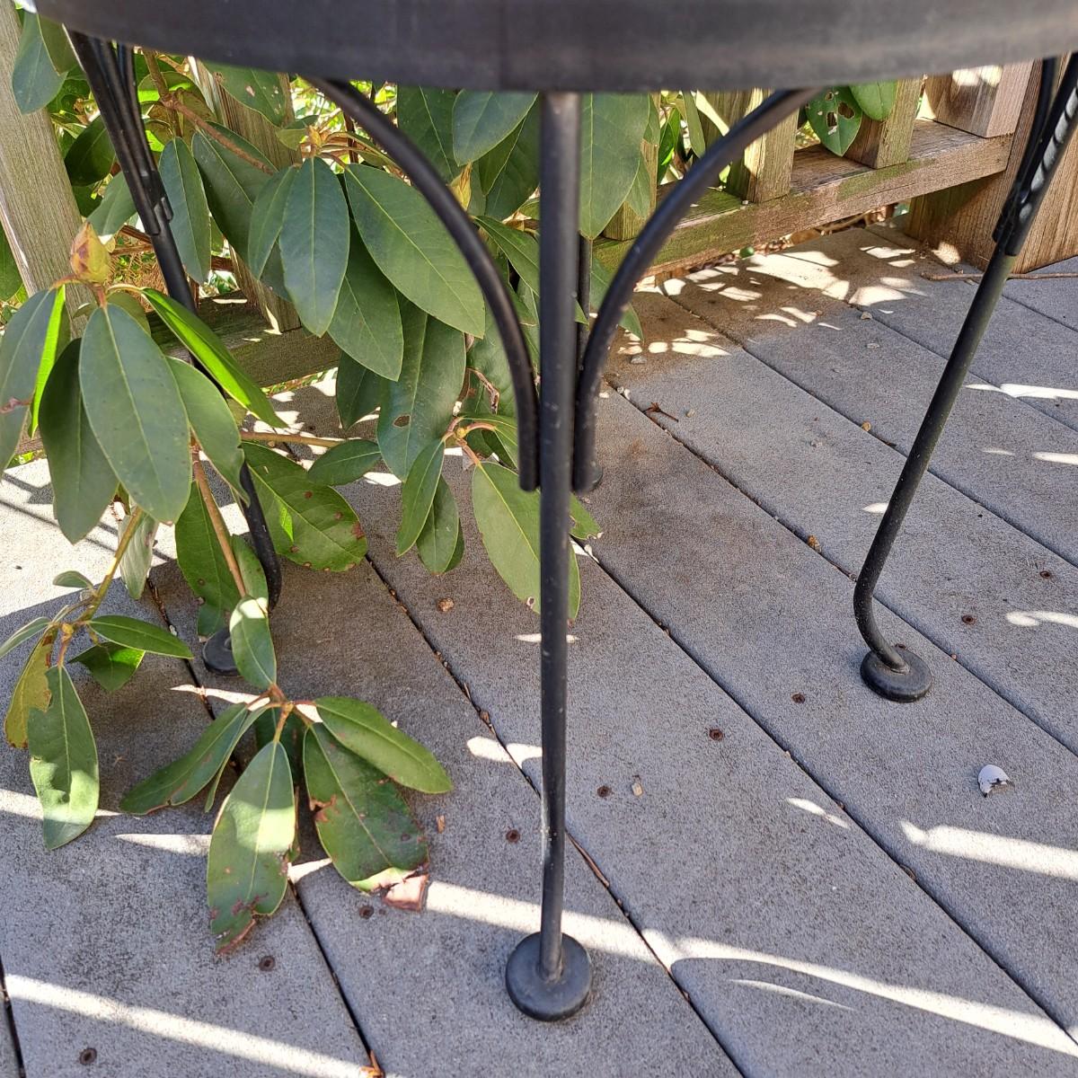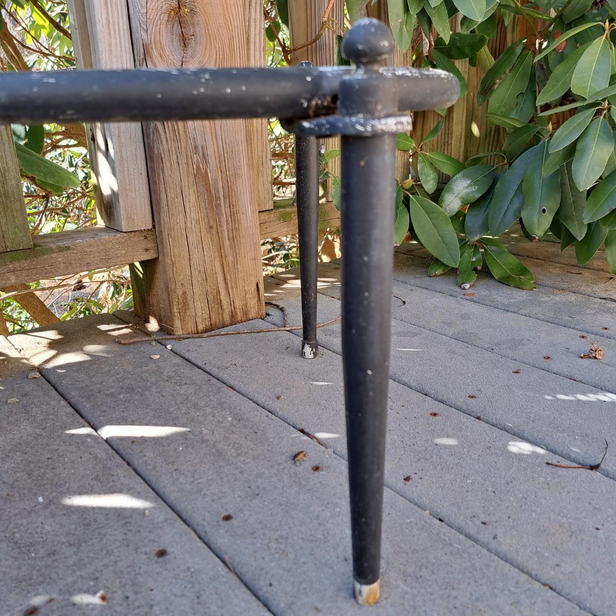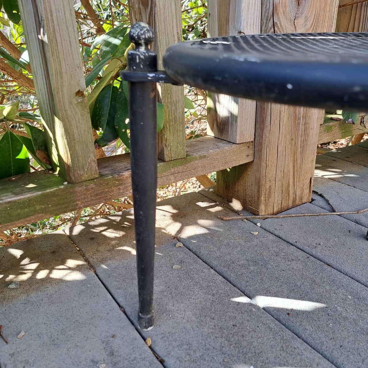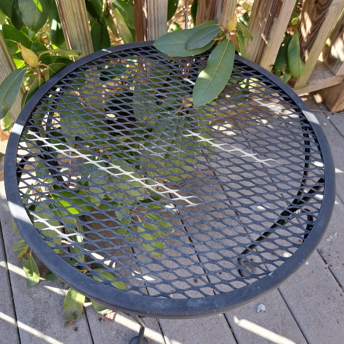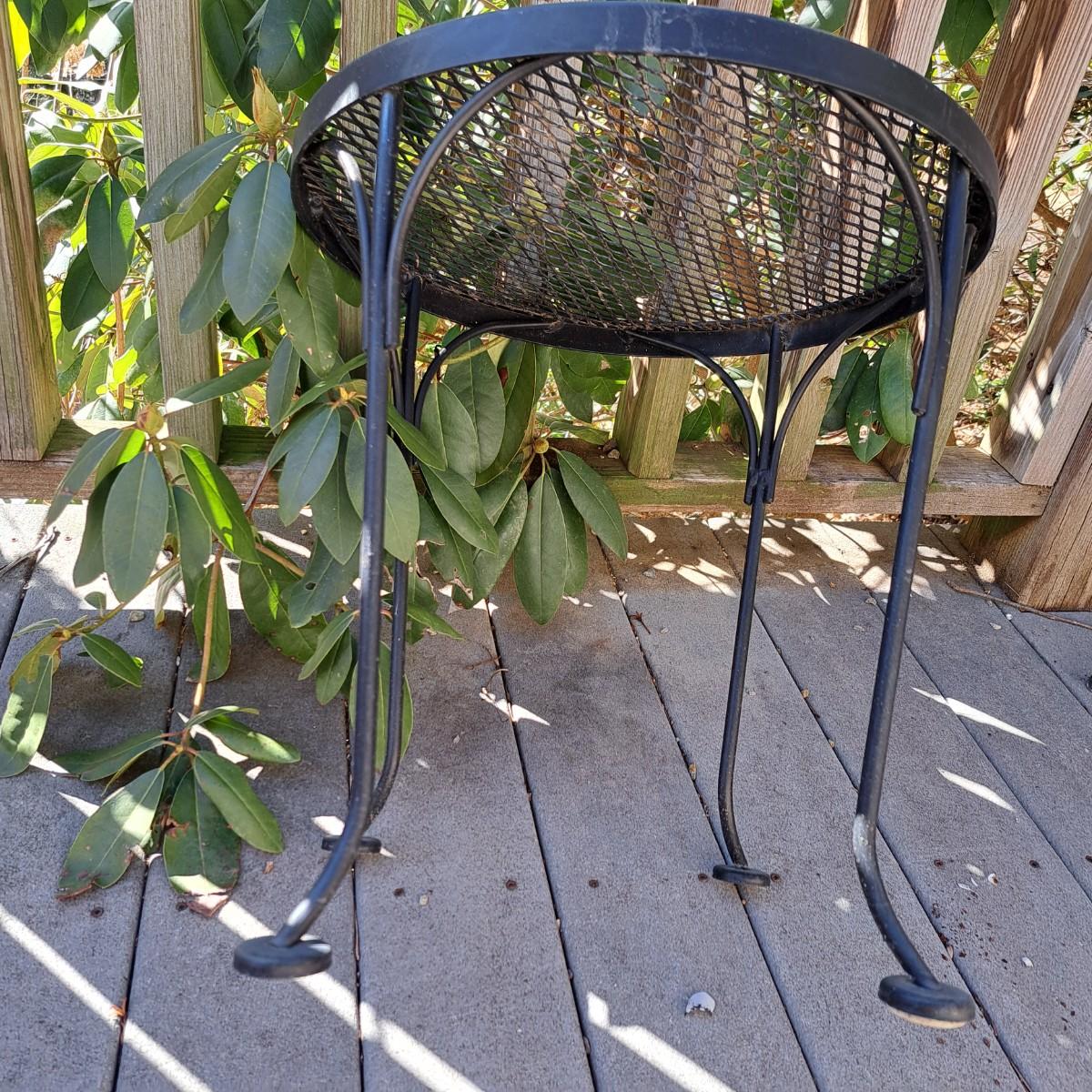 Two small round vintage metal mesh top tables painted black, the larger is 17"D x 17.5"H and has round pads at ends of each four legs. The smaller is 16"D x 12"H and somewhat distressed, has three peg legs and is missing one plastic tip on one leg as shown. Overall, both appear to be in good condition per their age. Local pickup only.