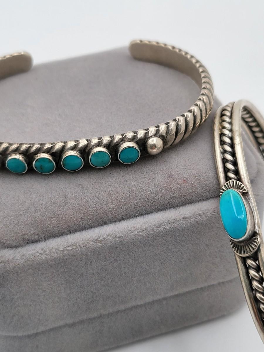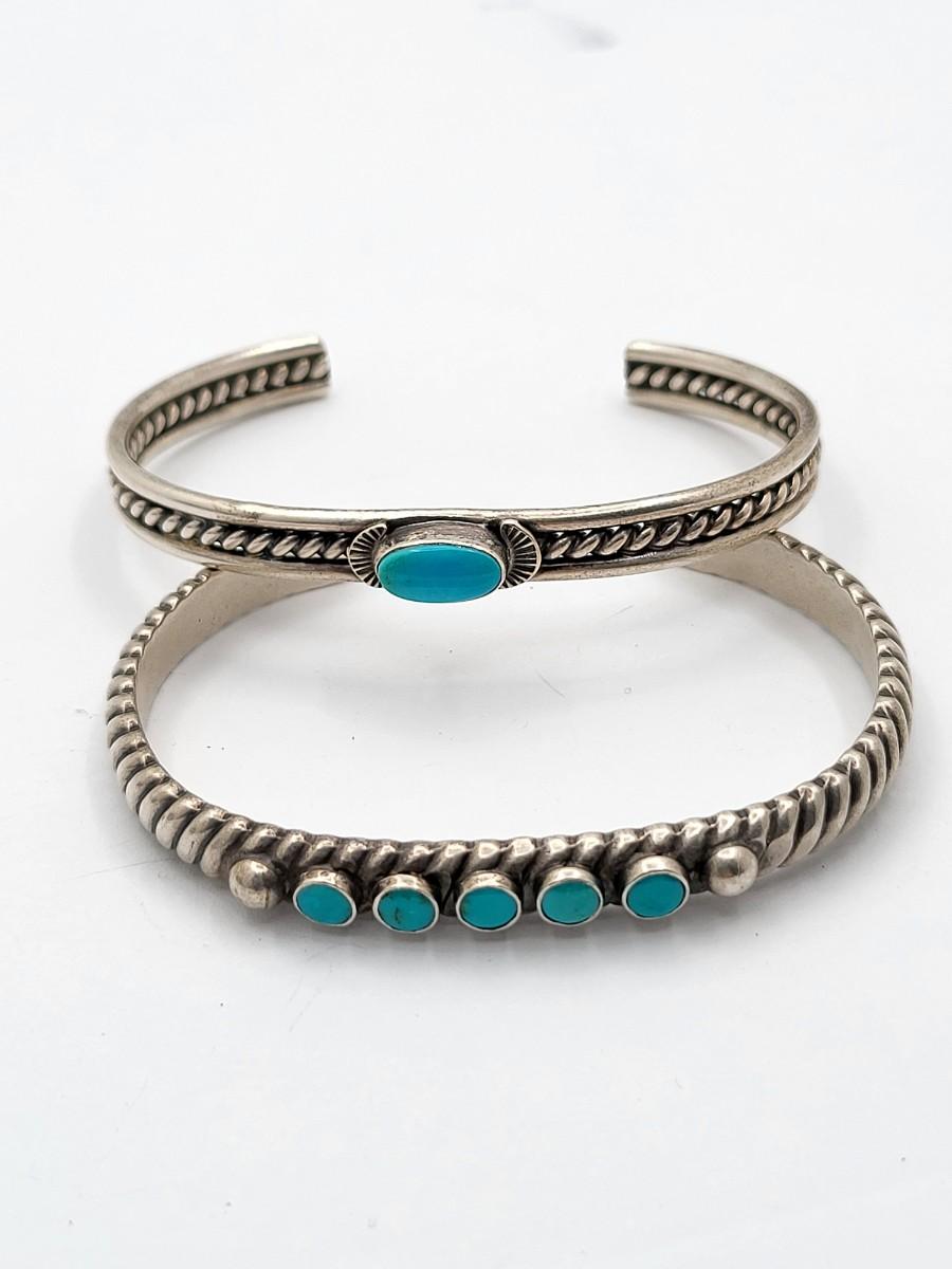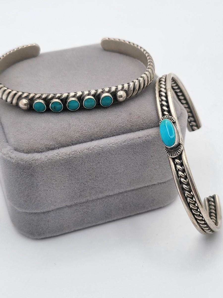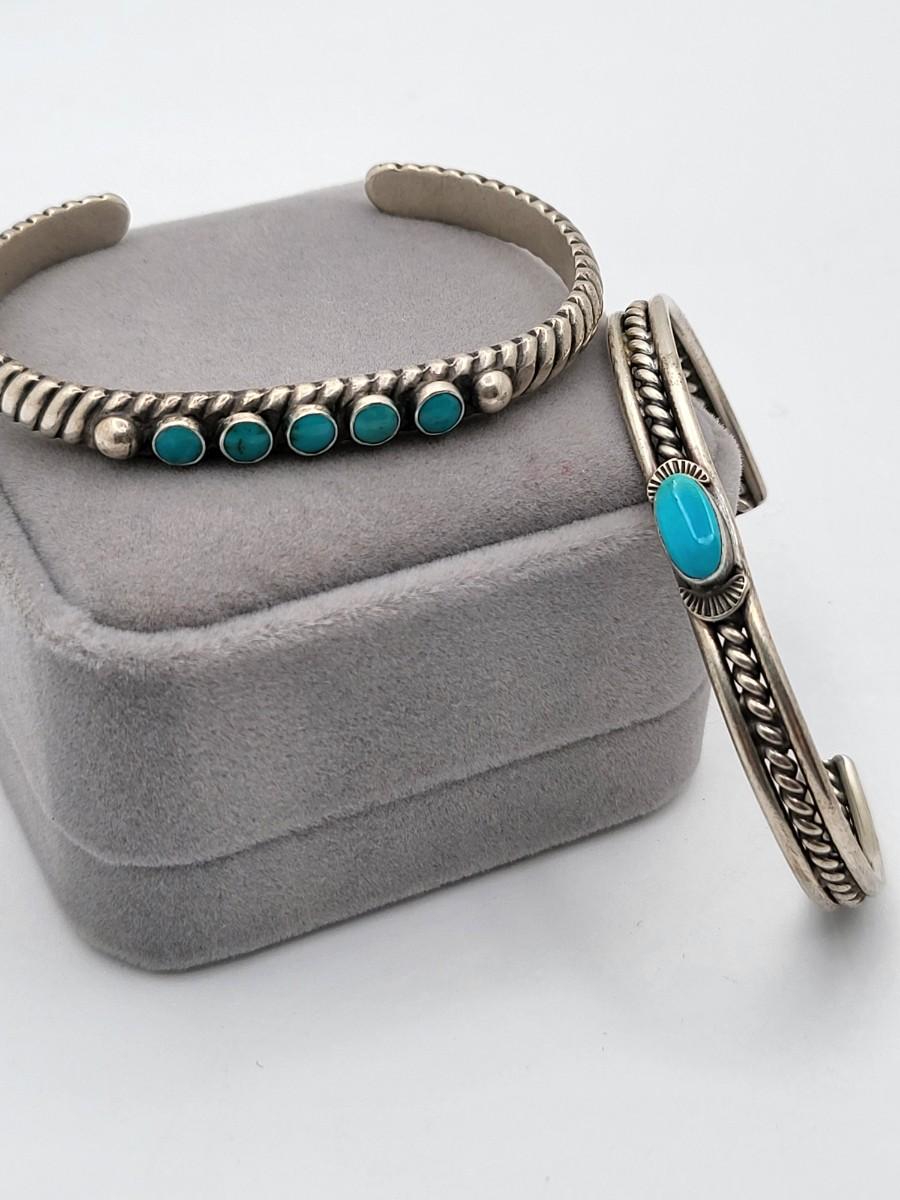Both are cuff style bracelets with genuine turquoise stones. One has fancy set oval turquoise solitaire and one has five small round turquoise stones.