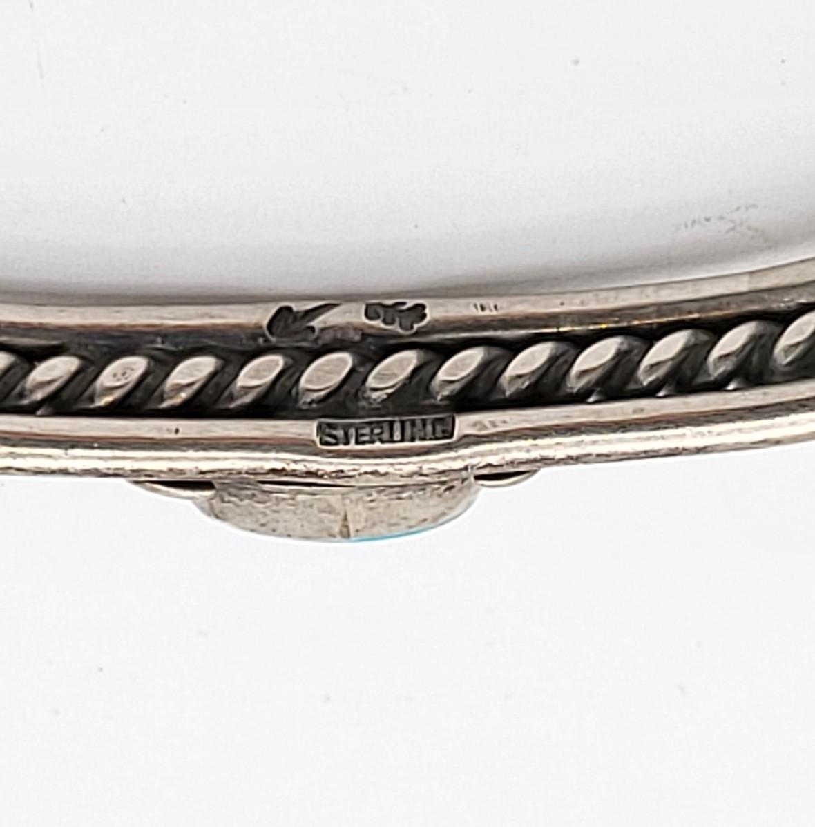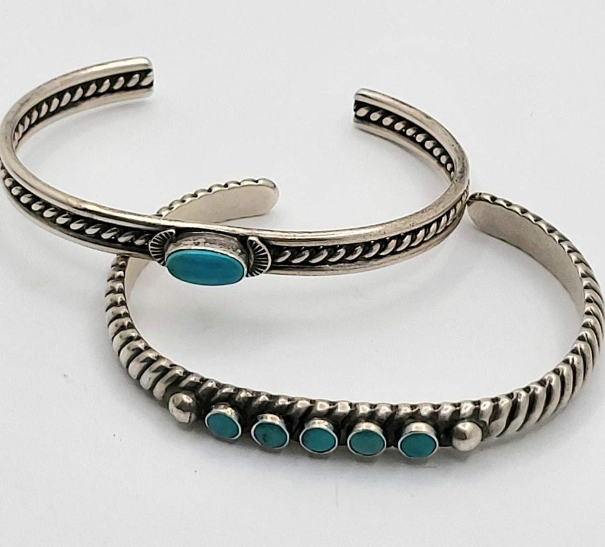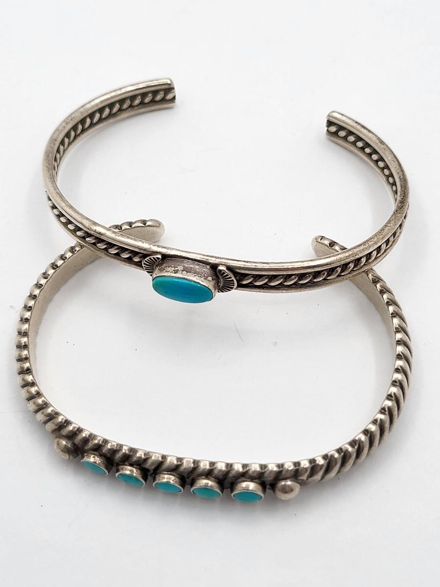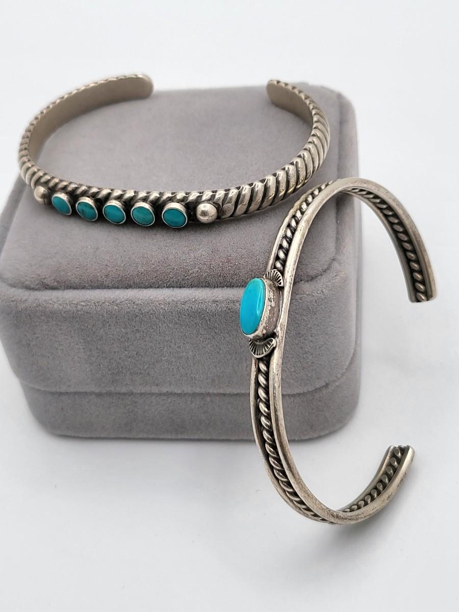Both are cuff style bracelets with genuine turquoise stones. One has fancy set oval turquoise solitaire and one has five small round turquoise stones.
