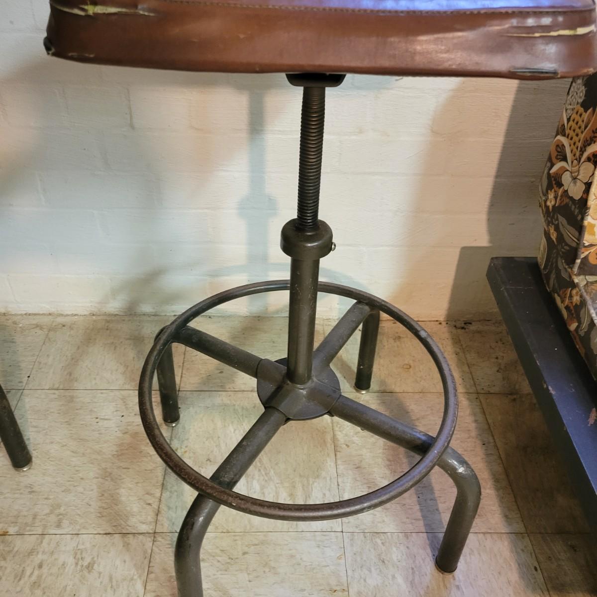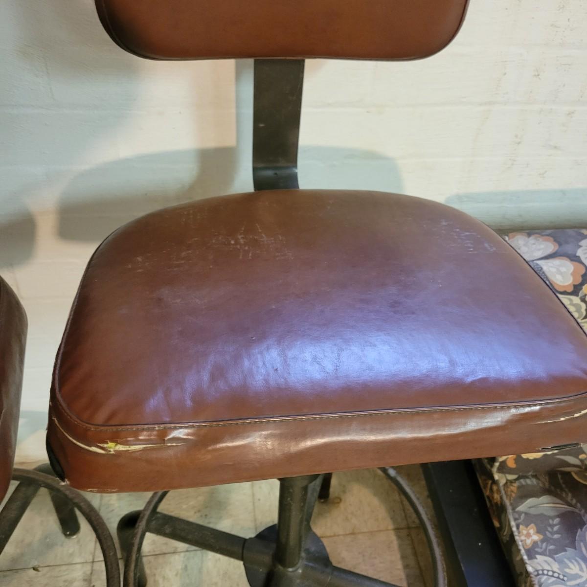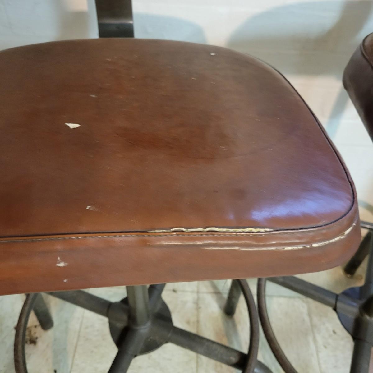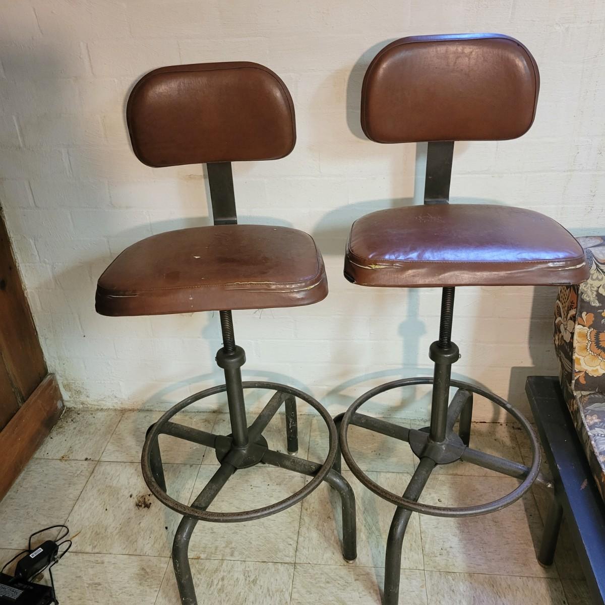 Two swiveling 4 legged stools with adjustable seat height and backs. These chairs are upholstered in a faux leather and are in good to fair condition with some minor cracking in the upholstery from use. The bases are metal. The chairs have plenty of life in them. Stools are adjustable but measure approximately 17" x 18" x 45" with a seat height of 33". Local pickup only.