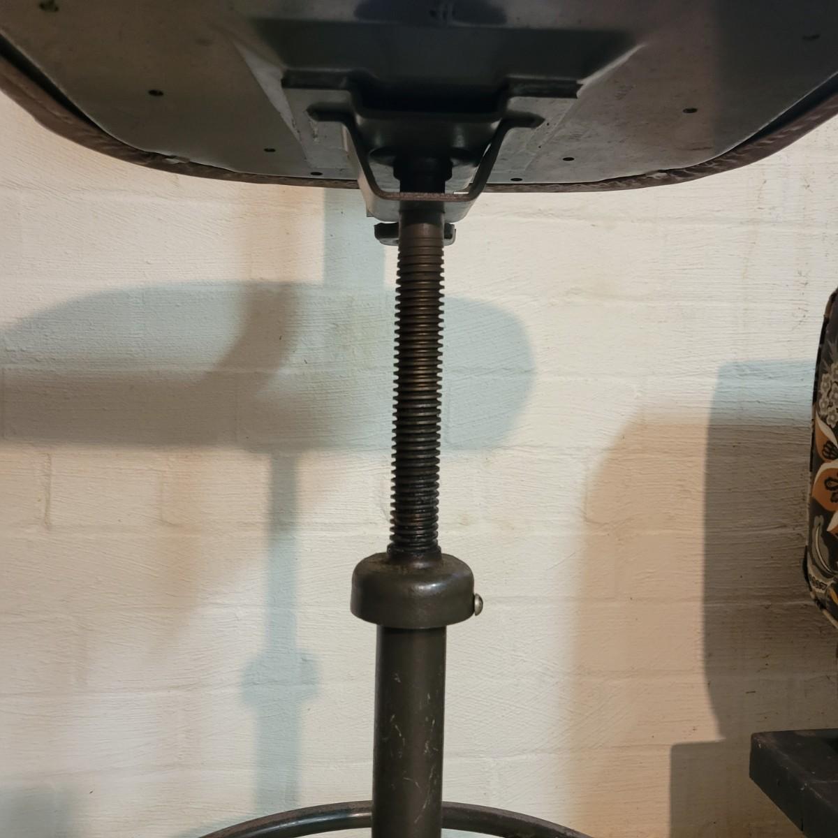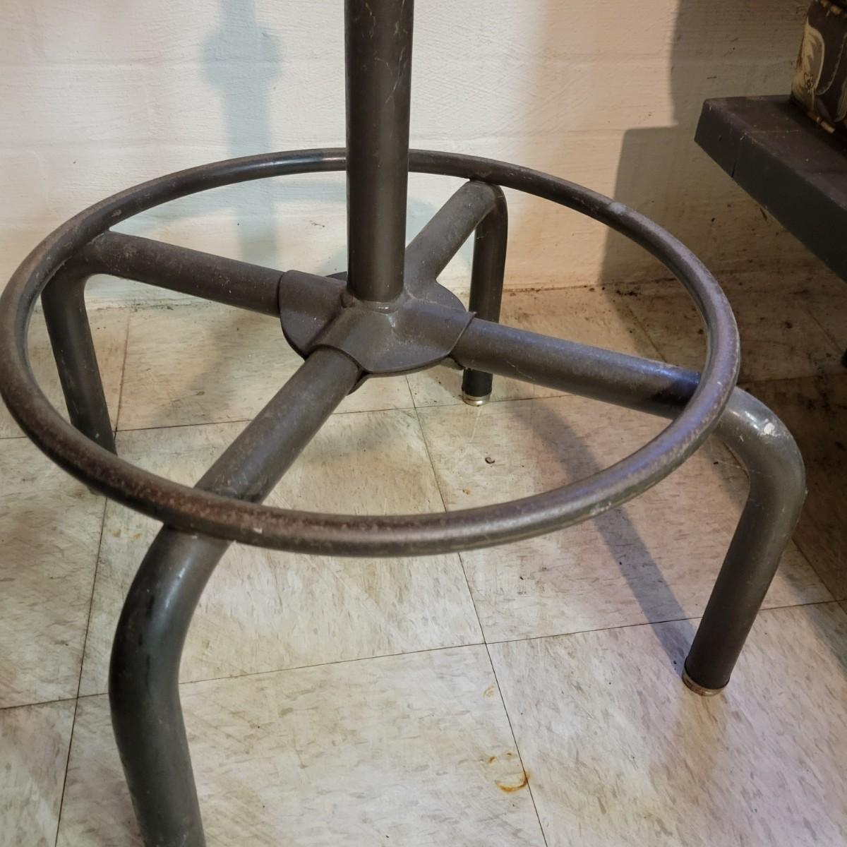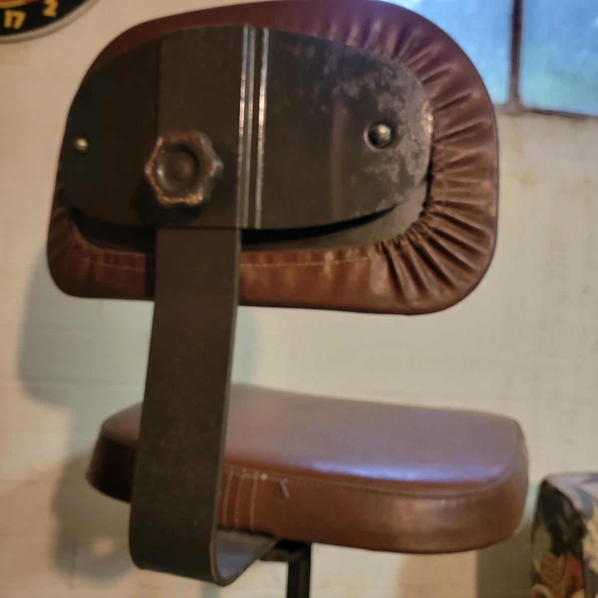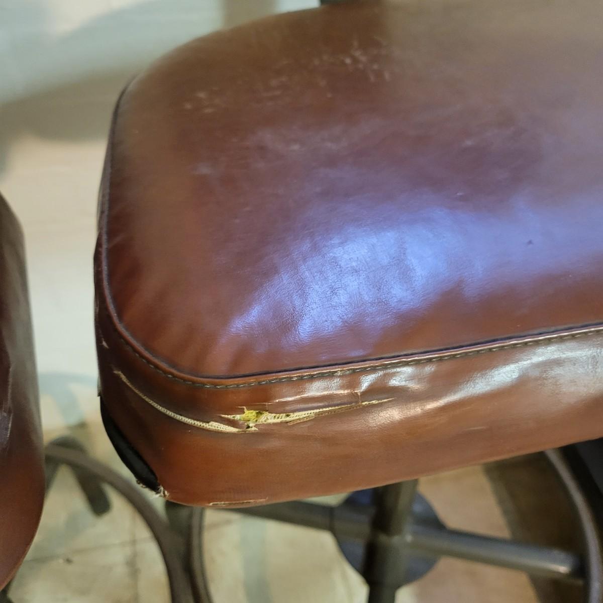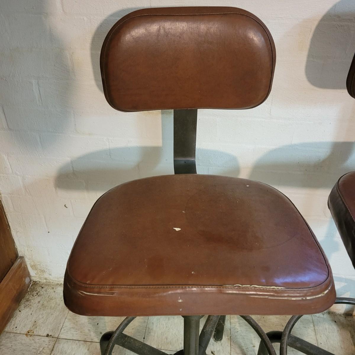 Two swiveling 4 legged stools with adjustable seat height and backs. These chairs are upholstered in a faux leather and are in good to fair condition with some minor cracking in the upholstery from use. The bases are metal. The chairs have plenty of life in them. Stools are adjustable but measure approximately 17" x 18" x 45" with a seat height of 33". Local pickup only.