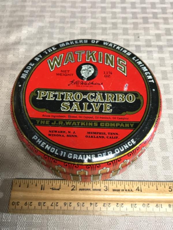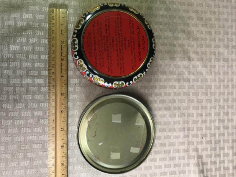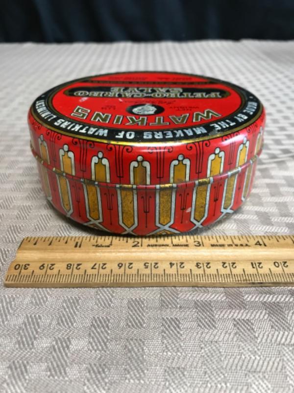 Two vintage tins, one empty and one with contents. The Watkins tin measures 4.5“ in-diameter & 1 7/8” in height. The snowshoe 10 measures 4 3/8“ in““diameter & 1.5“ in height. Watkins tin contains a small amount of the original contents. These items are being sold as collectibles only.