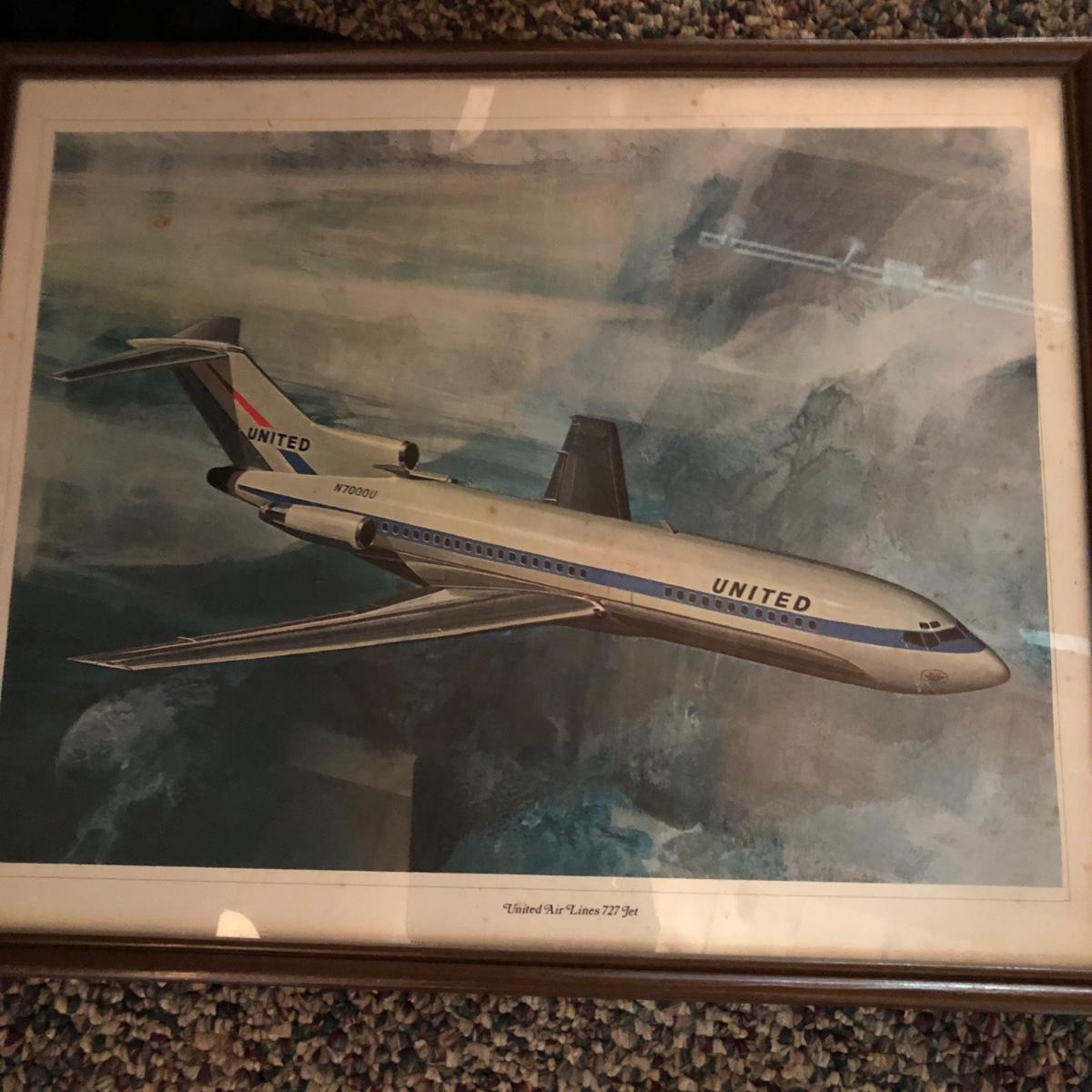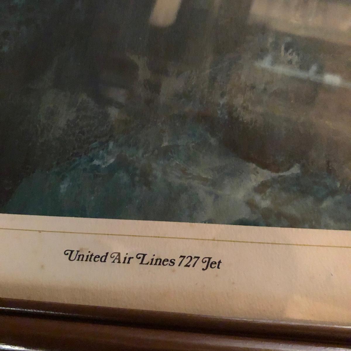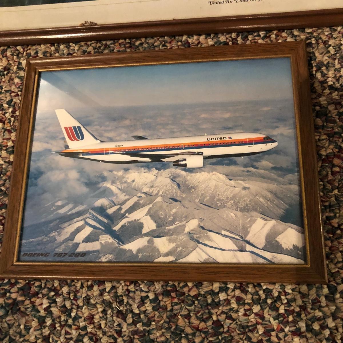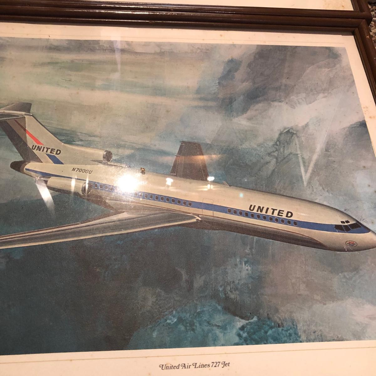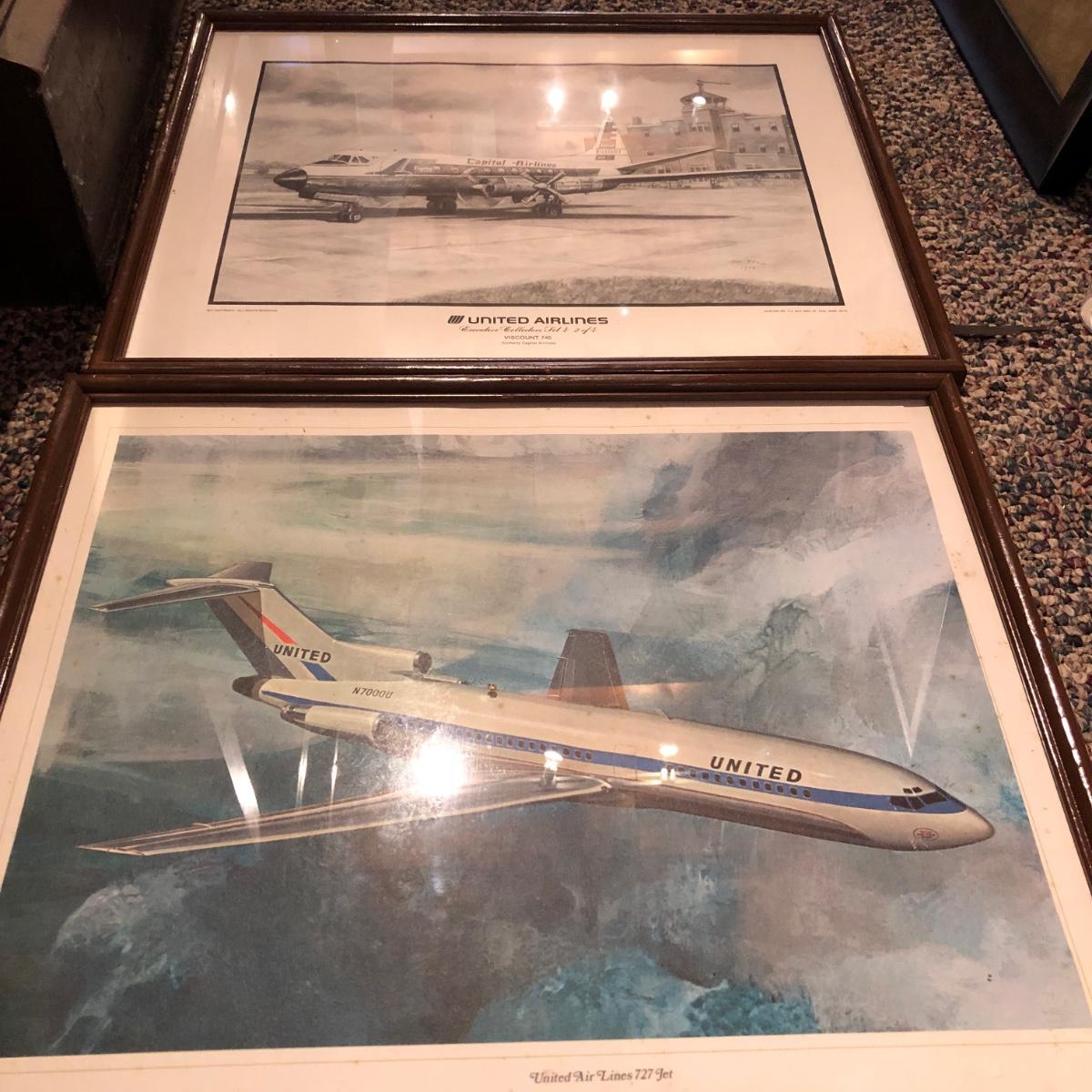 The two prints measure 21” x 17”. Both frames are identical and are made of wood. The United Airlines 727 jet is in color and the Viscount 745 is black and white. The third print is in color, has a wooden frame with glass and measures 12” x 9.5”. The toy Boeing 727 airplane is am metal and measures 5” long and 4.5” wide. Shipping Available.