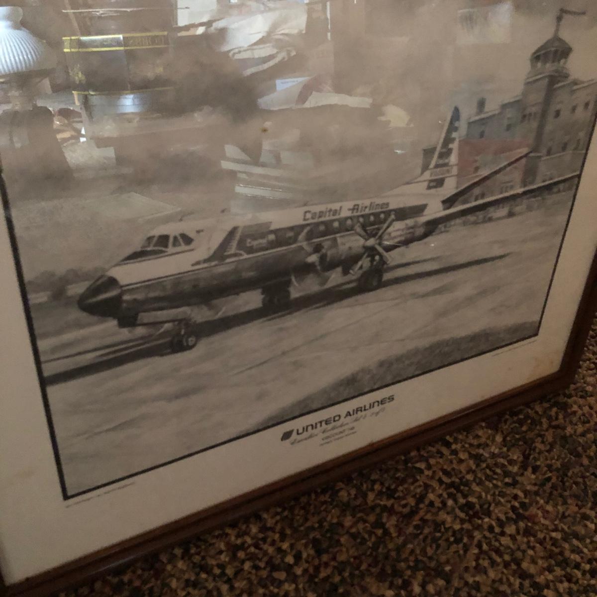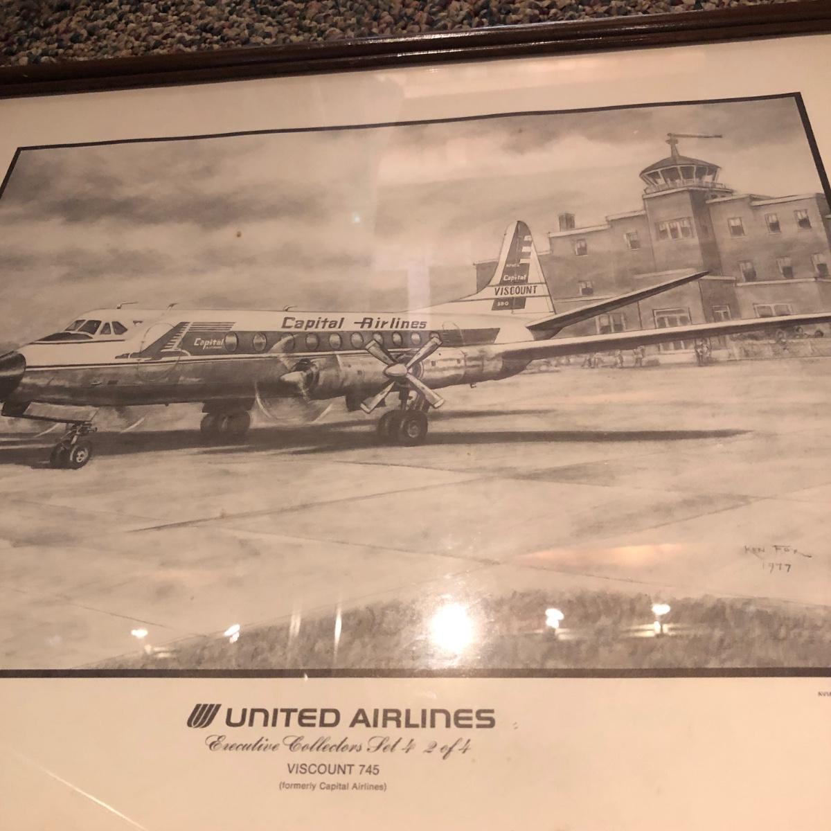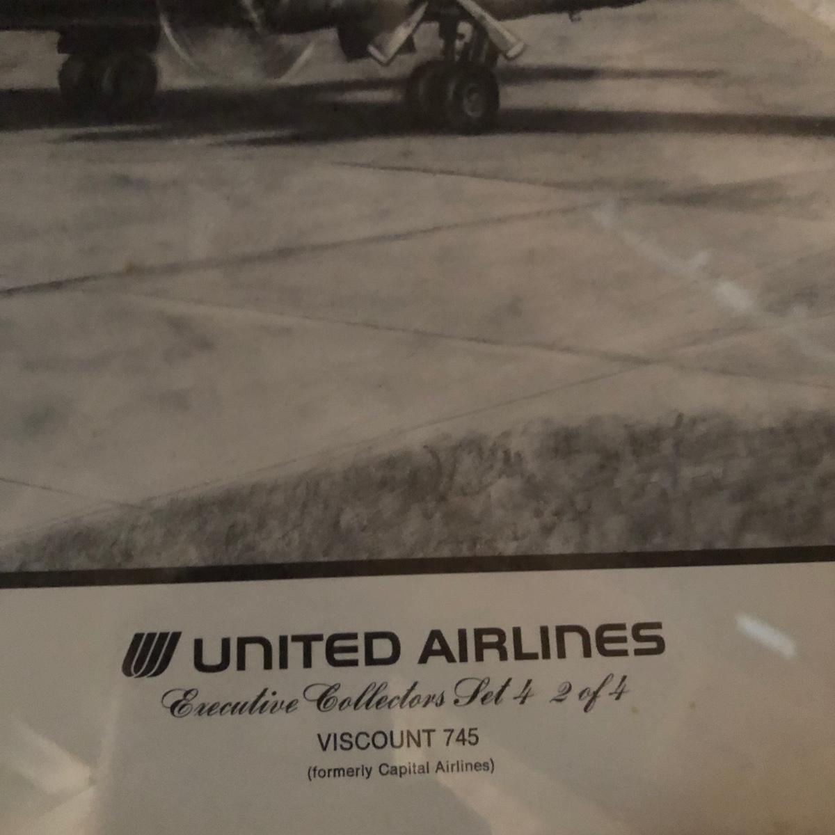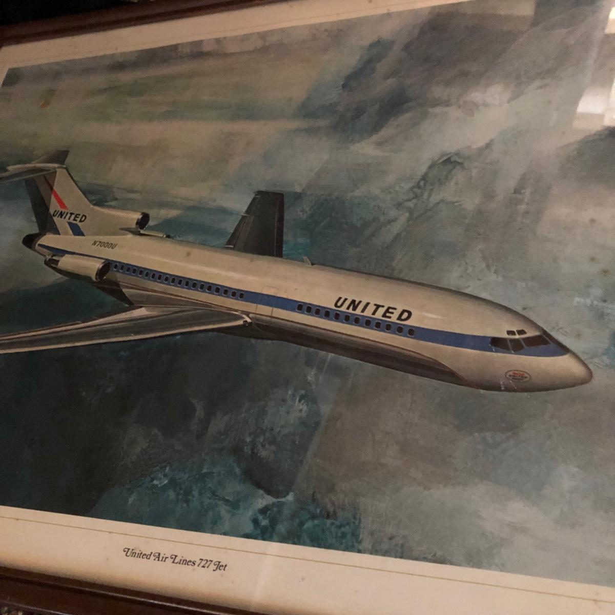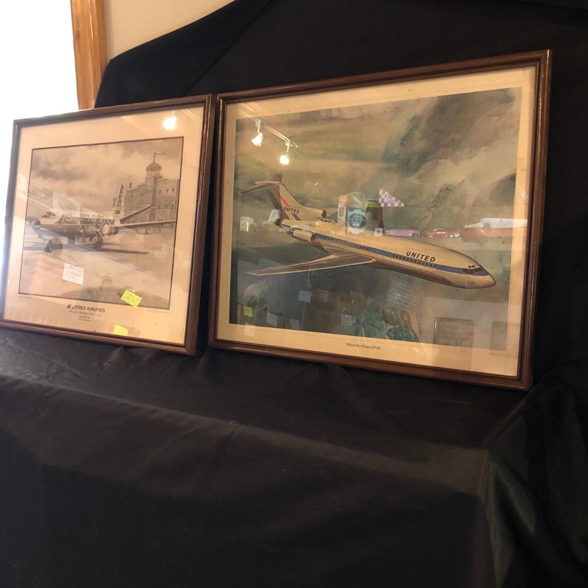 The two prints measure 21” x 17”. Both frames are identical and are made of wood. The United Airlines 727 jet is in color and the Viscount 745 is black and white. The third print is in color, has a wooden frame with glass and measures 12” x 9.5”. The toy Boeing 727 airplane is am metal and measures 5” long and 4.5” wide. Shipping Available.