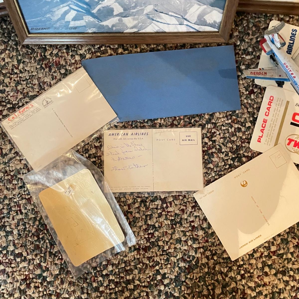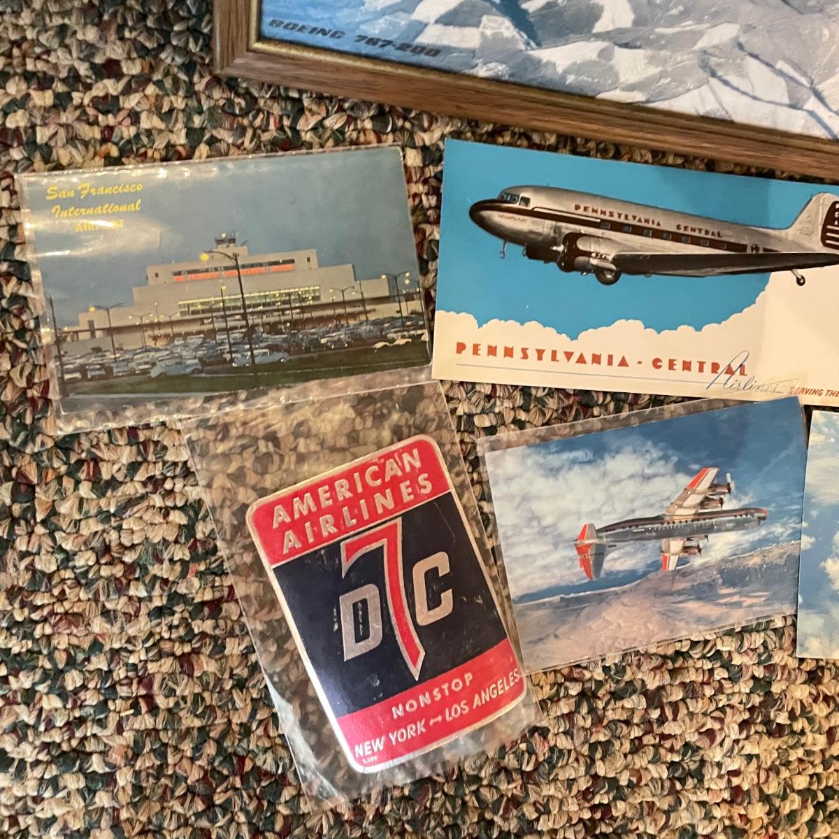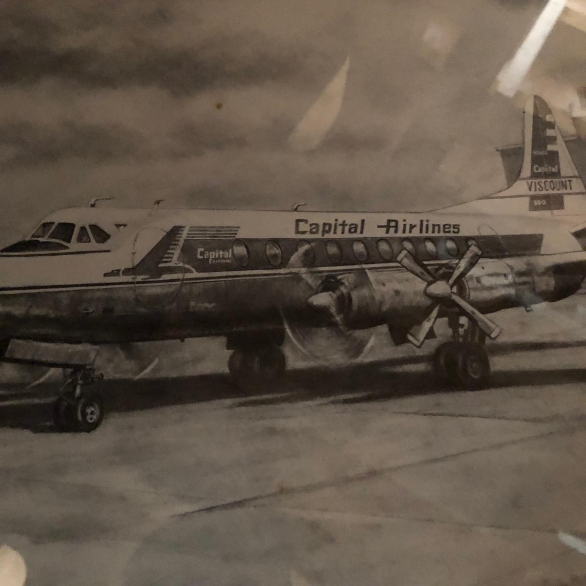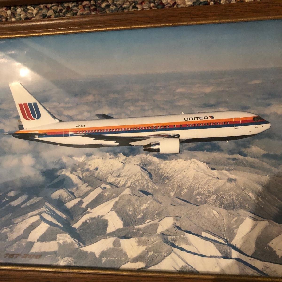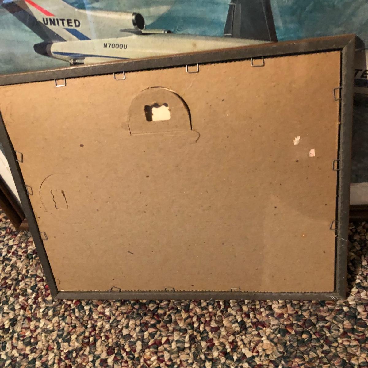 The two prints measure 21” x 17”. Both frames are identical and are made of wood. The United Airlines 727 jet is in color and the Viscount 745 is black and white. The third print is in color, has a wooden frame with glass and measures 12” x 9.5”. The toy Boeing 727 airplane is am metal and measures 5” long and 4.5” wide. Shipping Available.