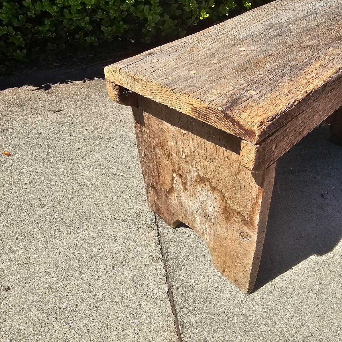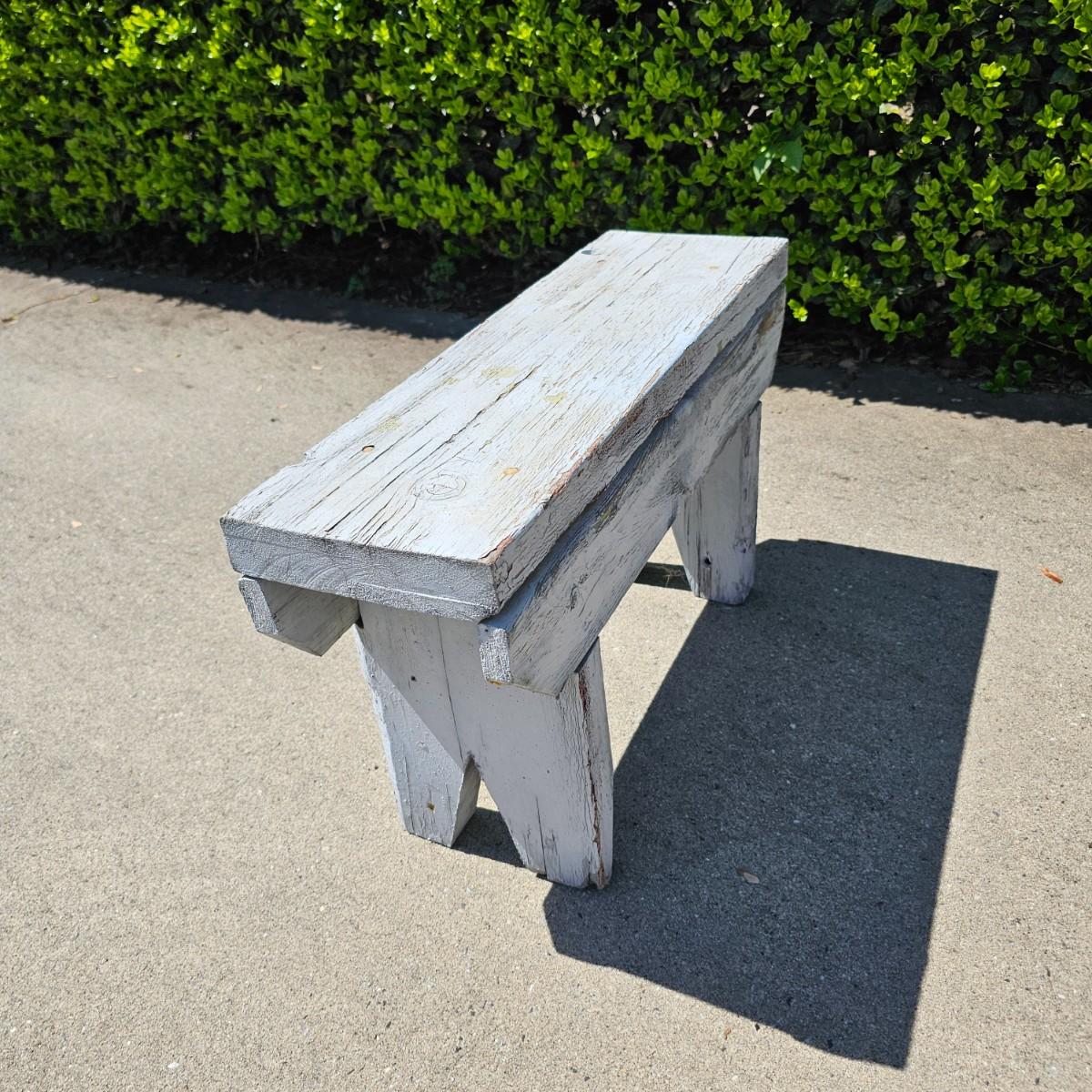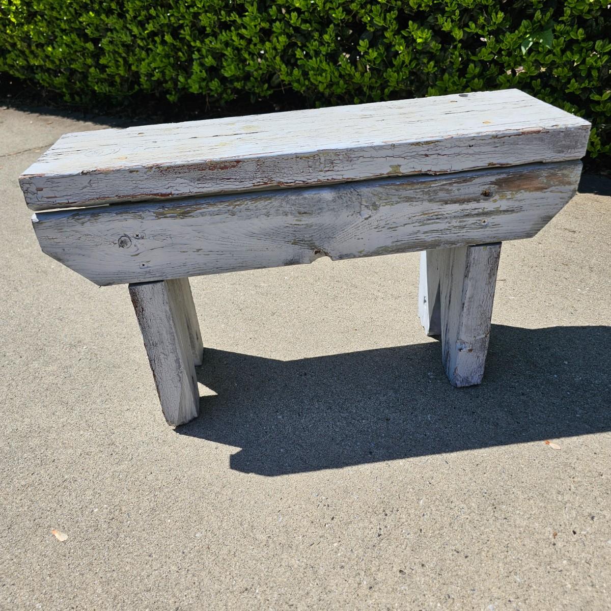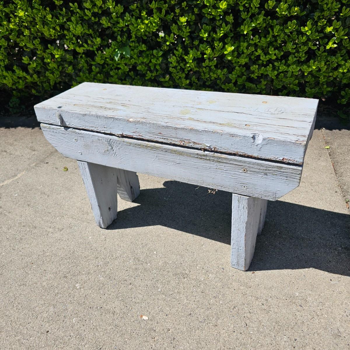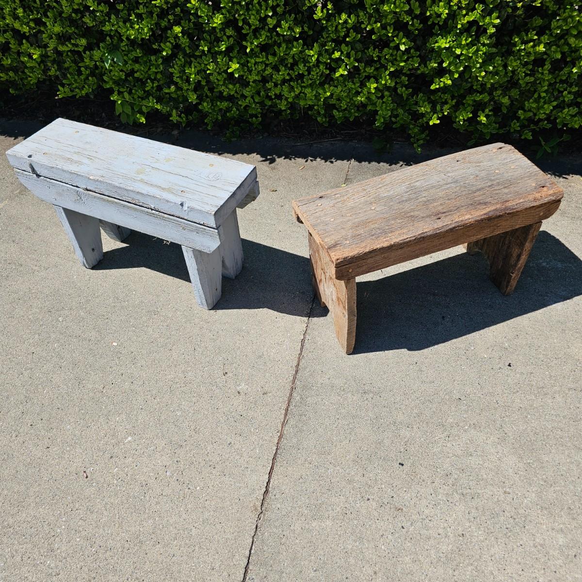 A pair of older handmade wooden stools. Useful for sitting or for display. Grey stool is 1 x and 2 x construction, measures 23" x 7.5" x 14"H. Some paint chipping. Natural stool appears to be barn wood, is 21" x 9.5" x 12"H. Normal wear and tear, small water stain. See photos for details. Local pickup only.