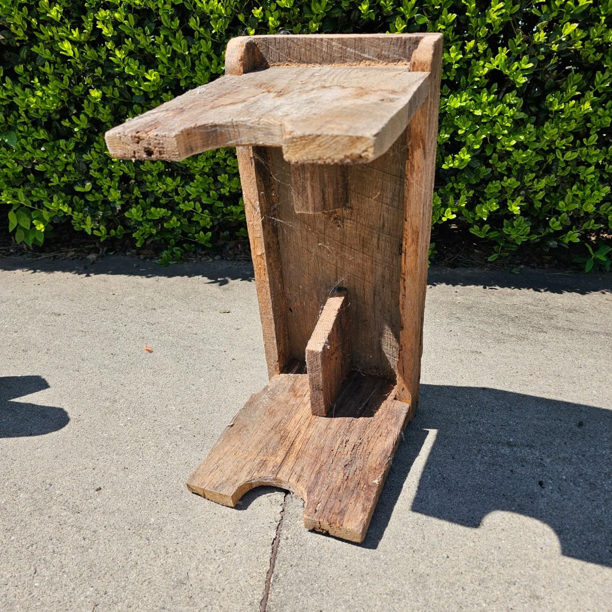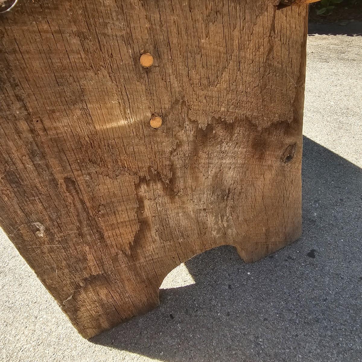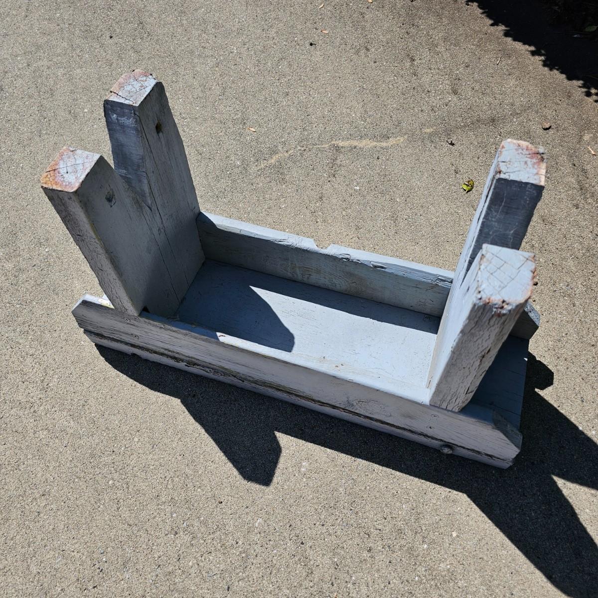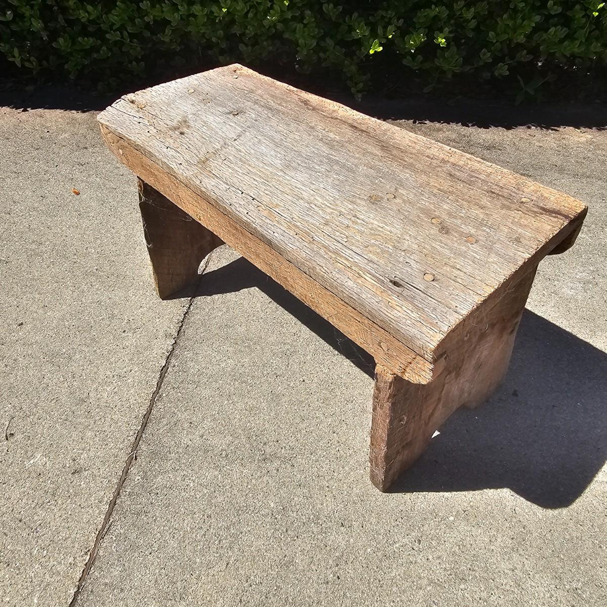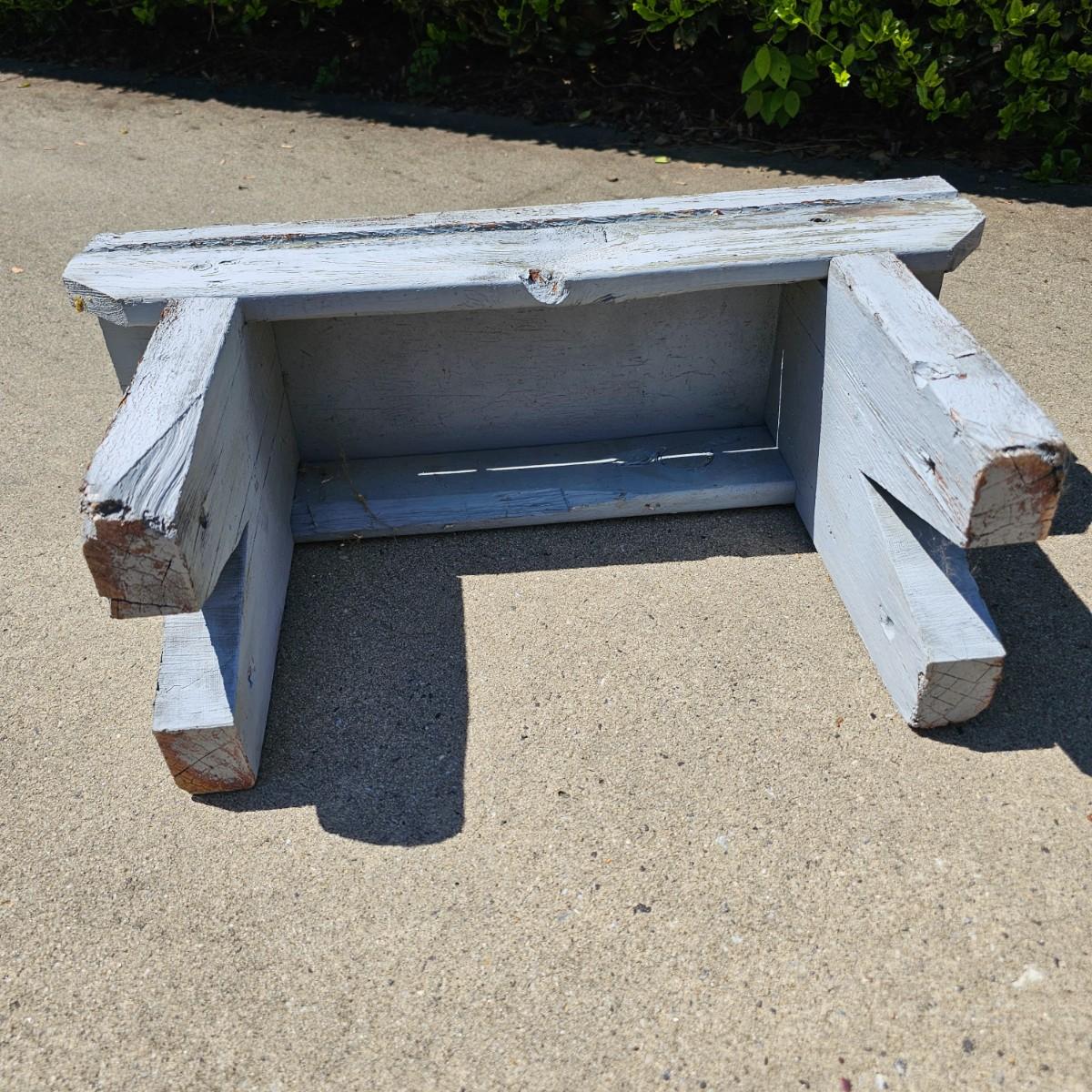 A pair of older handmade wooden stools. Useful for sitting or for display. Grey stool is 1 x and 2 x construction, measures 23" x 7.5" x 14"H. Some paint chipping. Natural stool appears to be barn wood, is 21" x 9.5" x 12"H. Normal wear and tear, small water stain. See photos for details. Local pickup only.