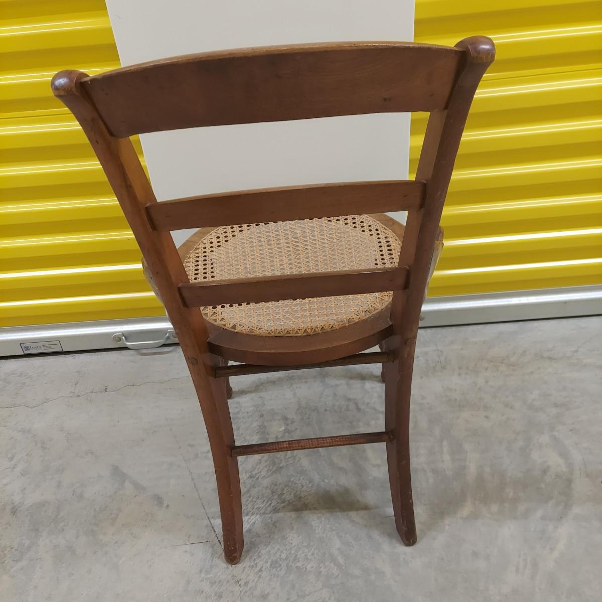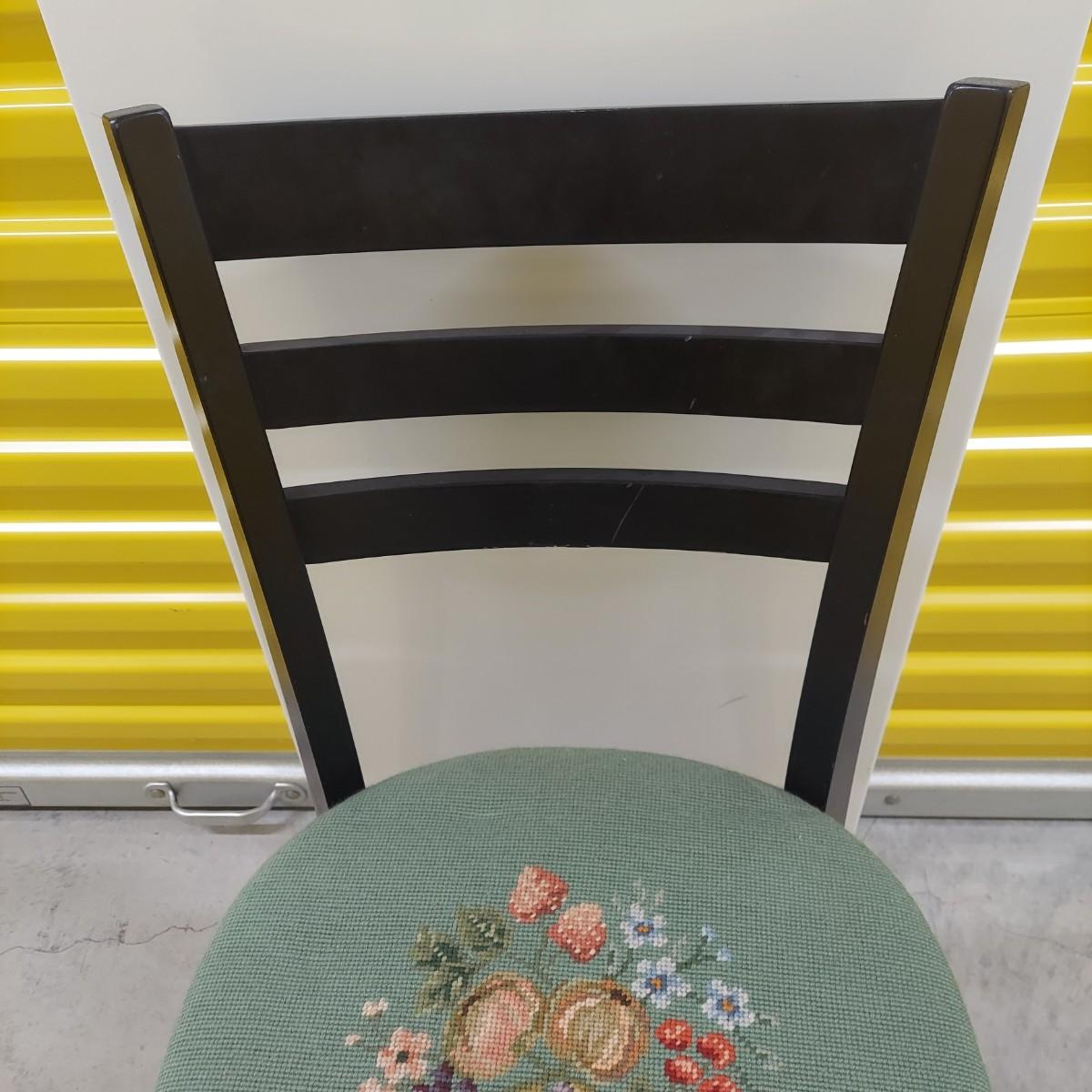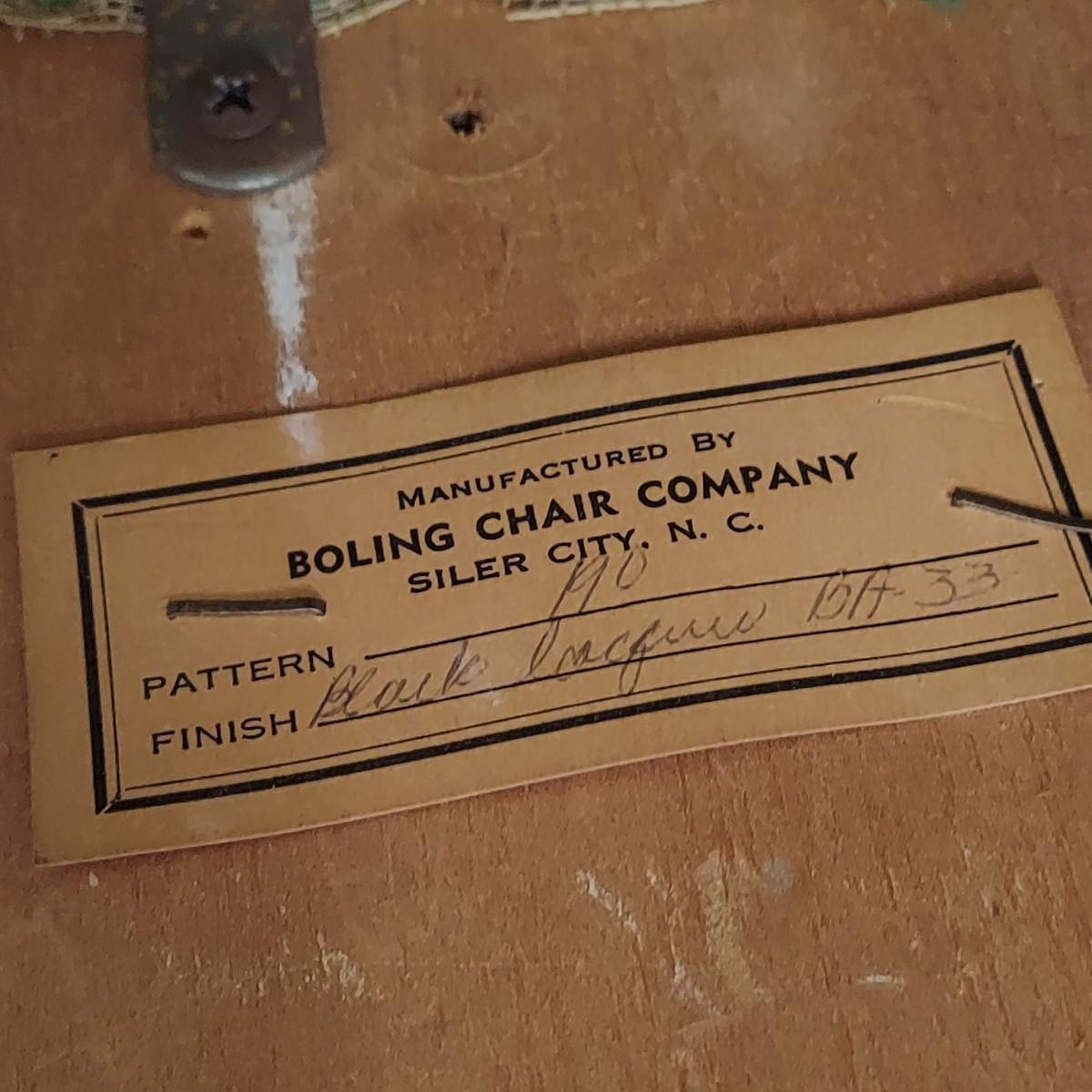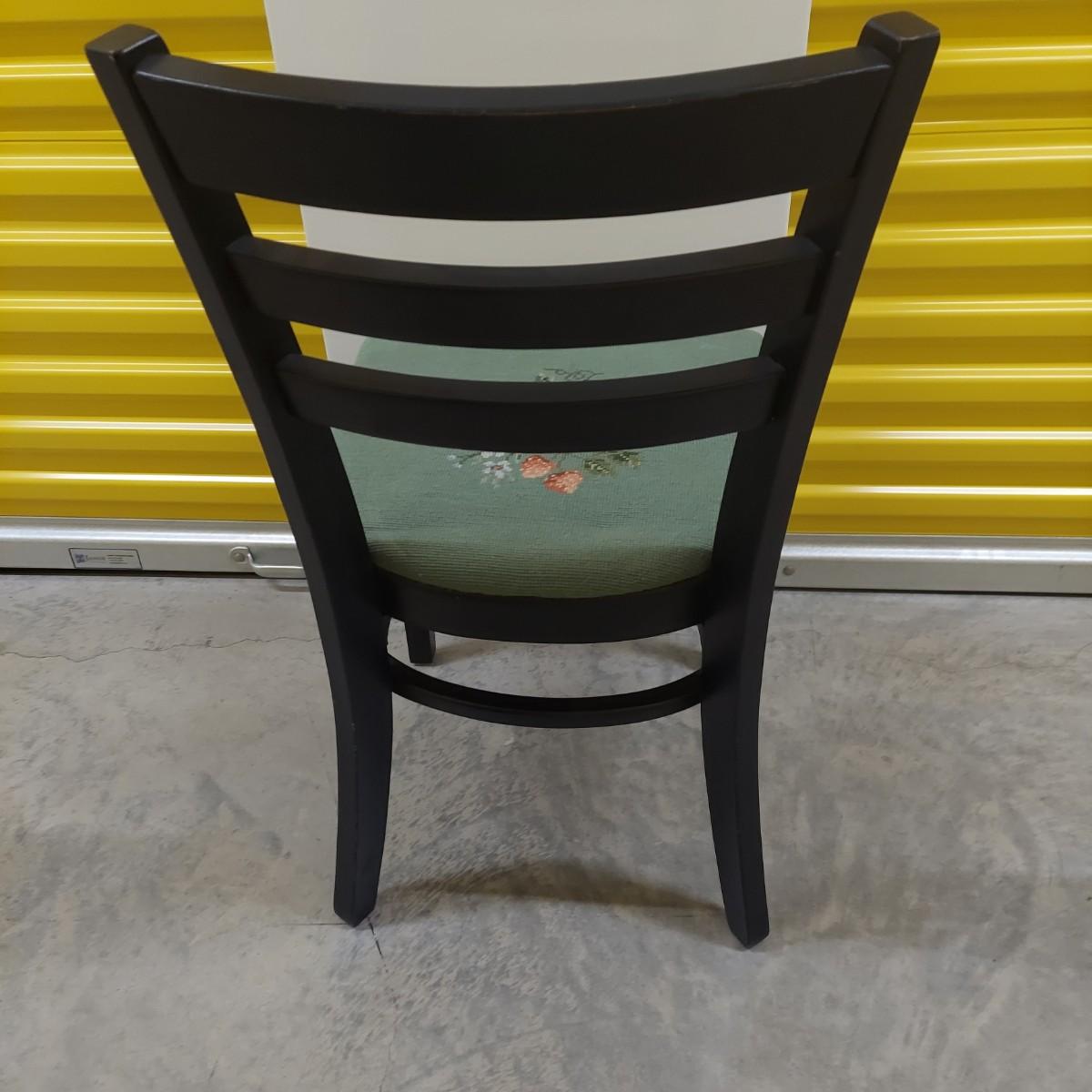 Lot includes two wooden accent chairs. An antique wooden ladder back chair with spindle legs and cane seat that measures 18” x 20” x 33"H with an 18” seat height. Also, a black wooden ladder back chair in a classic style with vintage needlepoint upholstered seat that has a "Boling Chair Company" label. It measures 16” x 17” x 32"H with an 18” seat height. The cane seat chair has been repaired. The needlepoint chair has some scratches. Please see photos for details. Local Pickup Only