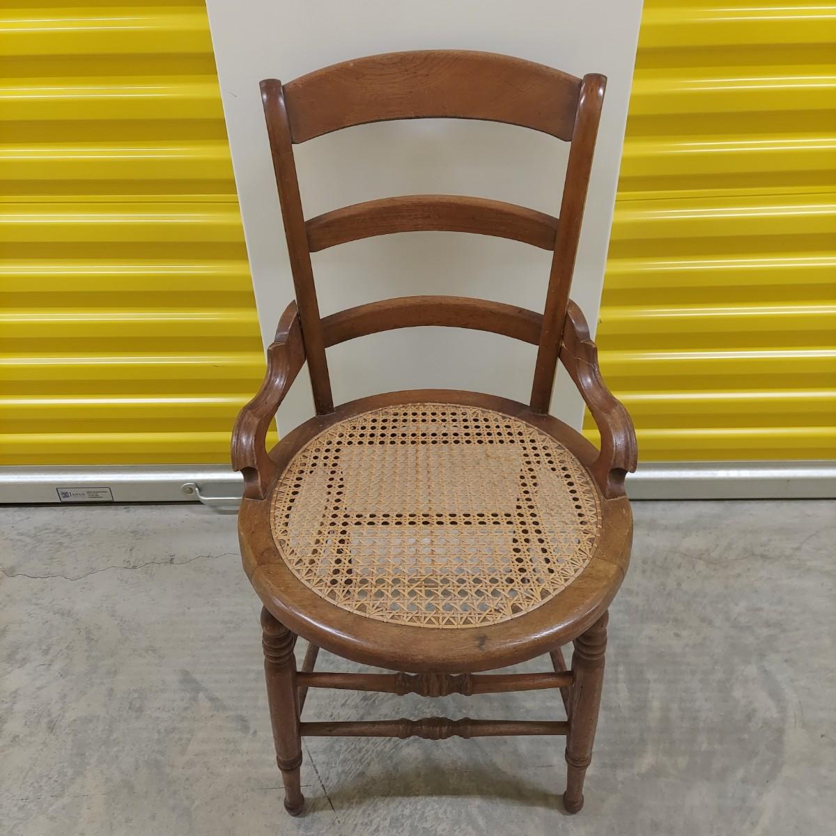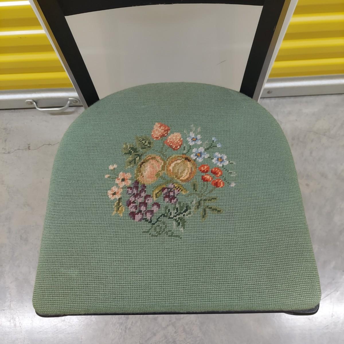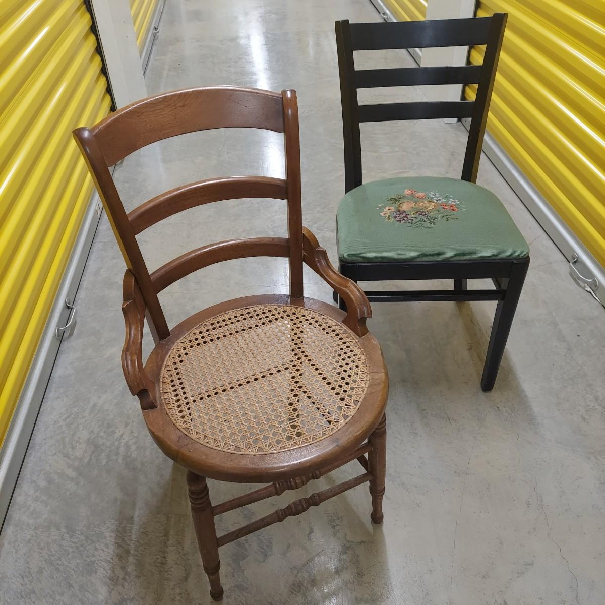 Lot includes two wooden accent chairs. An antique wooden ladder back chair with spindle legs and cane seat that measures 18” x 20” x 33"H with an 18” seat height. Also, a black wooden ladder back chair in a classic style with vintage needlepoint upholstered seat that has a "Boling Chair Company" label. It measures 16” x 17” x 32"H with an 18” seat height. The cane seat chair has been repaired. The needlepoint chair has some scratches. Please see photos for details. Local Pickup Only