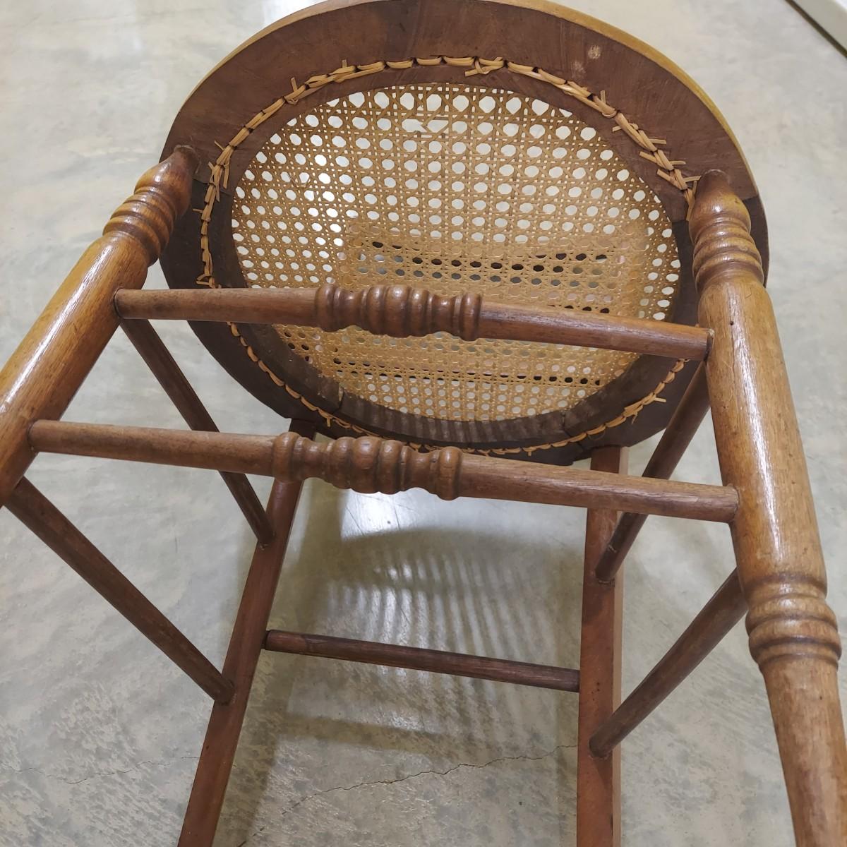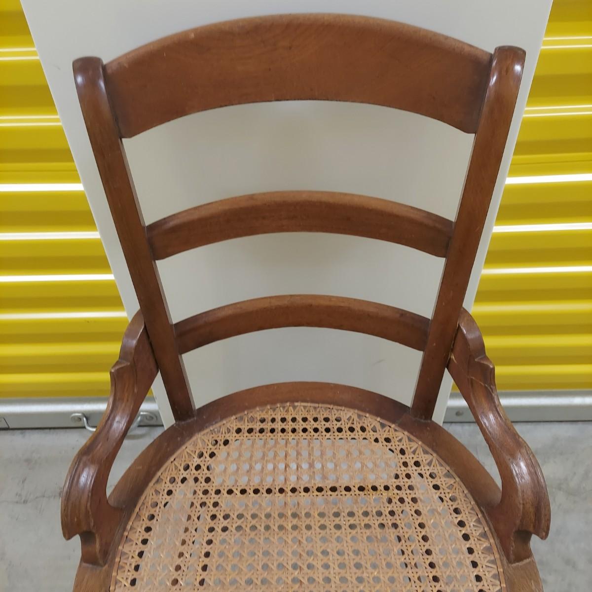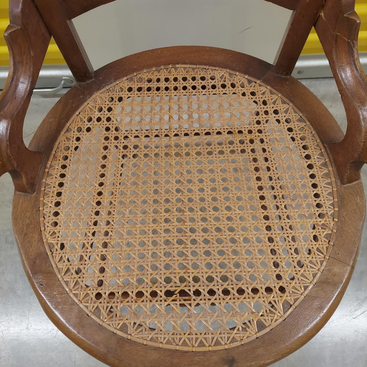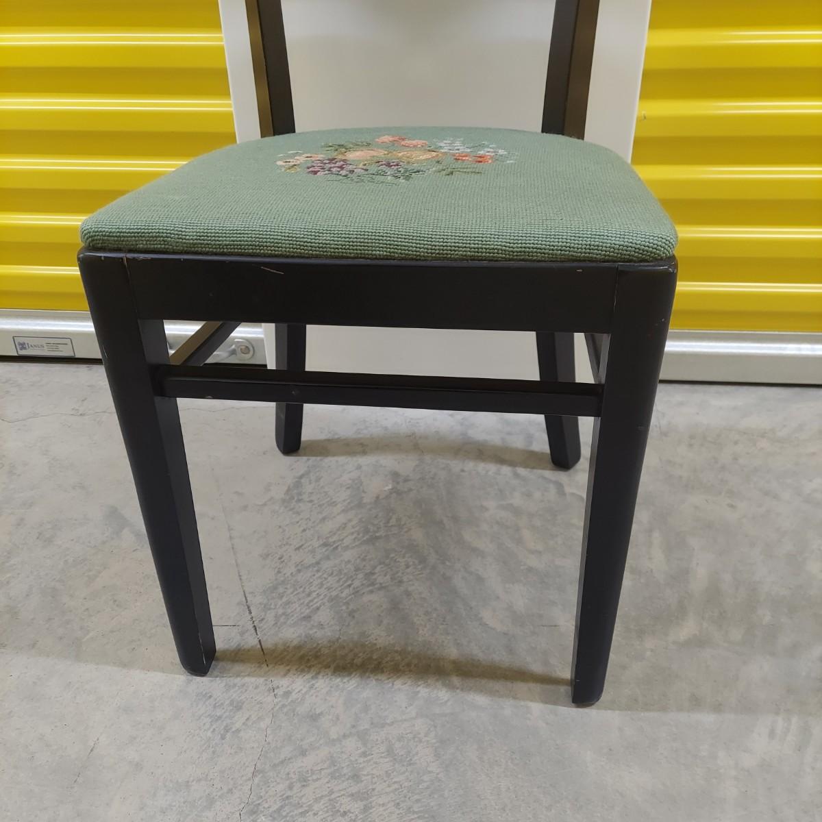 Lot includes two wooden accent chairs. An antique wooden ladder back chair with spindle legs and cane seat that measures 18” x 20” x 33"H with an 18” seat height. Also, a black wooden ladder back chair in a classic style with vintage needlepoint upholstered seat that has a "Boling Chair Company" label. It measures 16” x 17” x 32"H with an 18” seat height. The cane seat chair has been repaired. The needlepoint chair has some scratches. Please see photos for details. Local Pickup Only