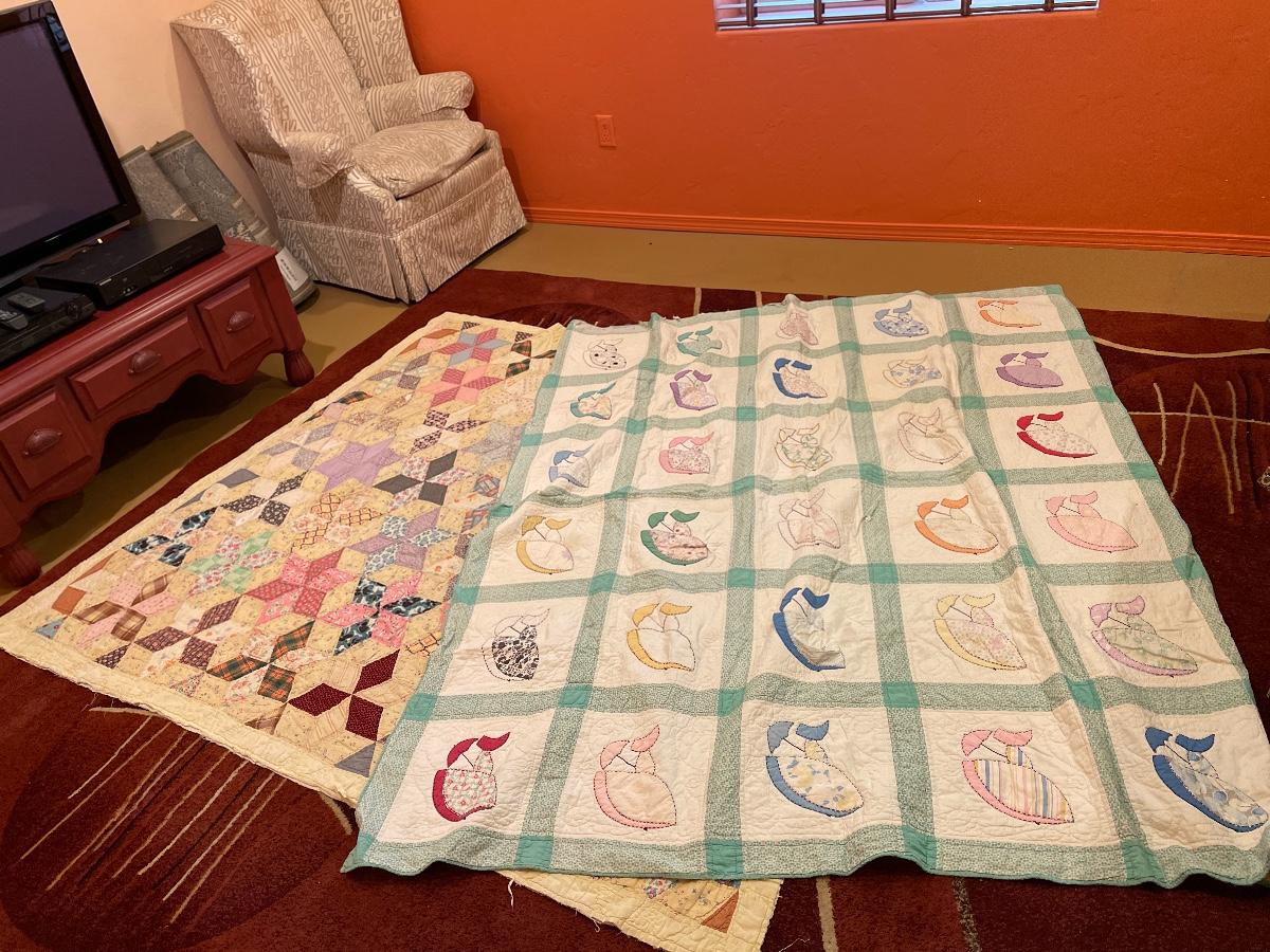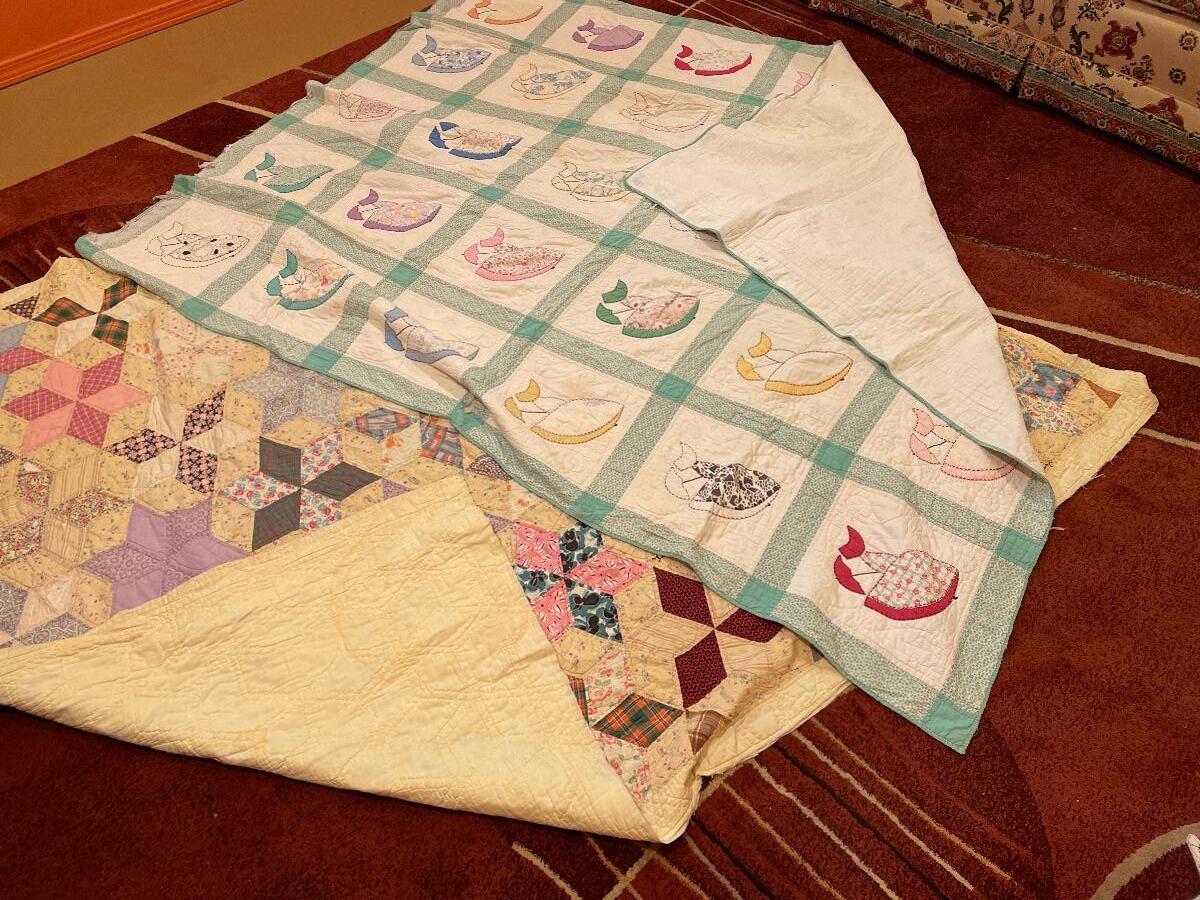 #357 Two Vintage Worn Quilts Patchwork & Umbrella Girl