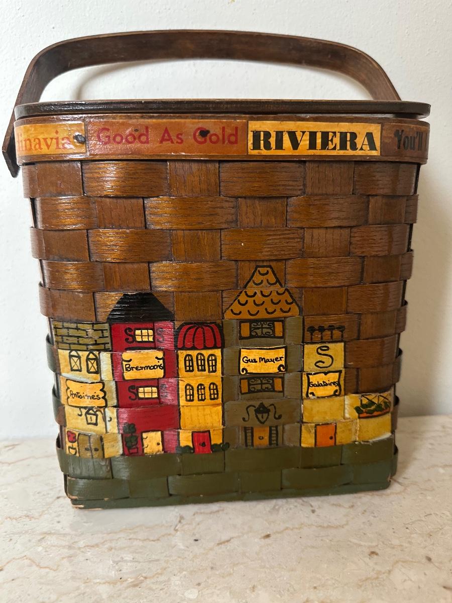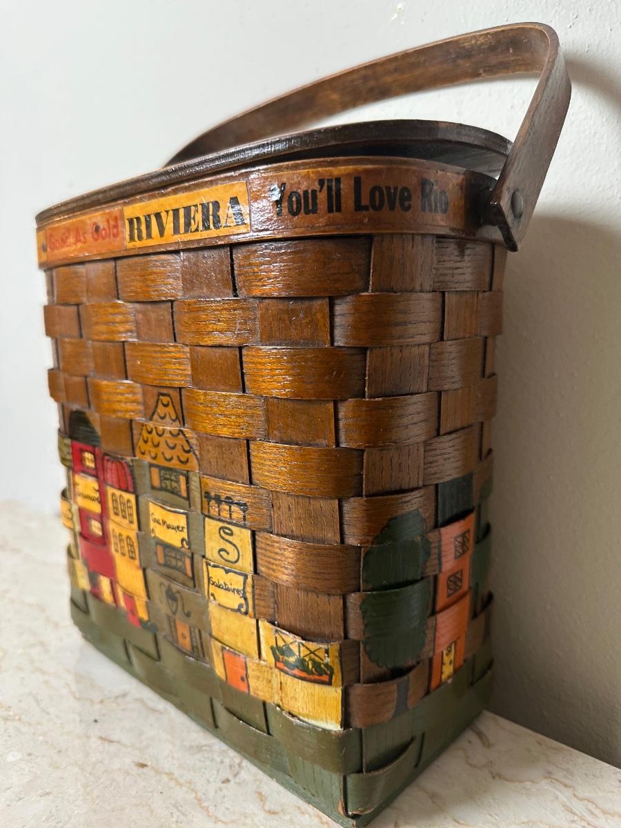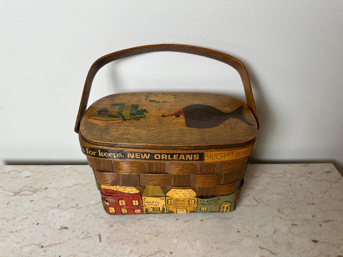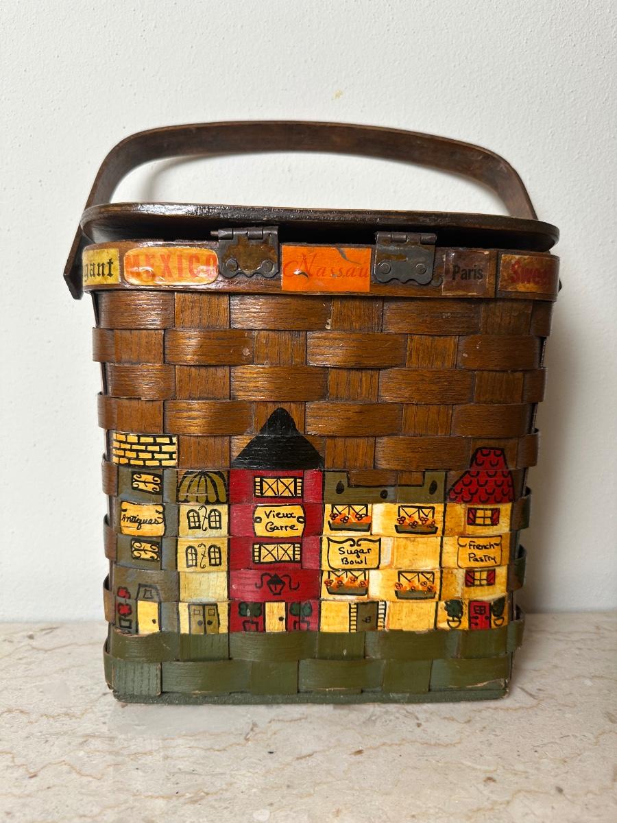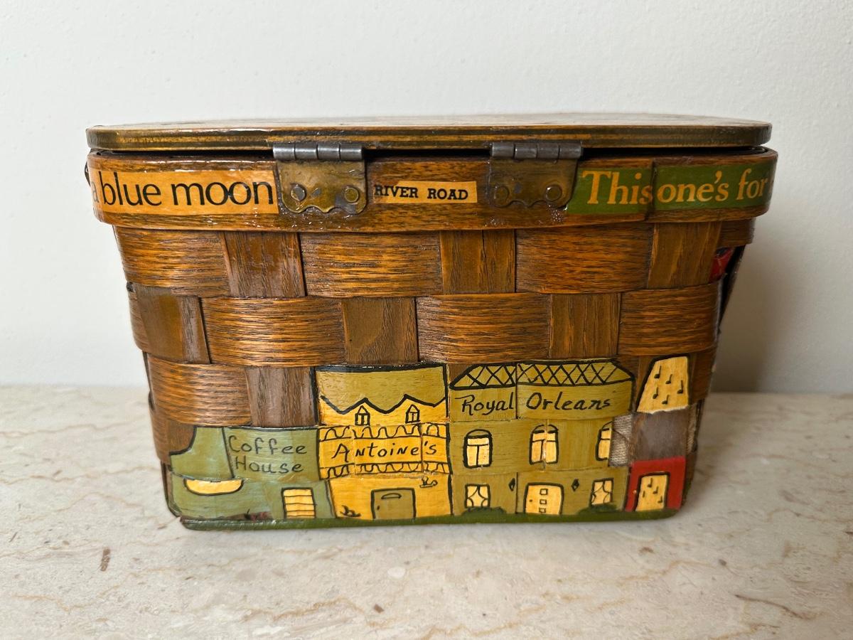 Two Vintage Woven Wooden Basket with Hand-Painted New Orleans Storefronts