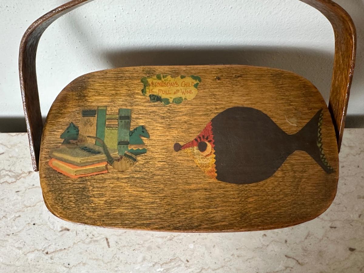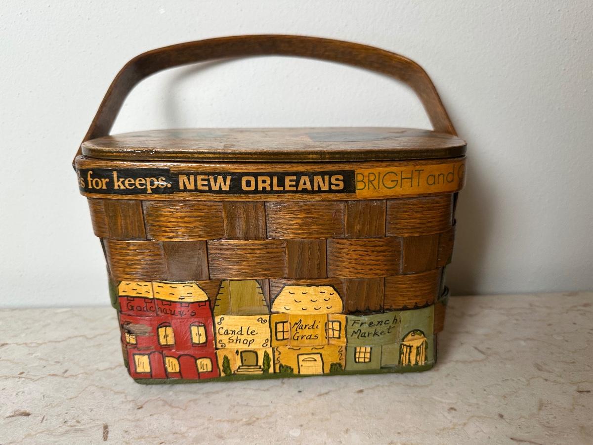 Two Vintage Woven Wooden Basket with Hand-Painted New Orleans Storefronts.