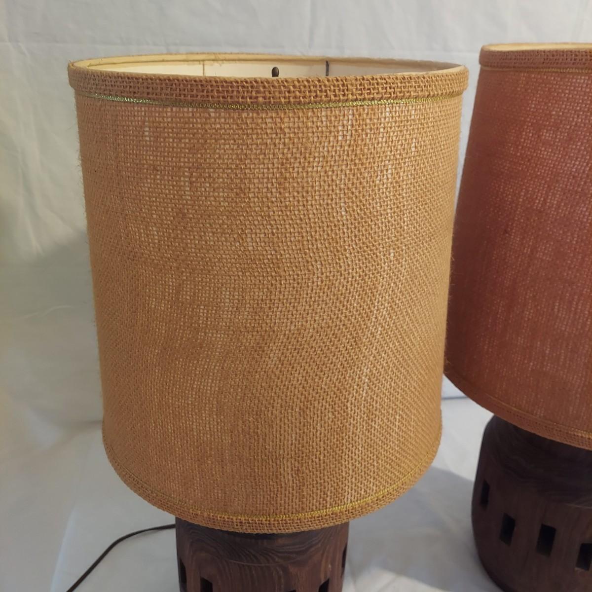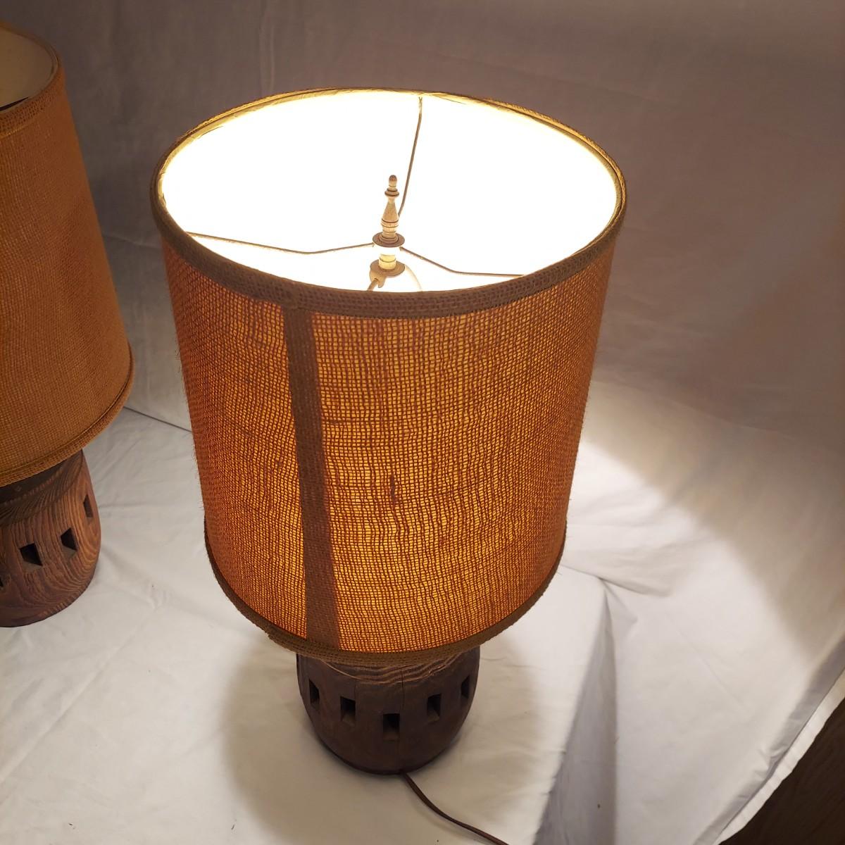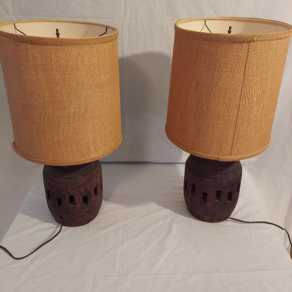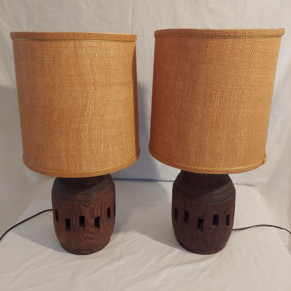 Two solid wood vintage lamps with cloth shades. Some condition issues with shades. Please see photos for details. Appears to be reproduction of antique wagon wheel hub. Each lamp is 24” tall with an approximate 7"D base. No visible markings or brand. Both lamps powered on when plugged in. Local Pickup Only