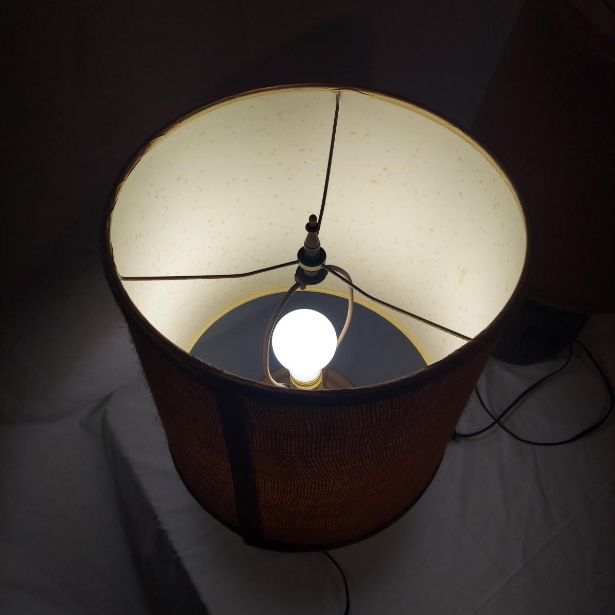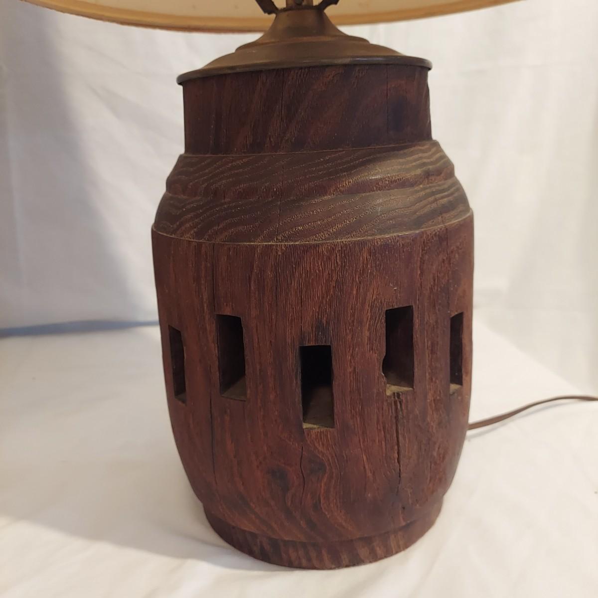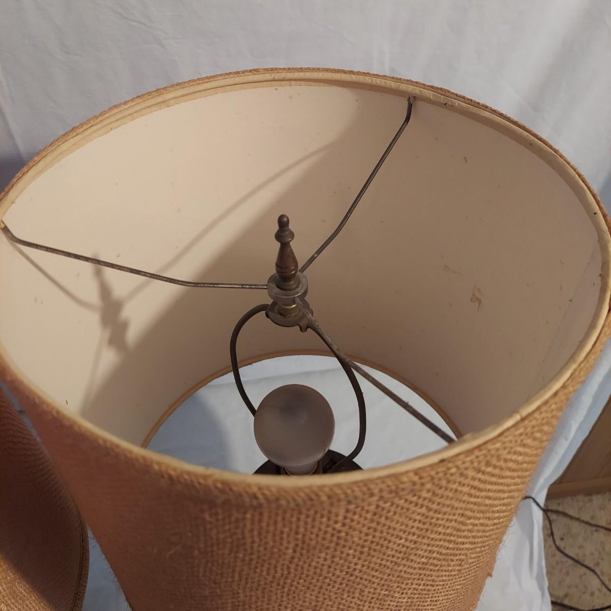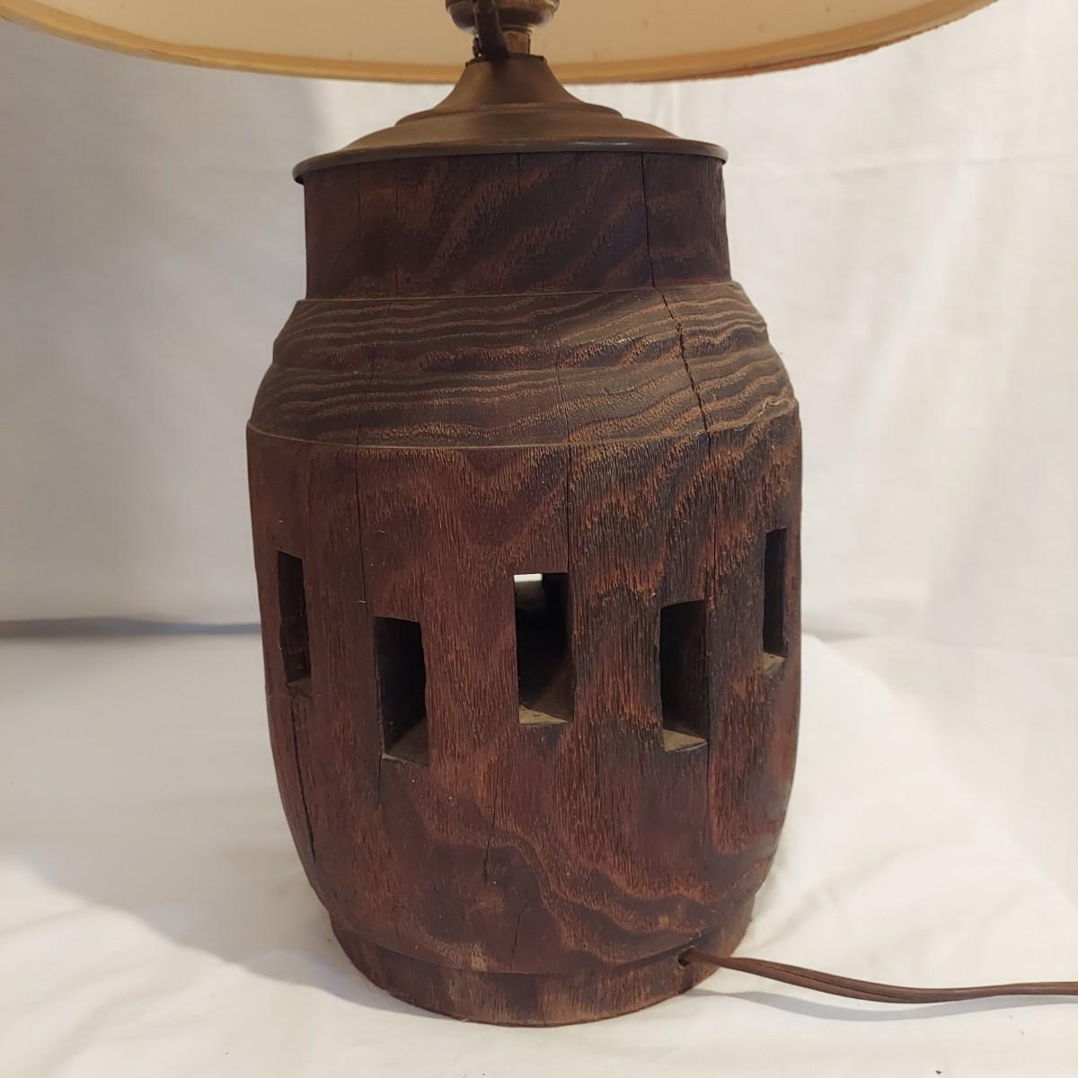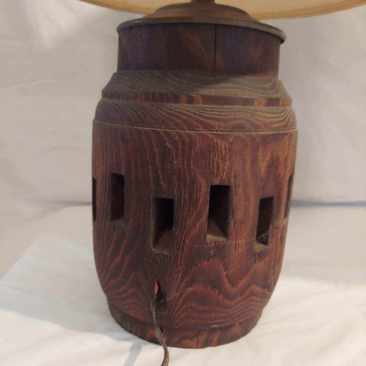 Two solid wood vintage lamps with cloth shades. Some condition issues with shades. Please see photos for details. Appears to be reproduction of antique wagon wheel hub. Each lamp is 24” tall with an approximate 7"D base. No visible markings or brand. Both lamps powered on when plugged in. Local Pickup Only
