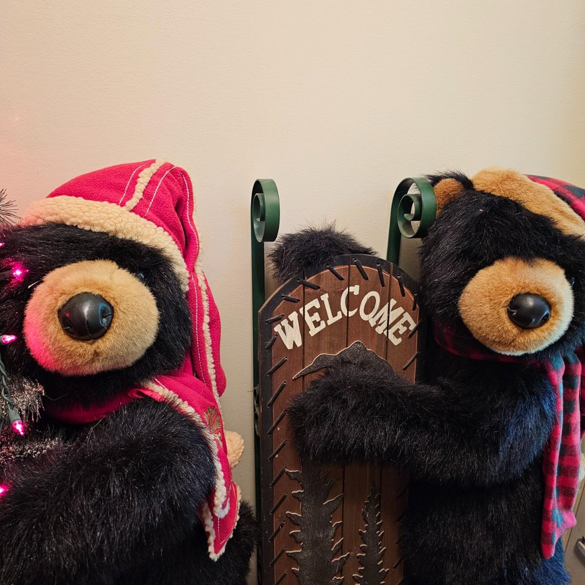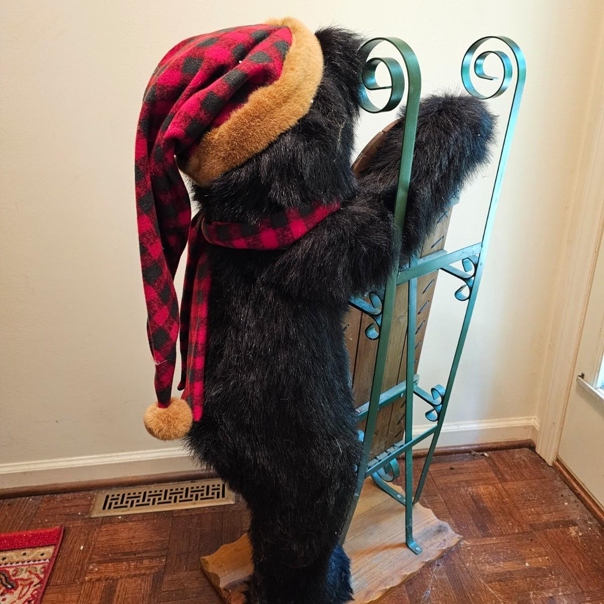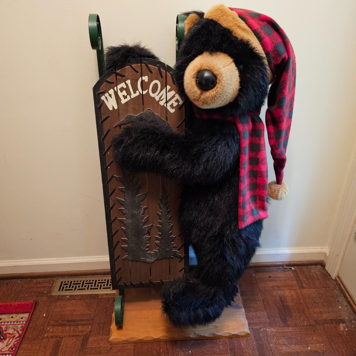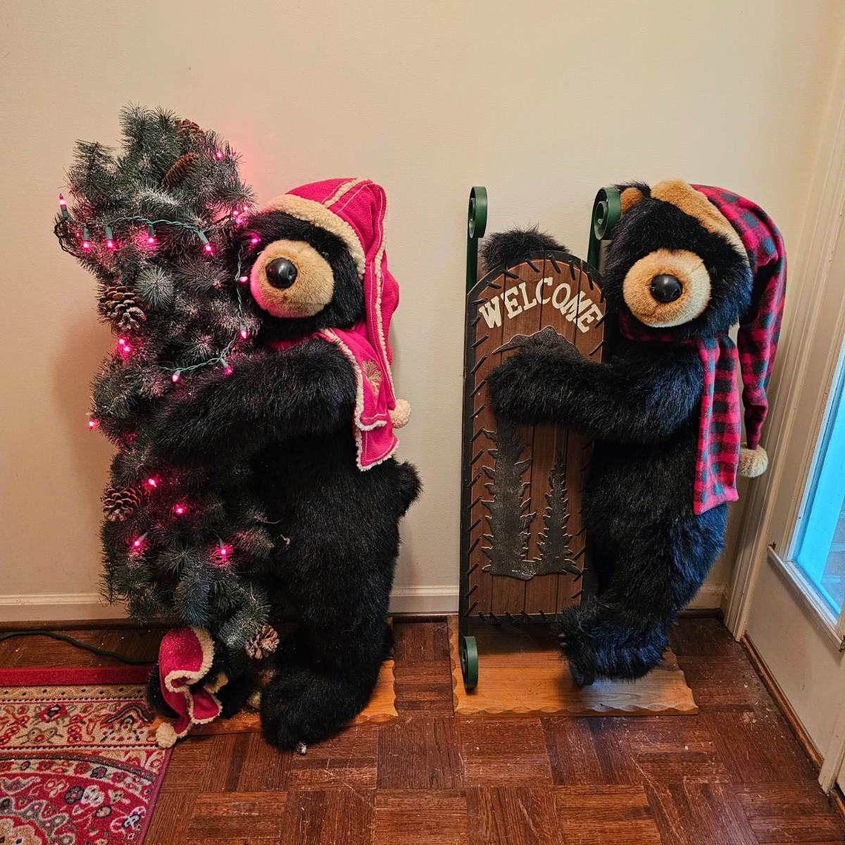 An adorable pair of soft plush bears in festive holiday attire to welcome your guests and liven your home. Bear with tree has red lights that work, and a small onlooker at the bottom of the tree. Felt hat and scarf keep him warm. Item measures 19" x 15" x 45"H, has scalloped edge wood base. Bear #2 holds a sled with a 'Welcome' greeting on it and pine trees below. Checkered hat and scarf, wood base and measures 19" x 15" x 40"H. Total cuteness! See photos for details. Local pickup only.