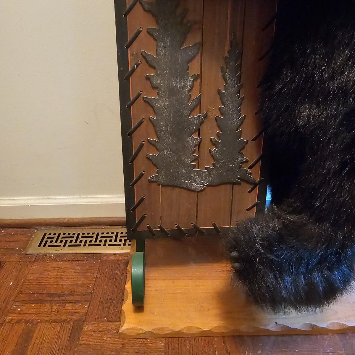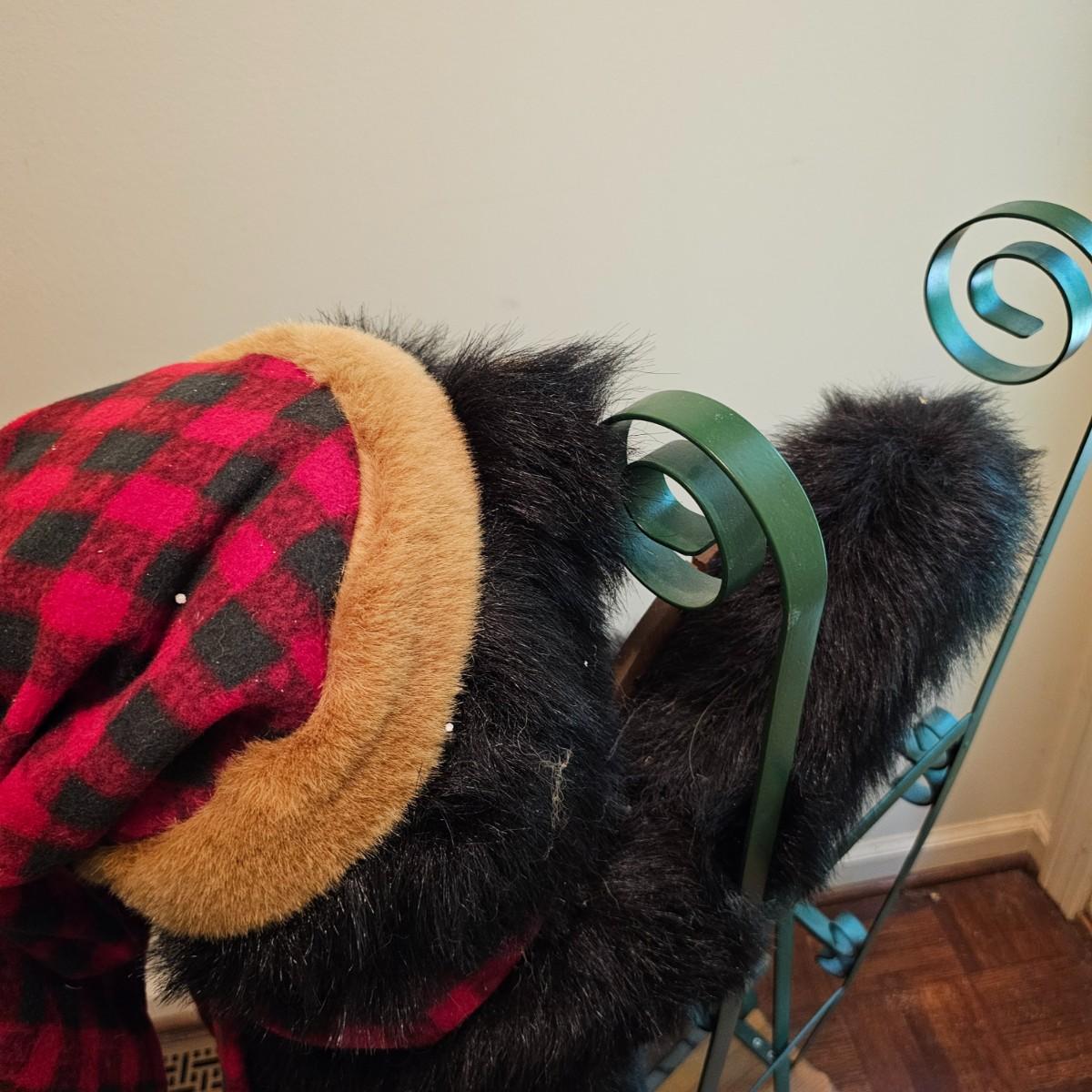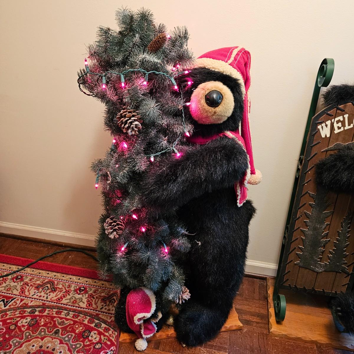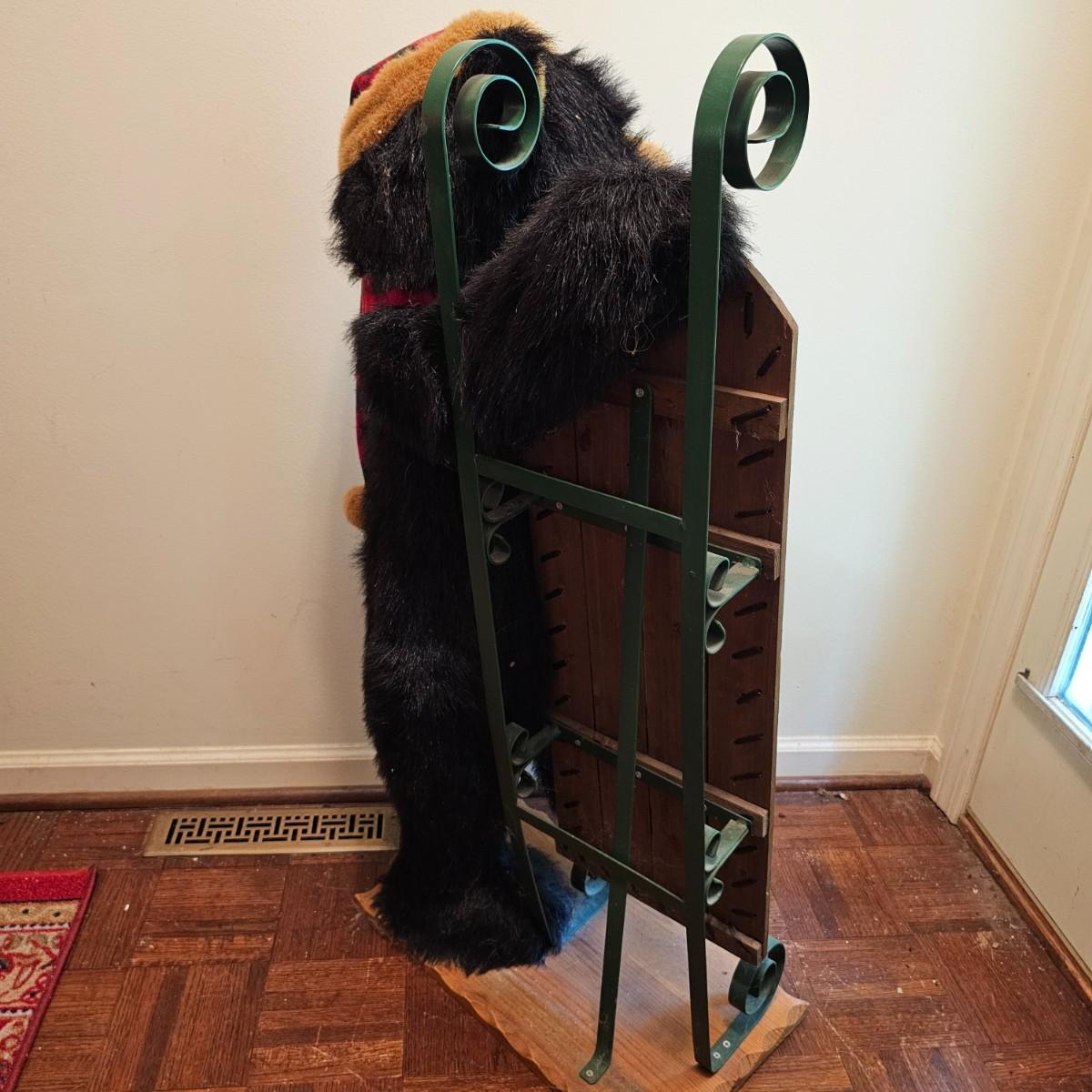 An adorable pair of soft plush bears in festive holiday attire to welcome your guests and liven your home. Bear with tree has red lights that work, and a small onlooker at the bottom of the tree. Felt hat and scarf keep him warm. Item measures 19" x 15" x 45"H, has scalloped edge wood base. Bear #2 holds a sled with a 'Welcome' greeting on it and pine trees below. Checkered hat and scarf, wood base and measures 19" x 15" x 40"H. Total cuteness! See photos for details. Local pickup only.