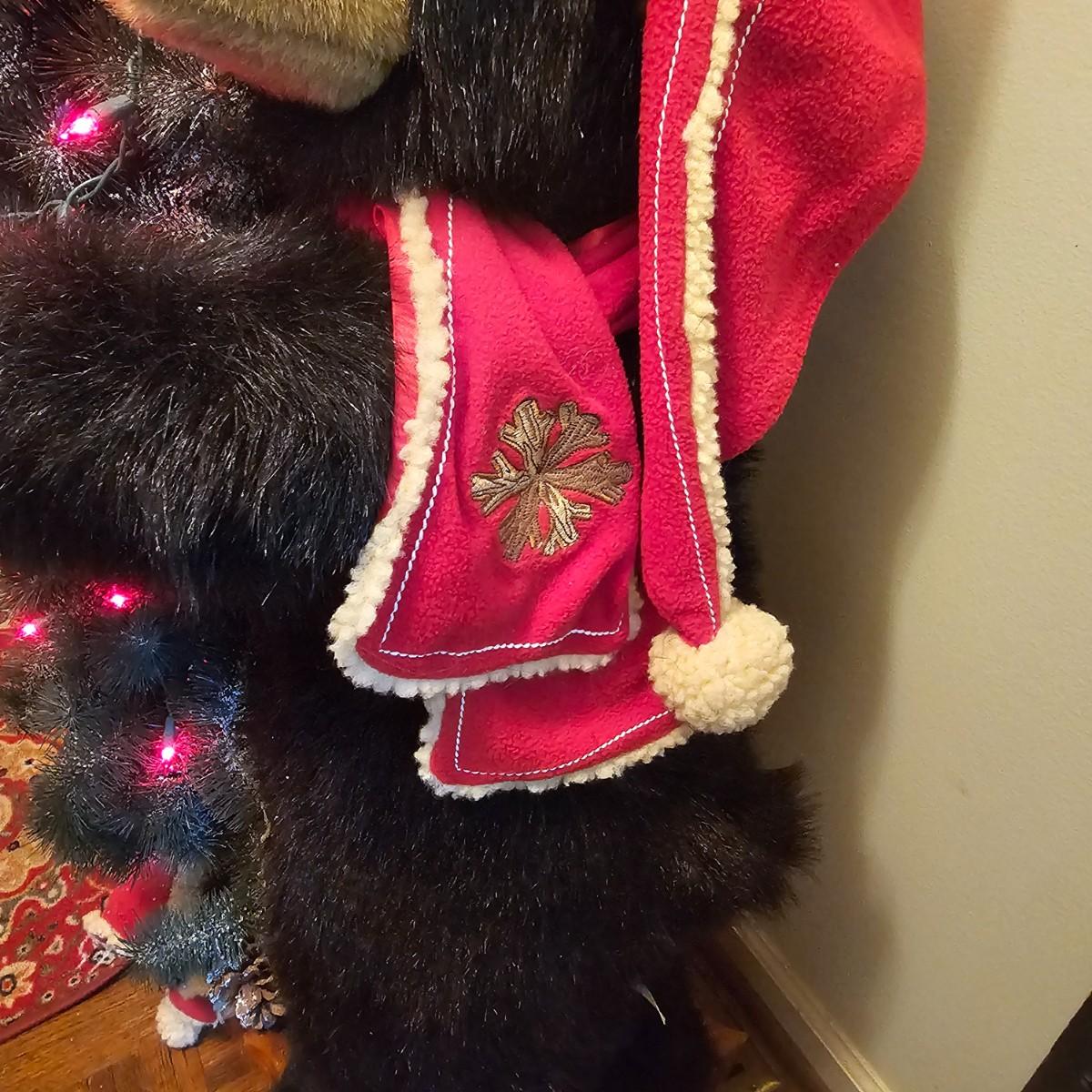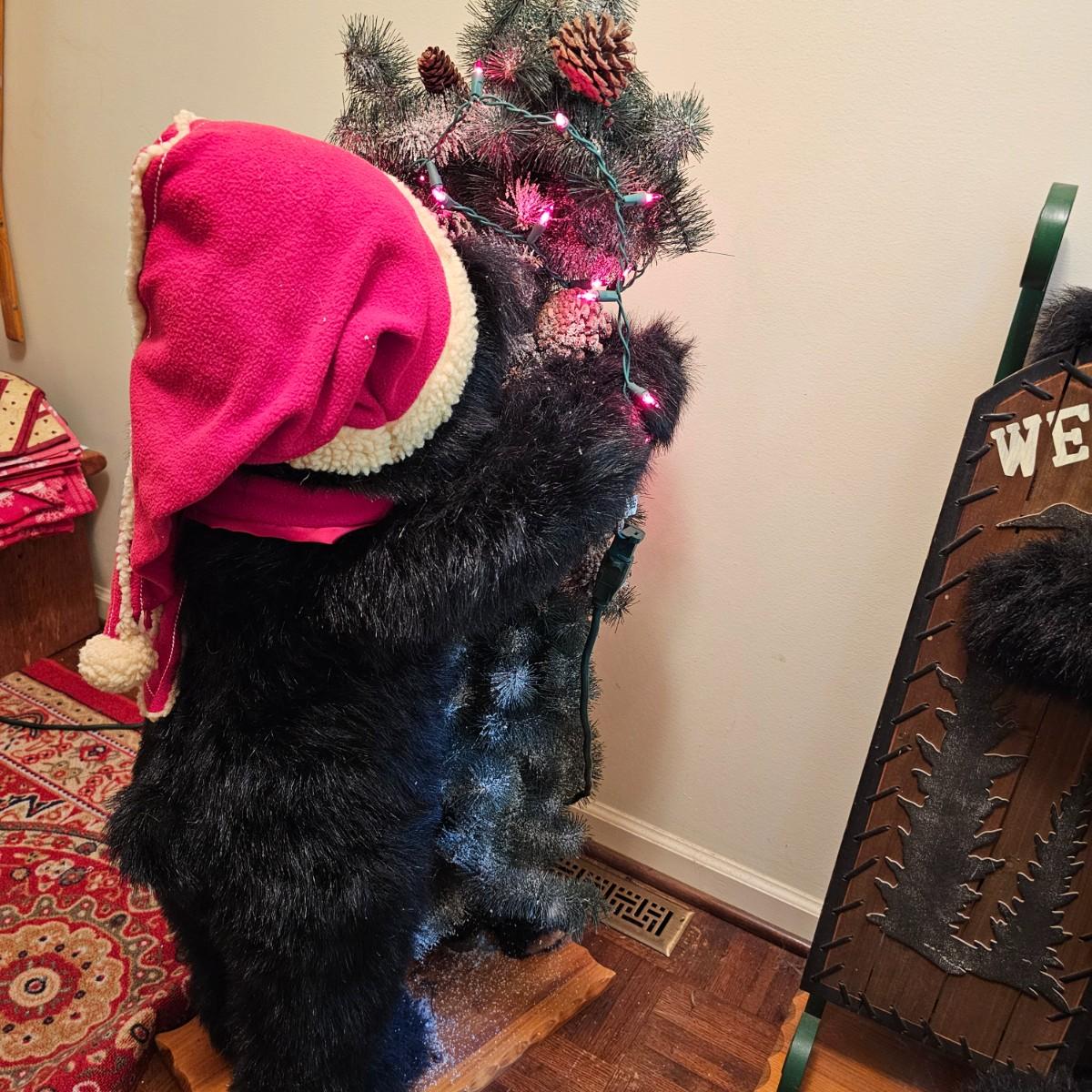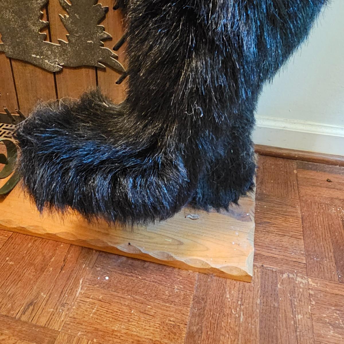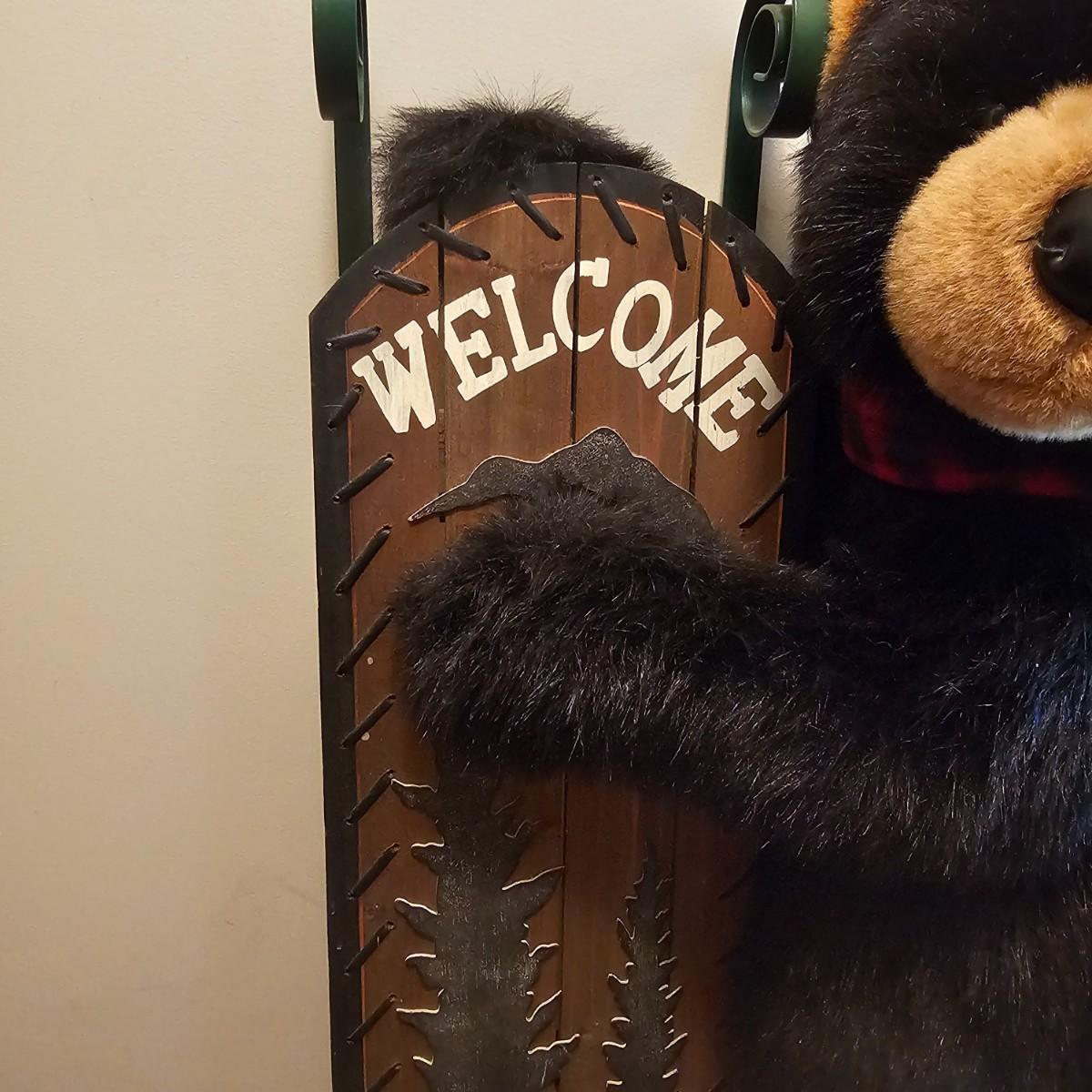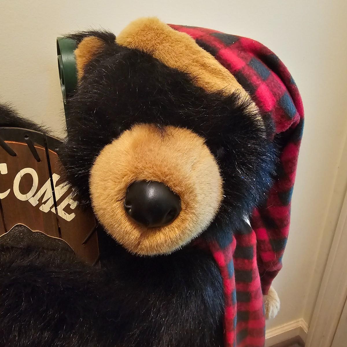 An adorable pair of soft plush bears in festive holiday attire to welcome your guests and liven your home. Bear with tree has red lights that work, and a small onlooker at the bottom of the tree. Felt hat and scarf keep him warm. Item measures 19" x 15" x 45"H, has scalloped edge wood base. Bear #2 holds a sled with a 'Welcome' greeting on it and pine trees below. Checkered hat and scarf, wood base and measures 19" x 15" x 40"H. Total cuteness! See photos for details. Local pickup only.