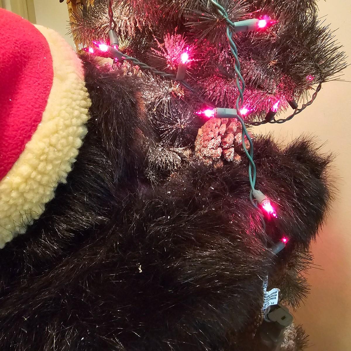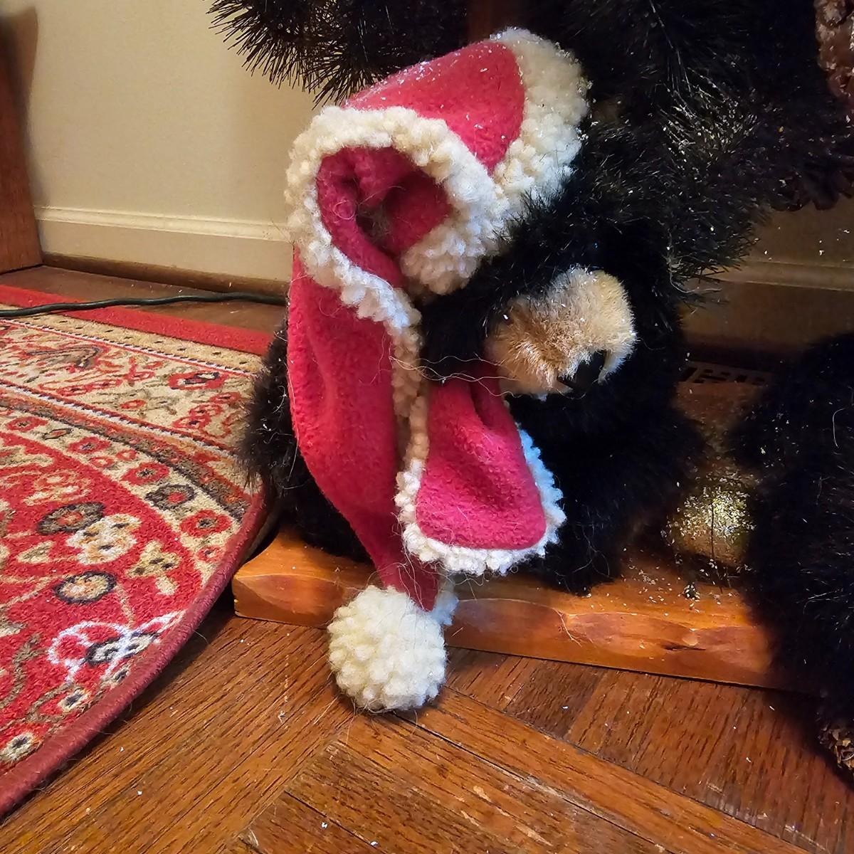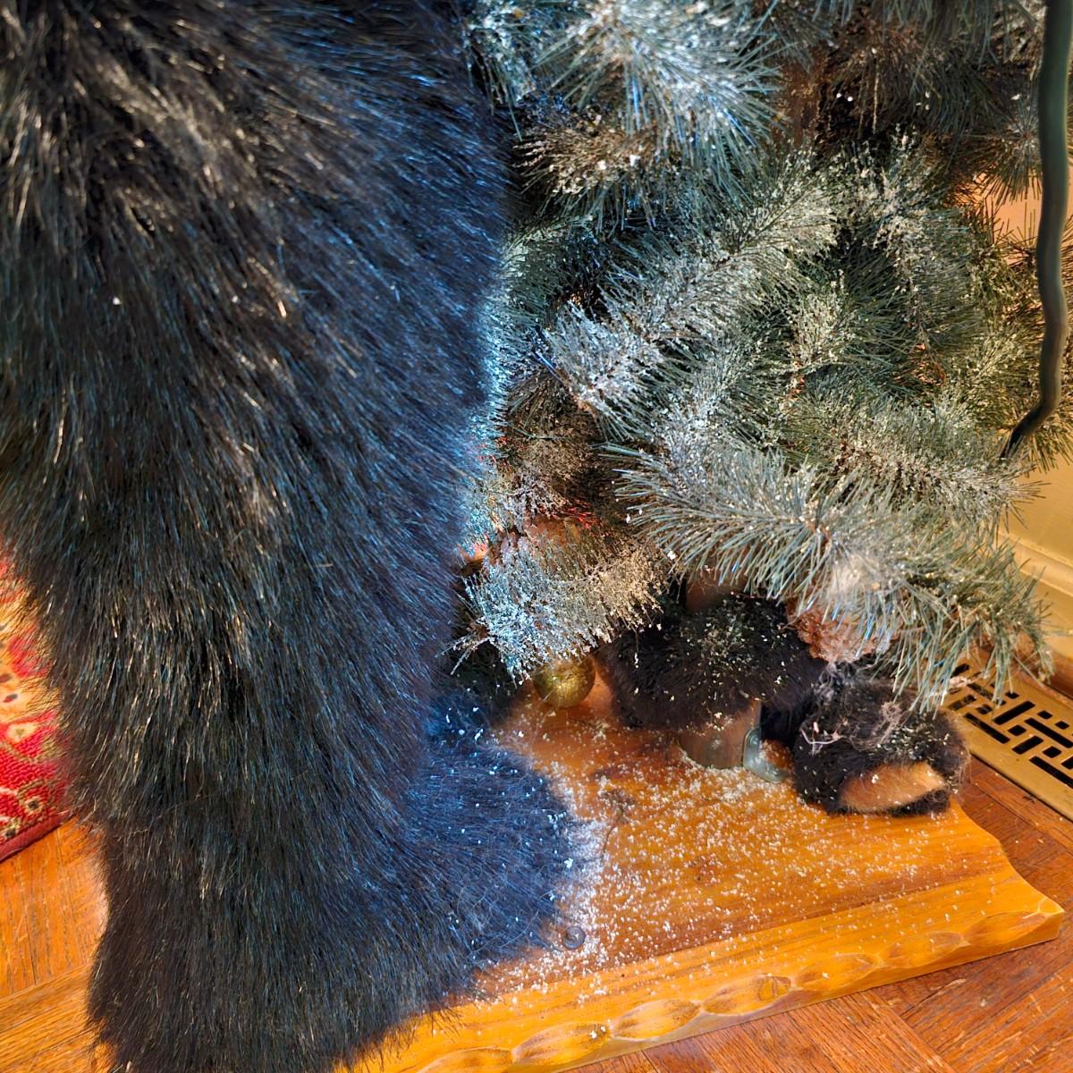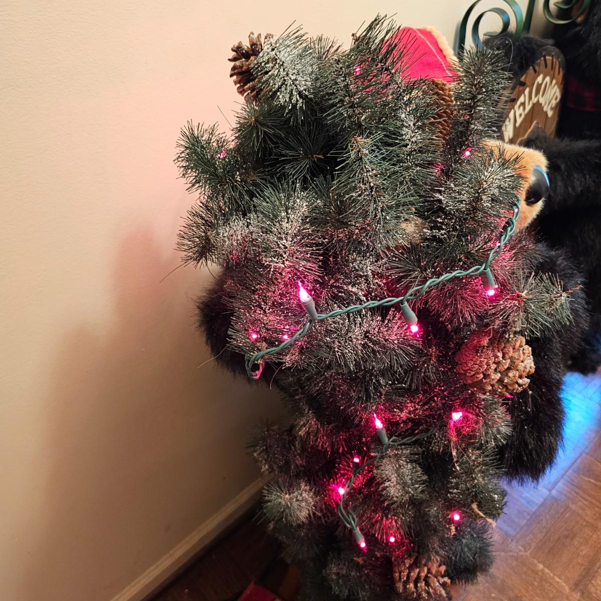 An adorable pair of soft plush bears in festive holiday attire to welcome your guests and liven your home. Bear with tree has red lights that work, and a small onlooker at the bottom of the tree. Felt hat and scarf keep him warm. Item measures 19" x 15" x 45"H, has scalloped edge wood base. Bear #2 holds a sled with a 'Welcome' greeting on it and pine trees below. Checkered hat and scarf, wood base and measures 19" x 15" x 40"H. Total cuteness! See photos for details. Local pickup only.