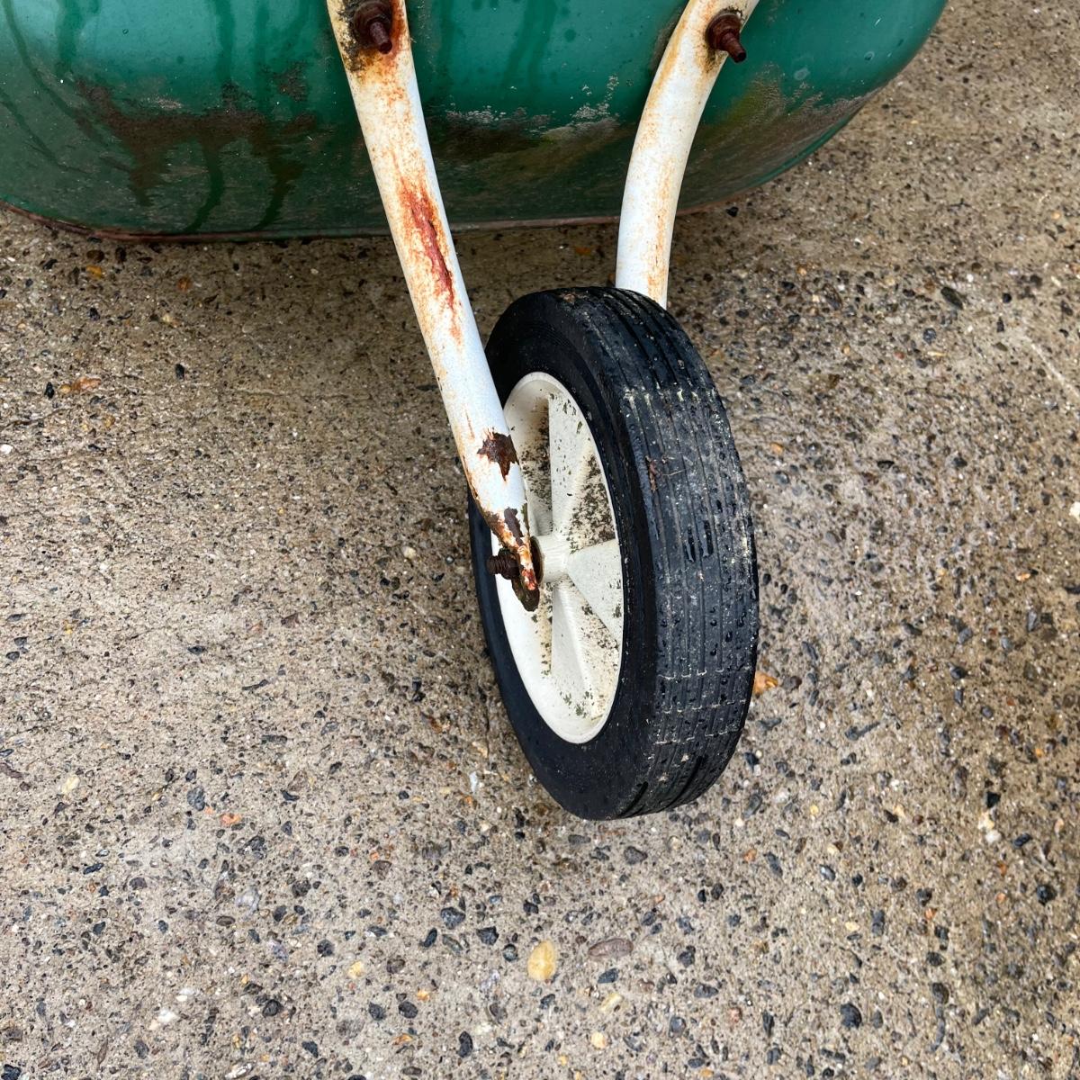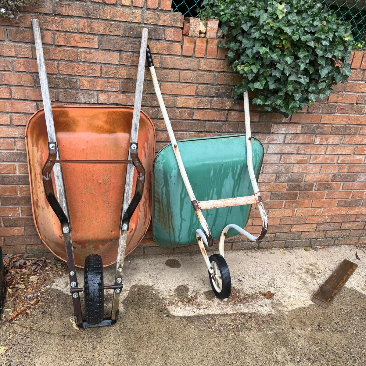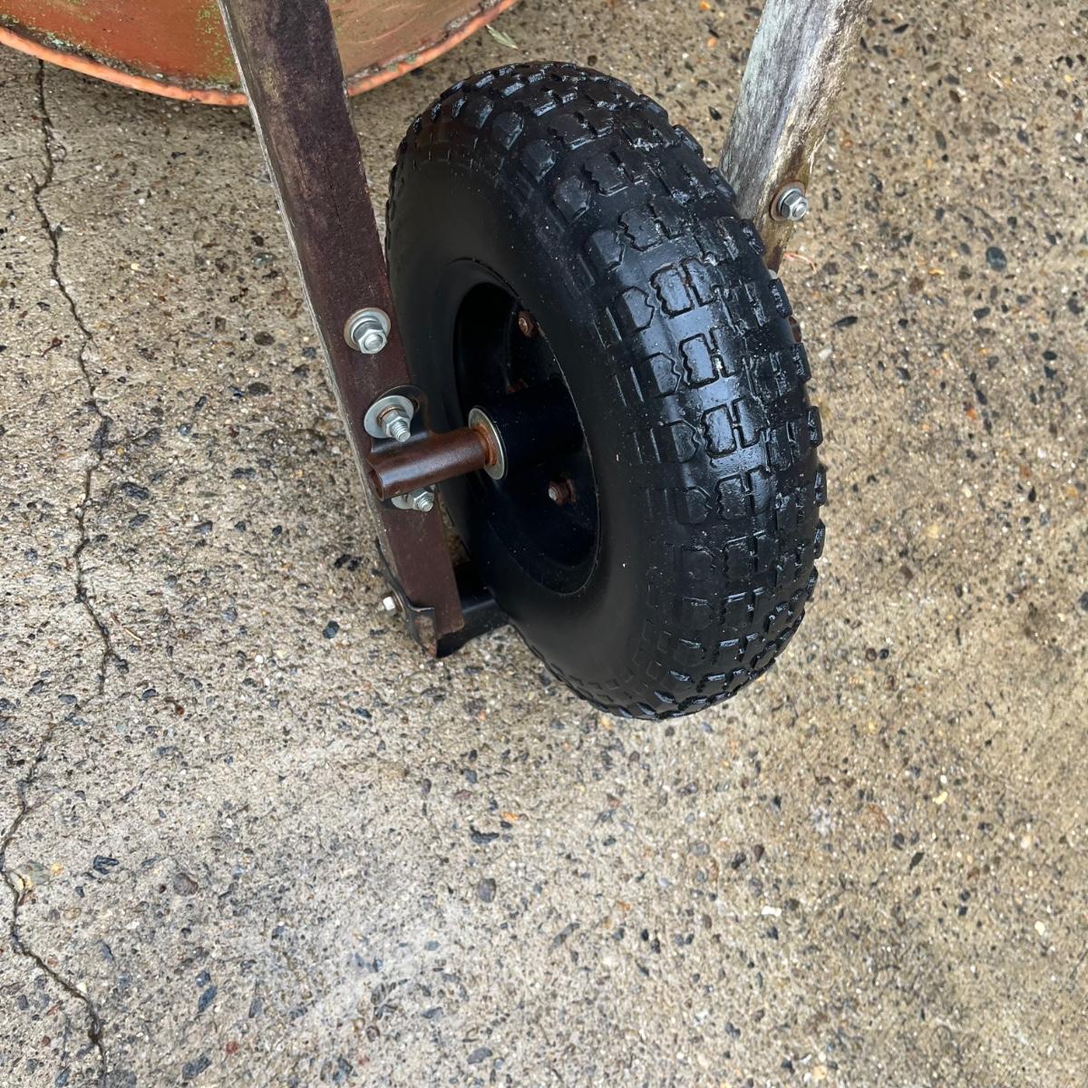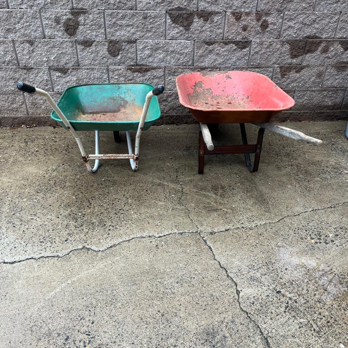 Lot includes two Wheelbarrows both with non pneumatic tires. Wheelbarrows have scratches and rust, but appear solid, see pictures.