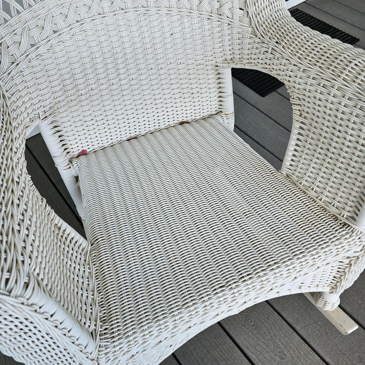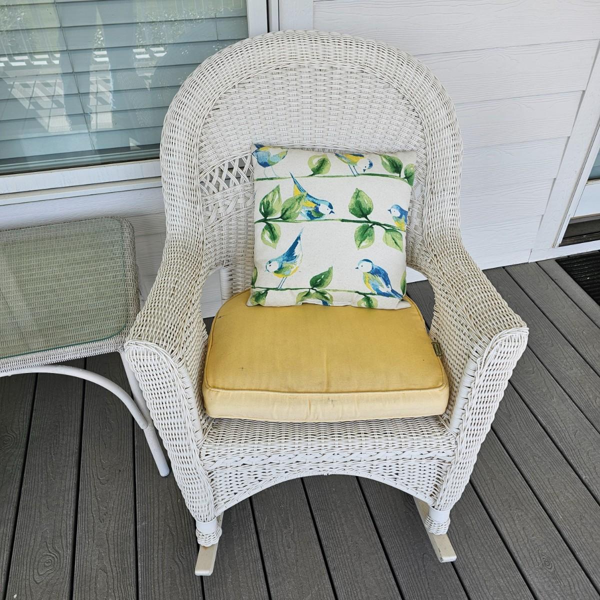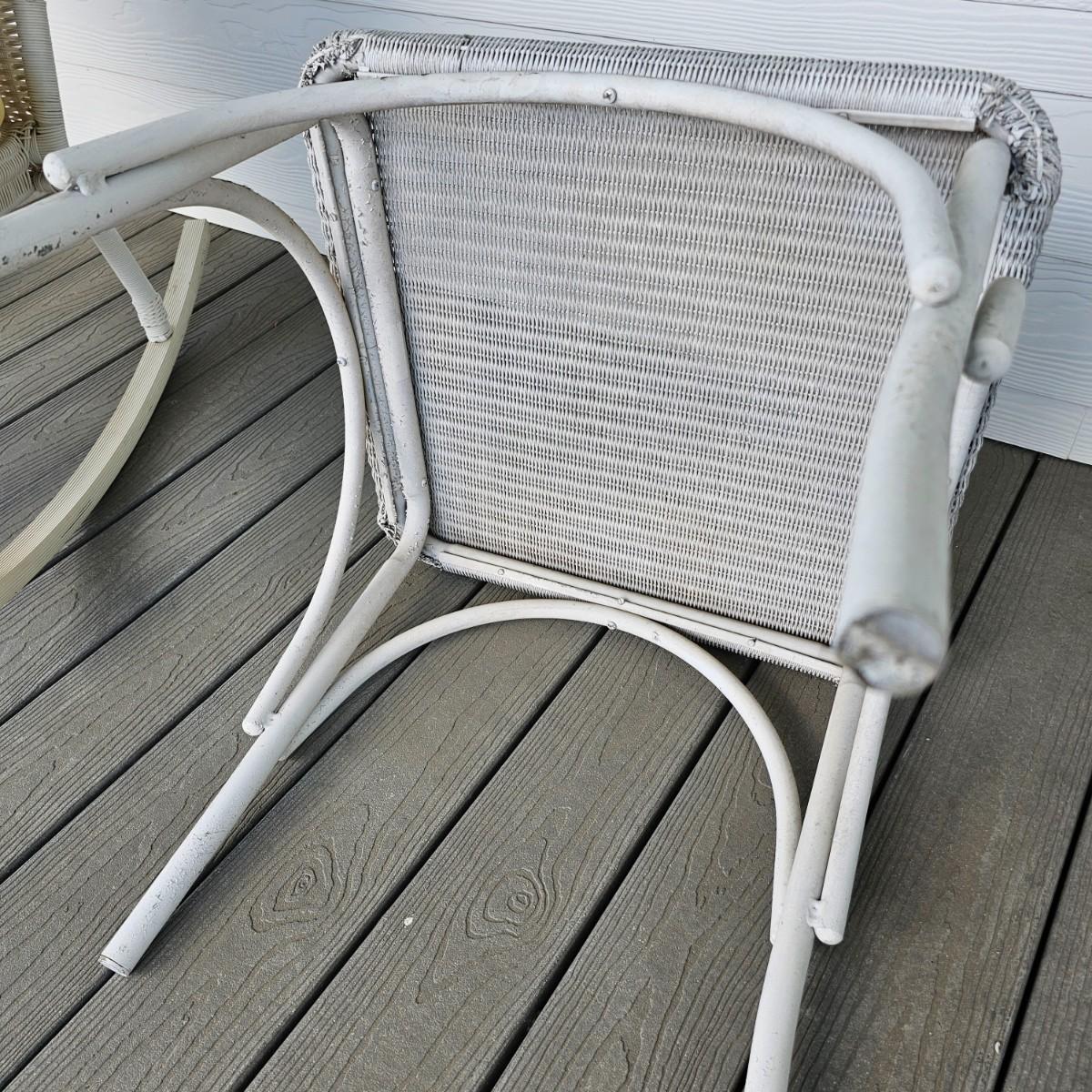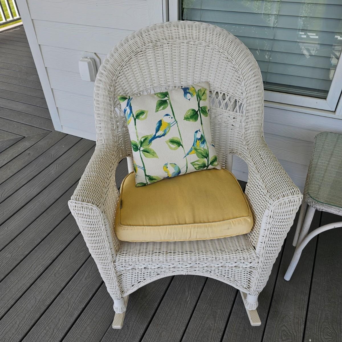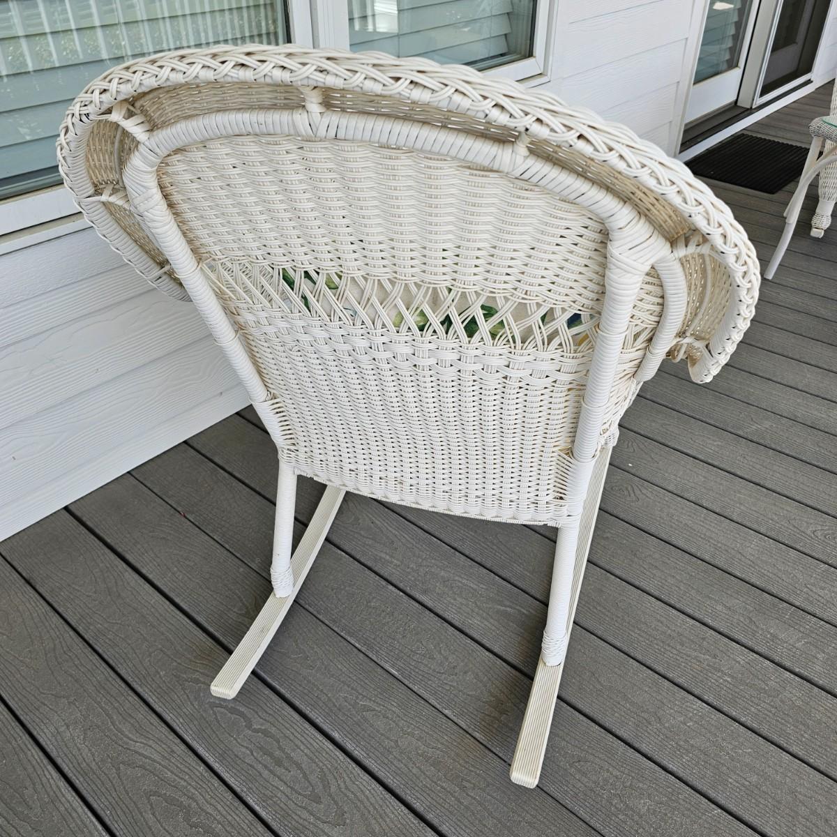 A pair of synthetic wicker round top rockers and a glass top wicker table. Chairs have seat cushions and pillows, measure 24" x 29" x 38"H, seat height 16" without and 18"with cushions. See photos for condition of rocker bottoms. Wicker table is 20.5" x 21.5" x 20"H, has tempered glass top. Some chipping paint. See photos for details. Local pickup only.