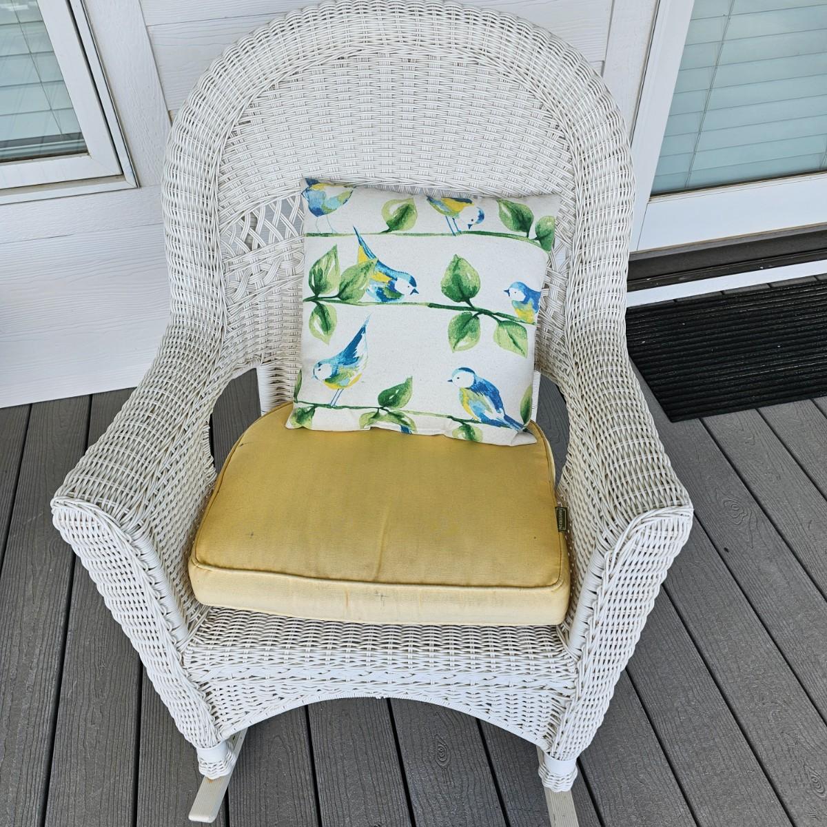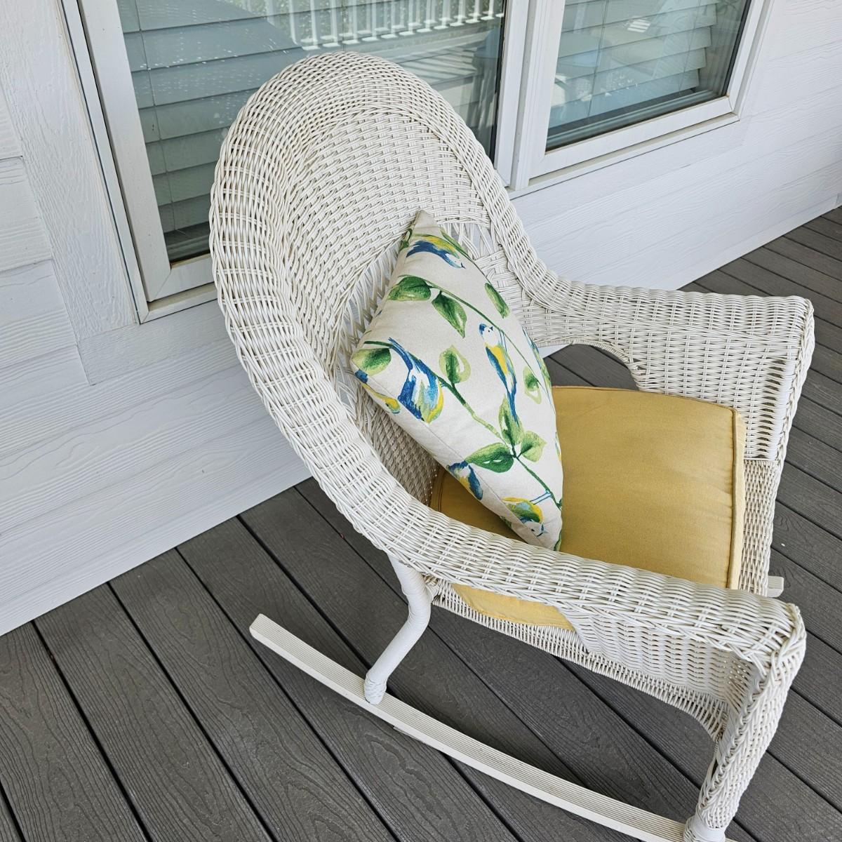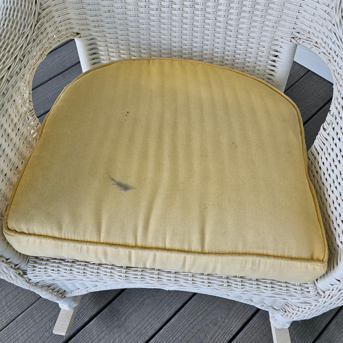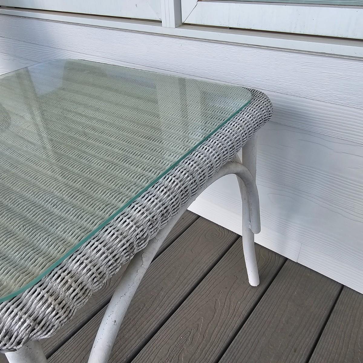 A pair of synthetic wicker round top rockers and a glass top wicker table. Chairs have seat cushions and pillows, measure 24" x 29" x 38"H, seat height 16" without and 18"with cushions. See photos for condition of rocker bottoms. Wicker table is 20.5" x 21.5" x 20"H, has tempered glass top. Some chipping paint. See photos for details. Local pickup only.
