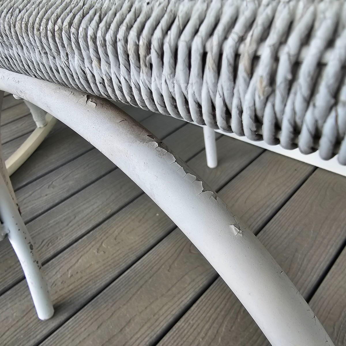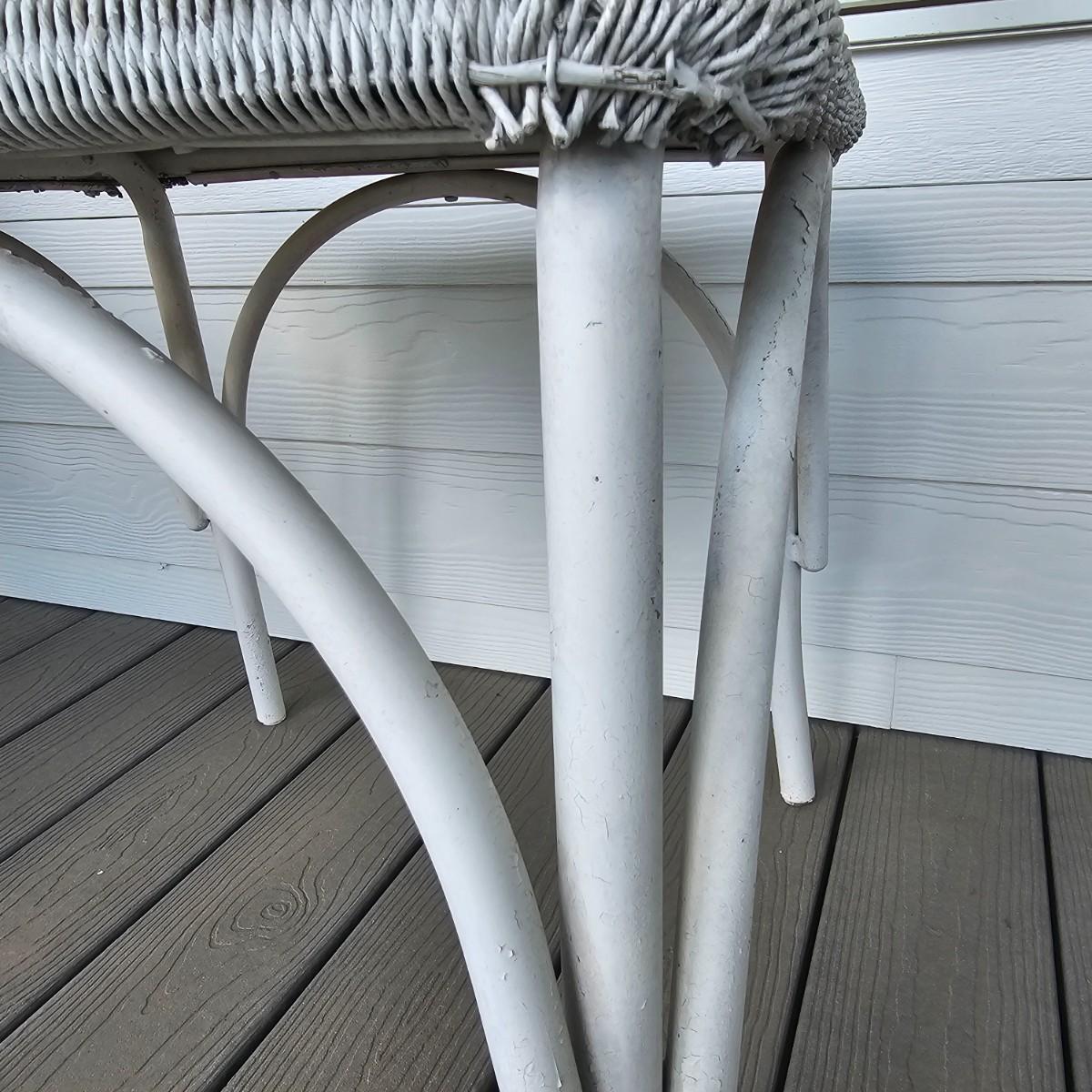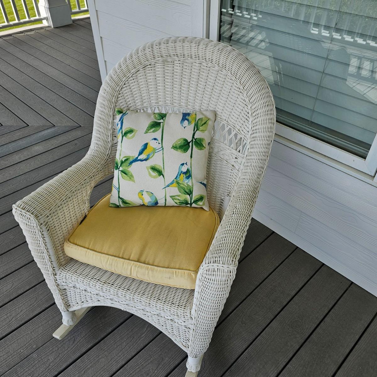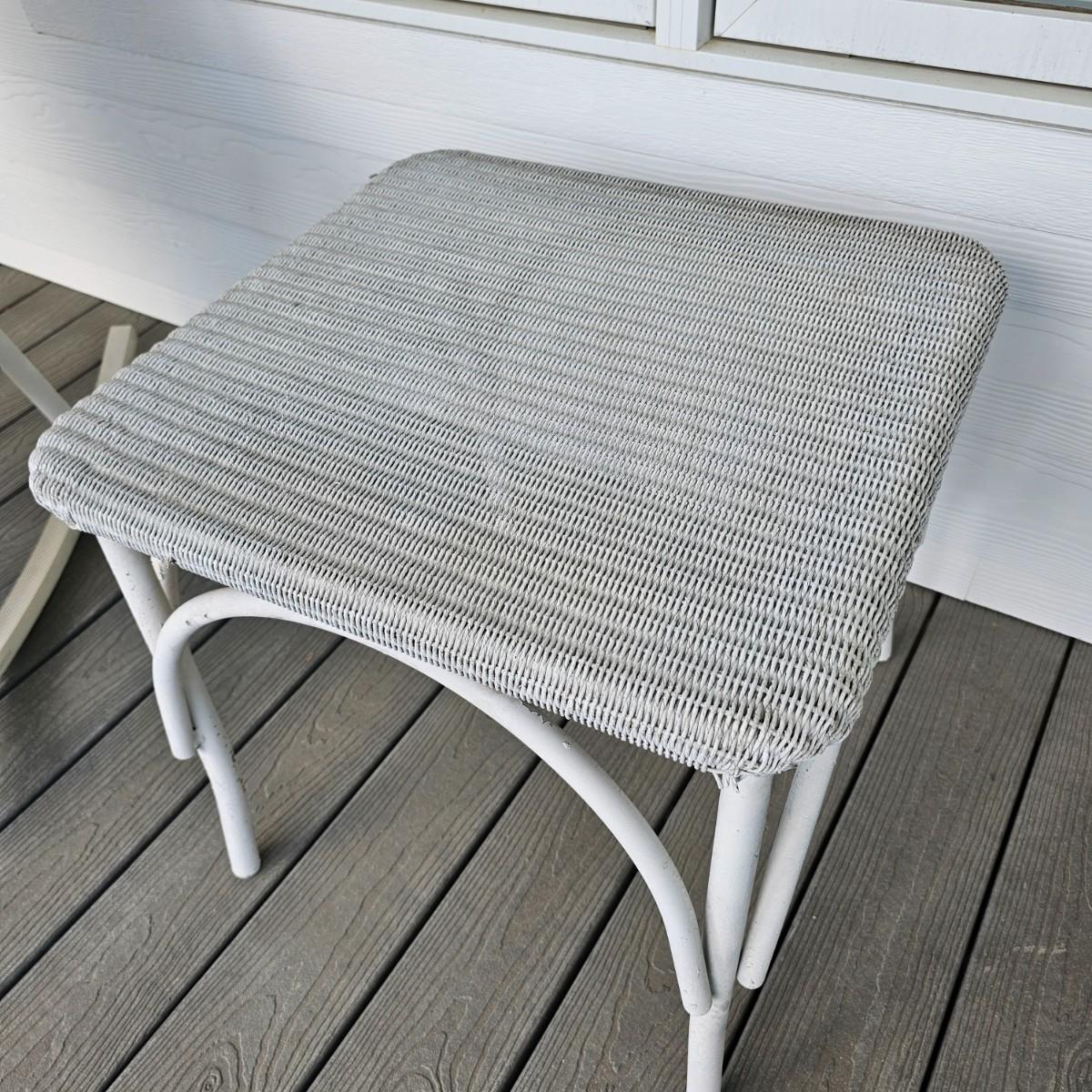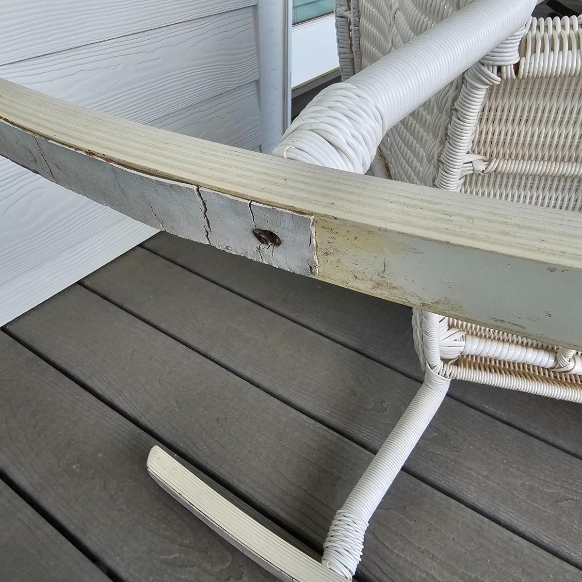 A pair of synthetic wicker round top rockers and a glass top wicker table. Chairs have seat cushions and pillows, measure 24" x 29" x 38"H, seat height 16" without and 18"with cushions. See photos for condition of rocker bottoms. Wicker table is 20.5" x 21.5" x 20"H, has tempered glass top. Some chipping paint. See photos for details. Local pickup only.