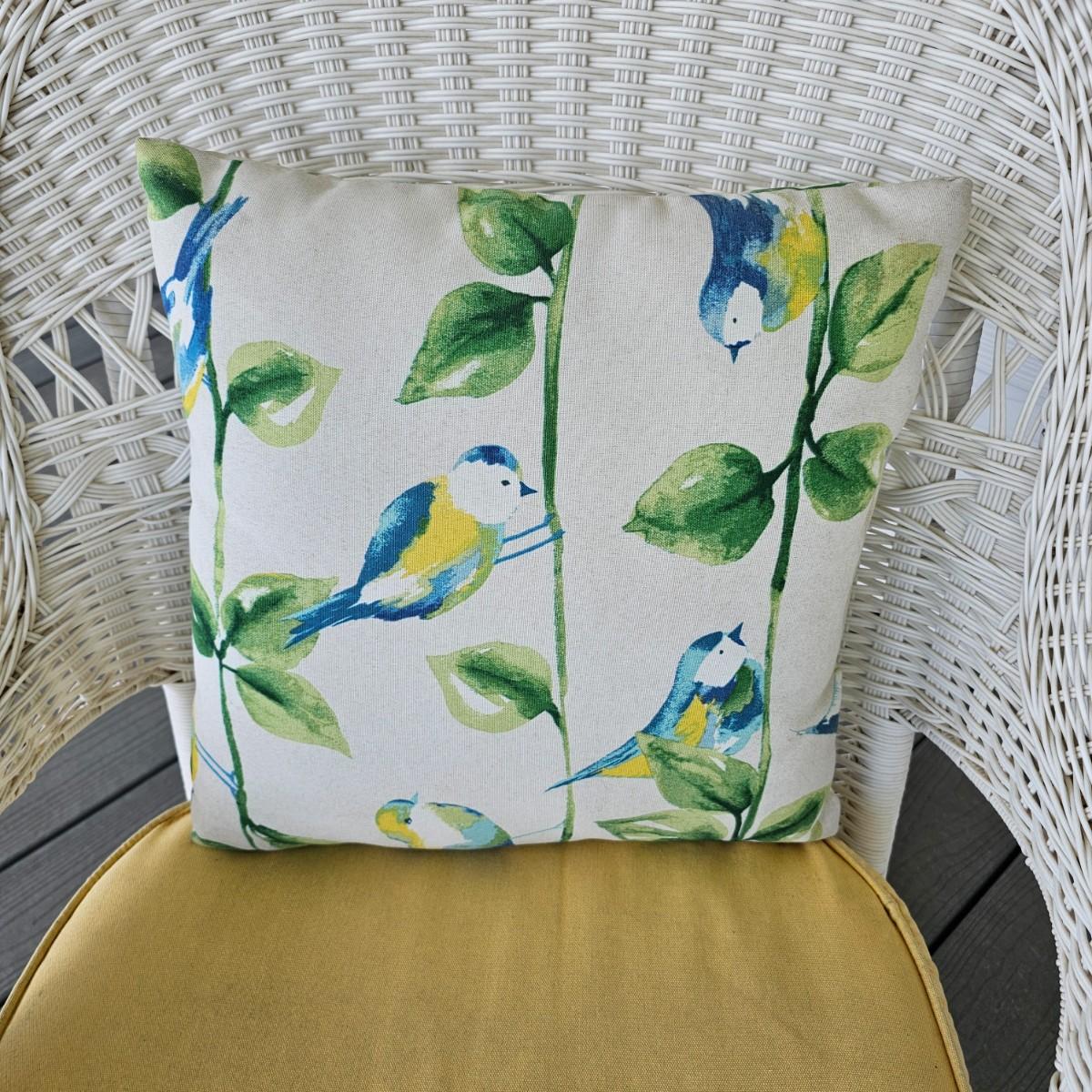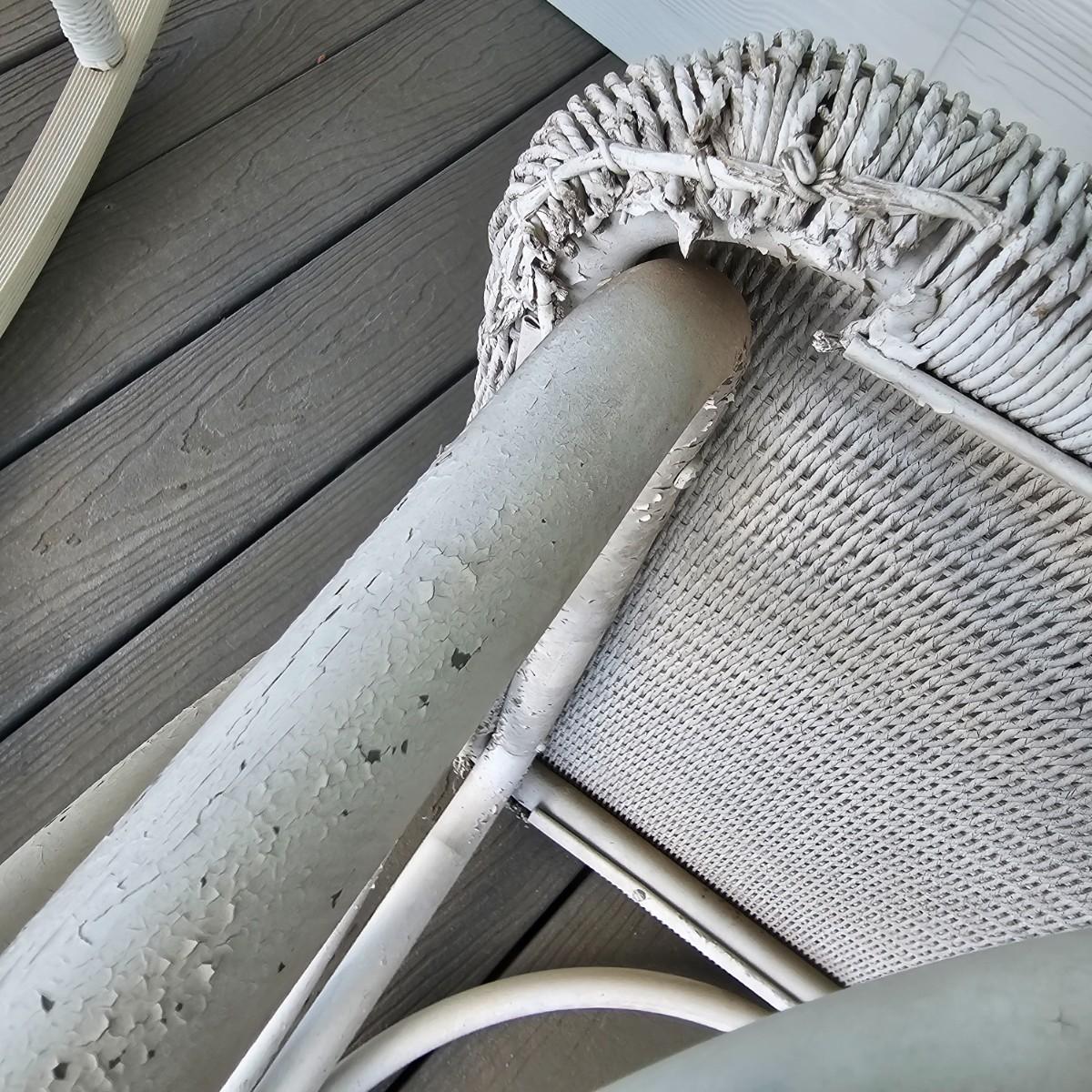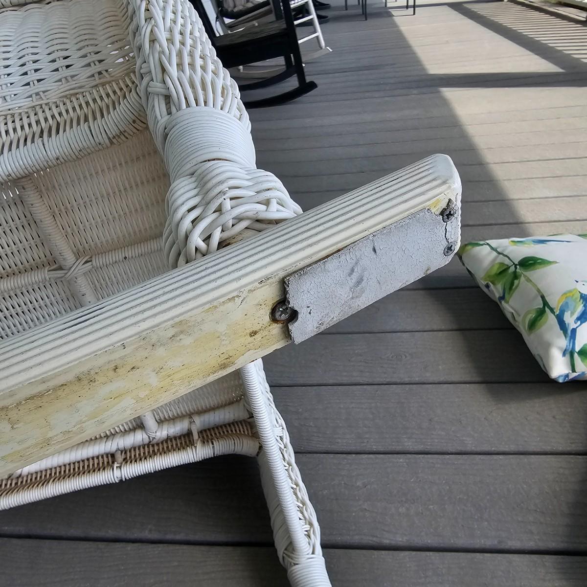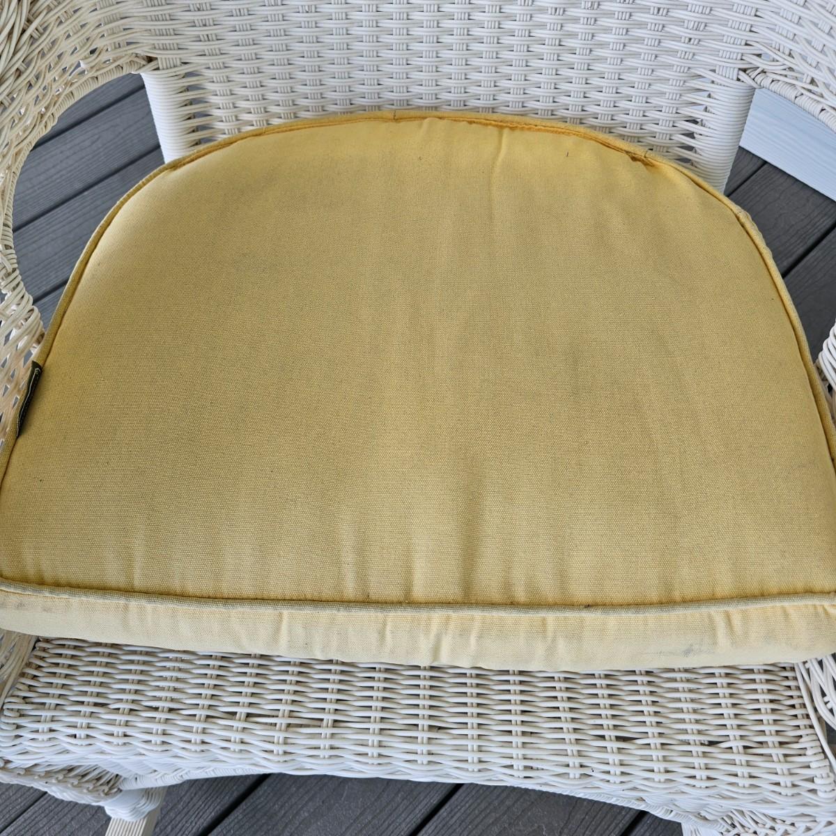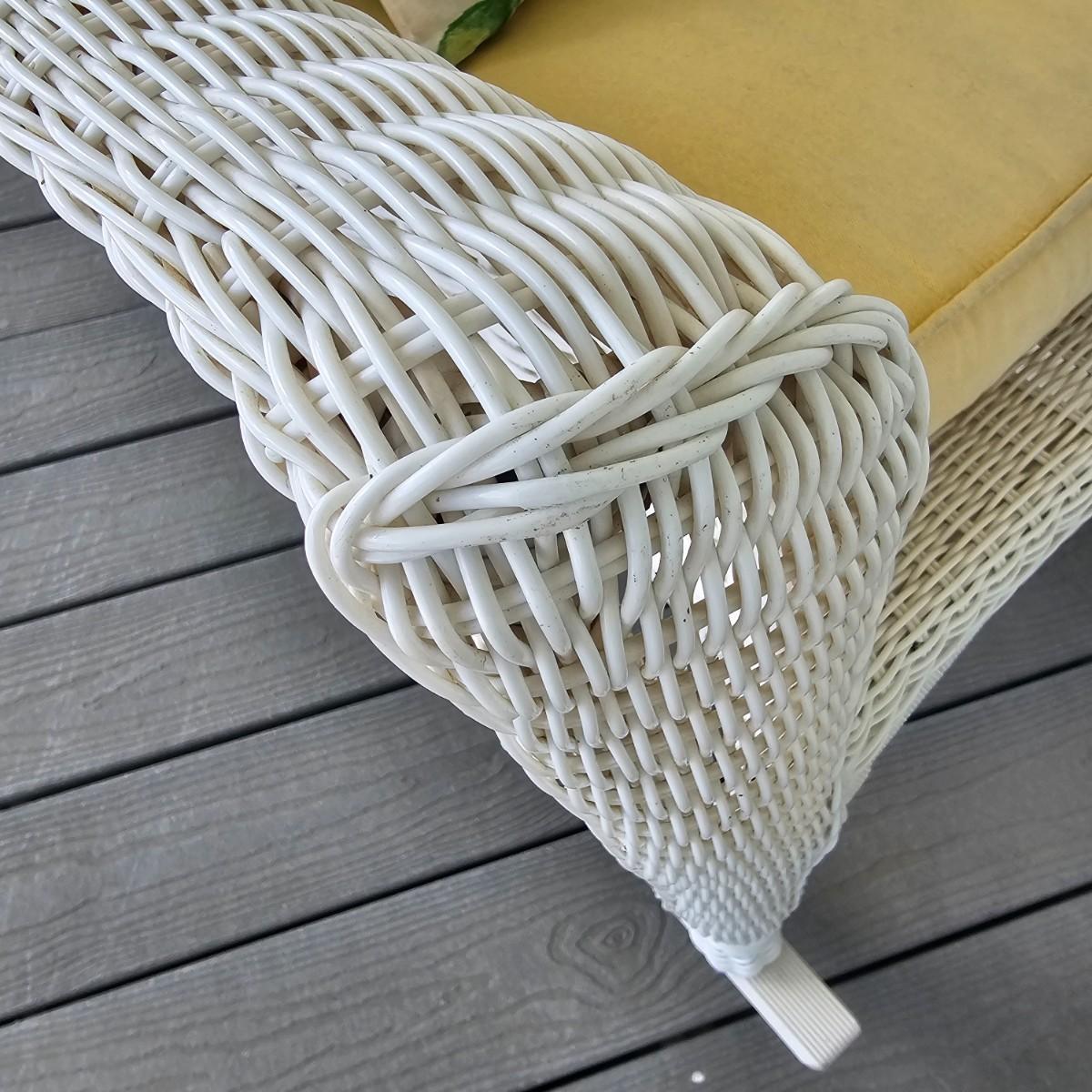 A pair of synthetic wicker round top rockers and a glass top wicker table. Chairs have seat cushions and pillows, measure 24" x 29" x 38"H, seat height 16" without and 18"with cushions. See photos for condition of rocker bottoms. Wicker table is 20.5" x 21.5" x 20"H, has tempered glass top. Some chipping paint. See photos for details. Local pickup only.