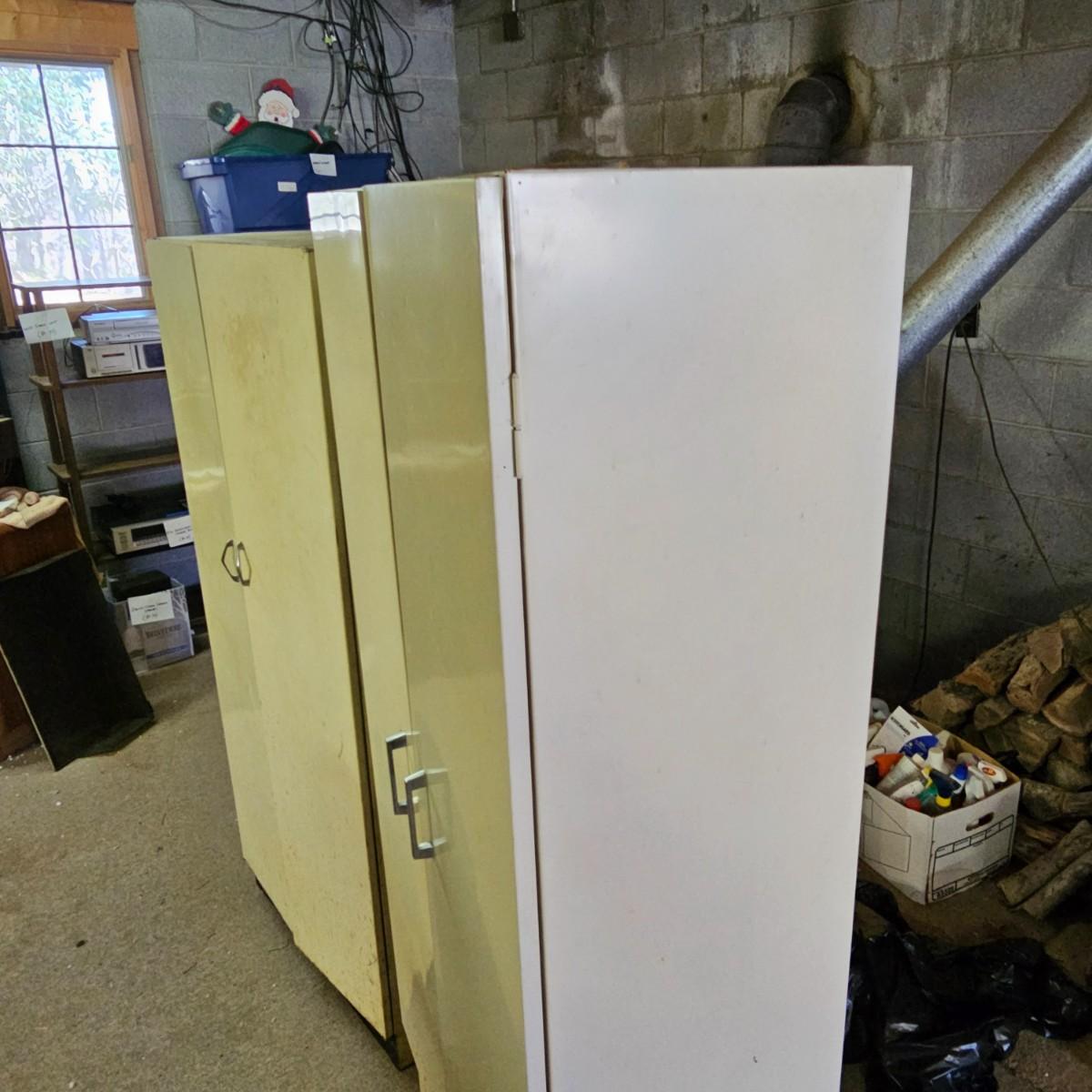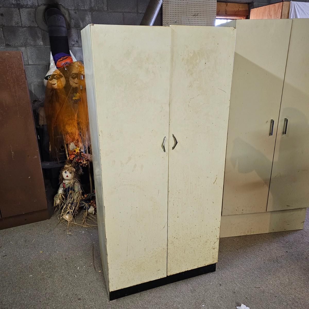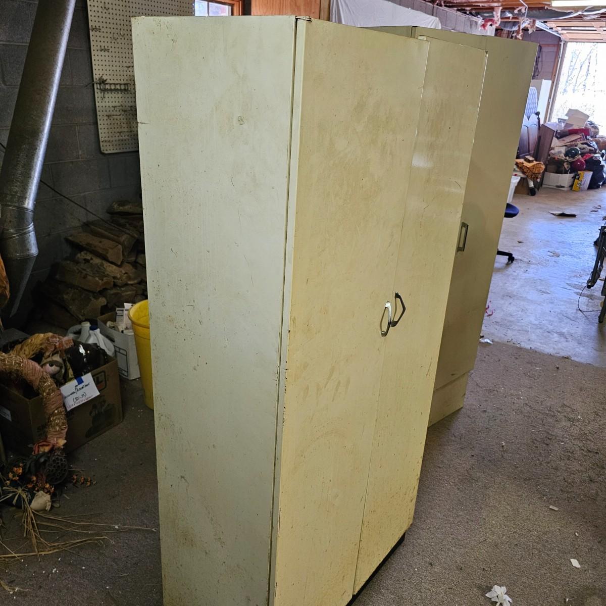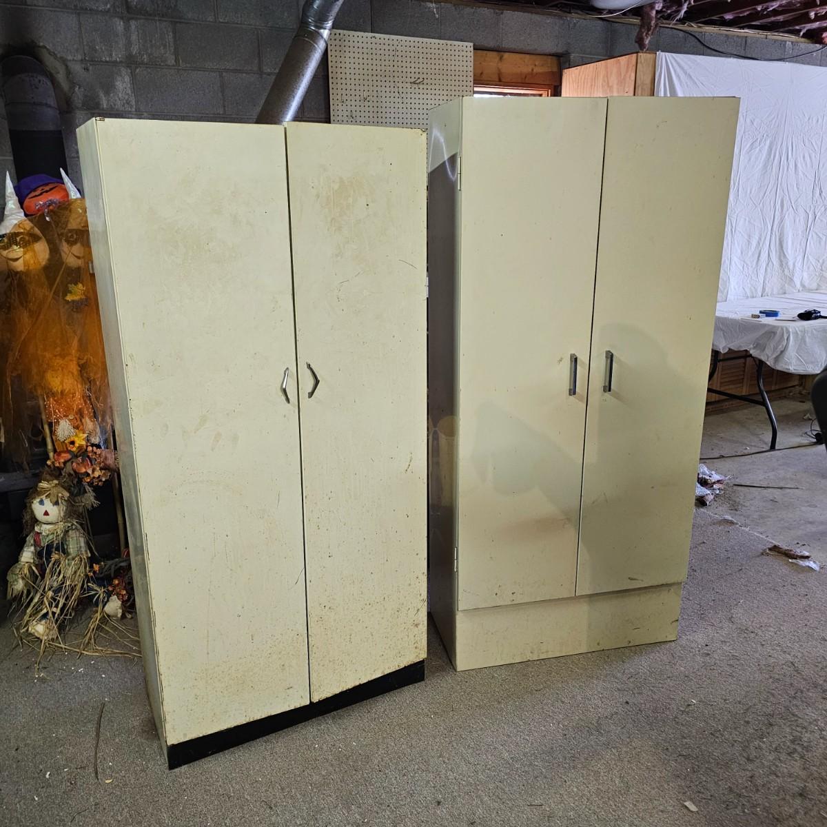 A pair of white metal storage cabinets. Taller unit, 30" x15" x 66"h has four fixed shelves and a deeper well in bottom.shorter unit, 30" 16" x 63"h has five fixed shelves. Some discoloring and rust on both units, see photos for details. Local pickup only.
