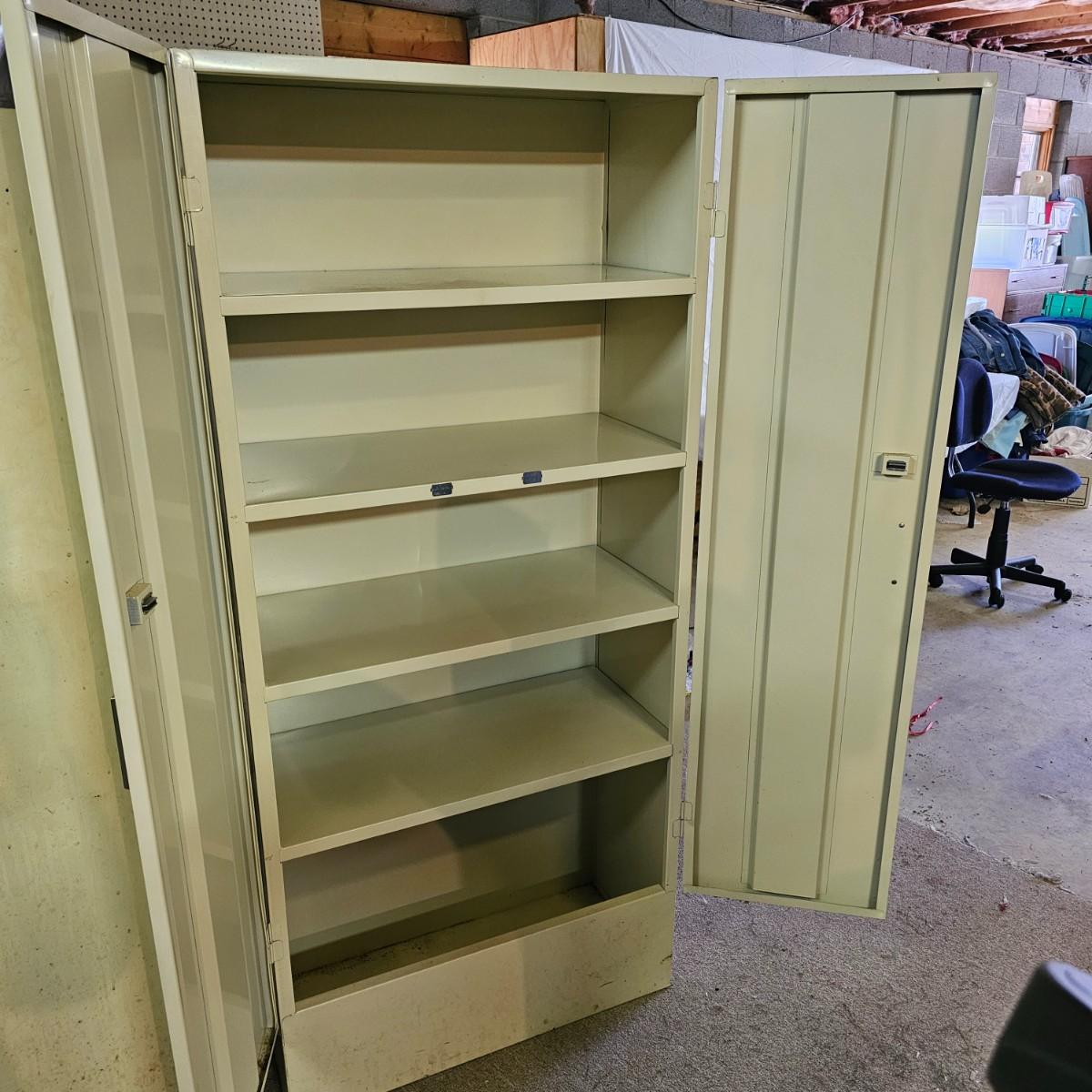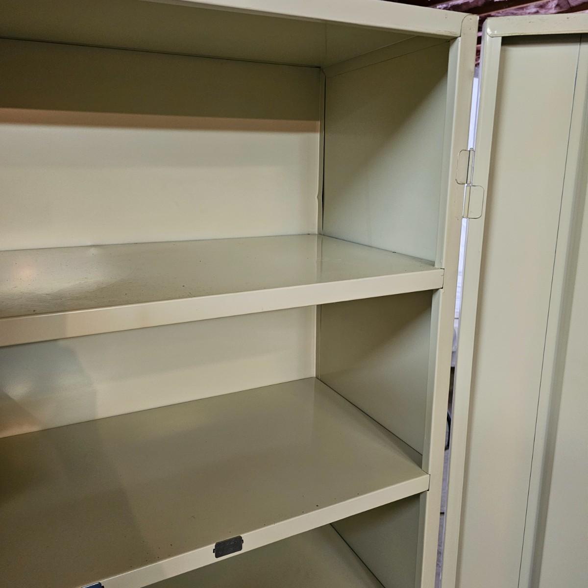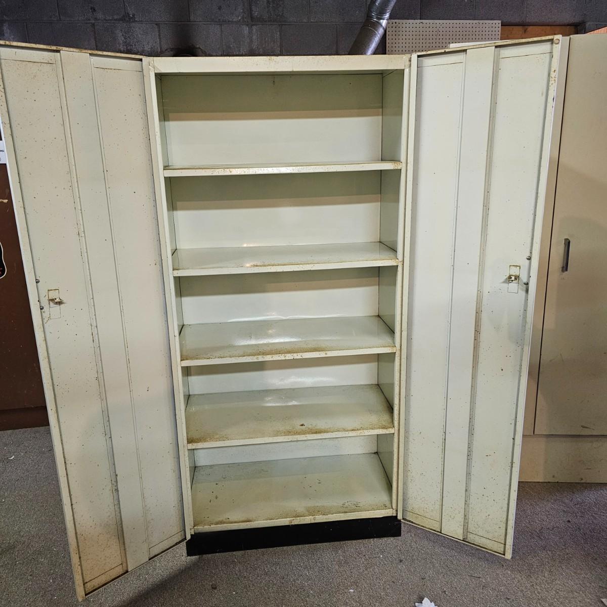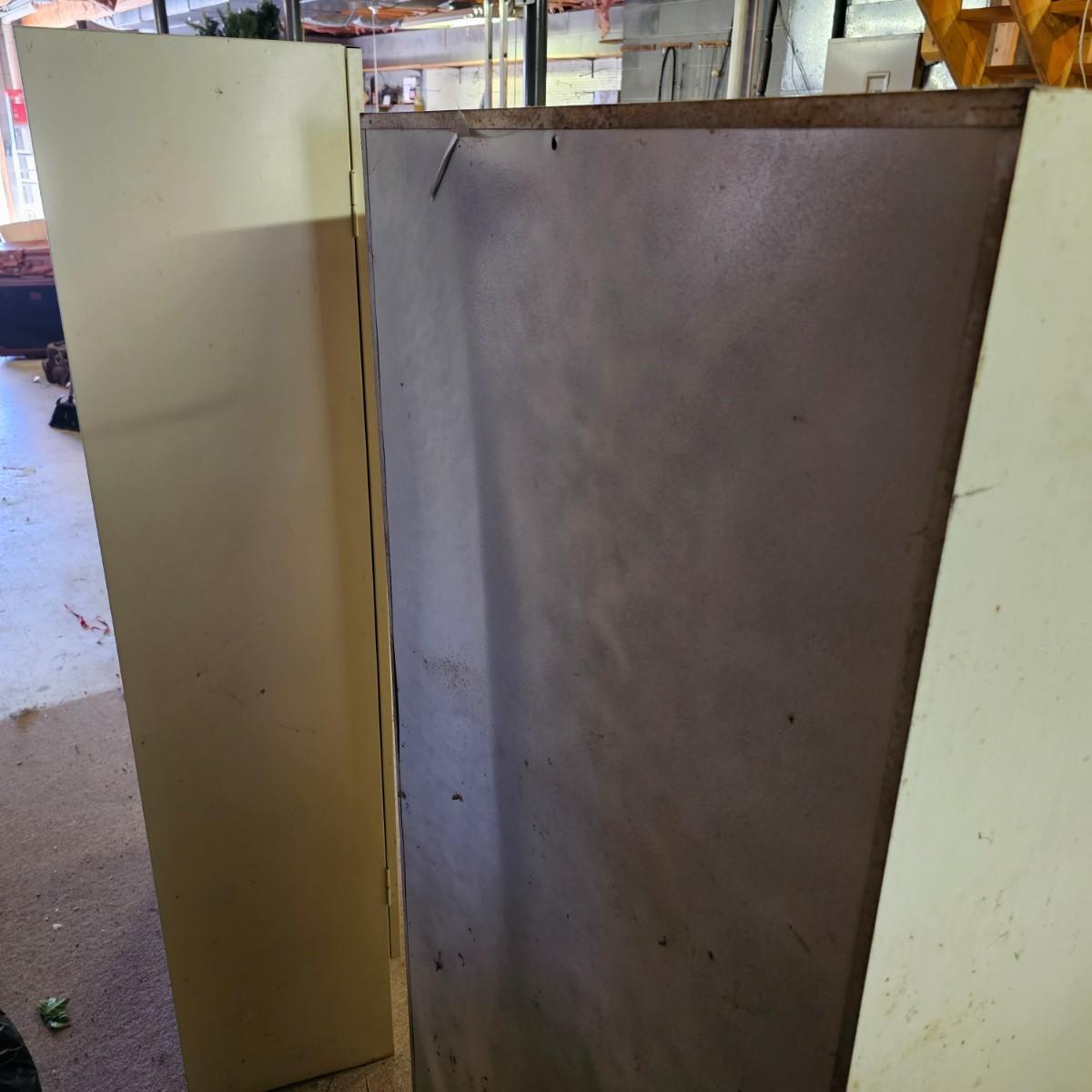 A pair of white metal storage cabinets. Taller unit, 30" x15" x 66"h has four fixed shelves and a deeper well in bottom.shorter unit, 30" 16" x 63"h has five fixed shelves. Some discoloring and rust on both units, see photos for details. Local pickup only.