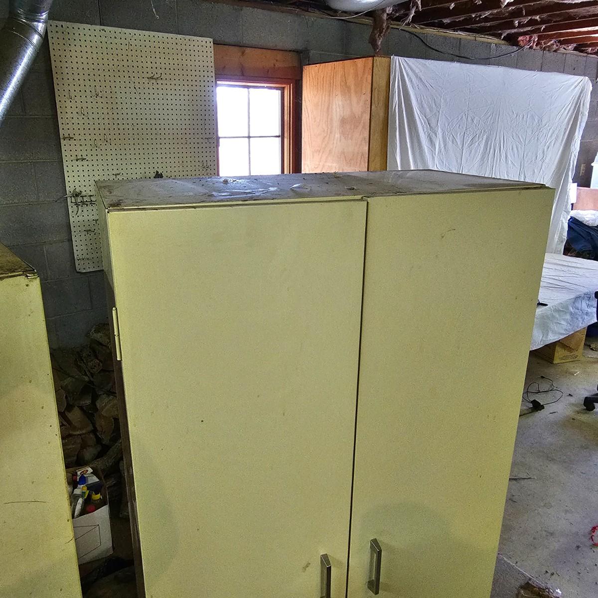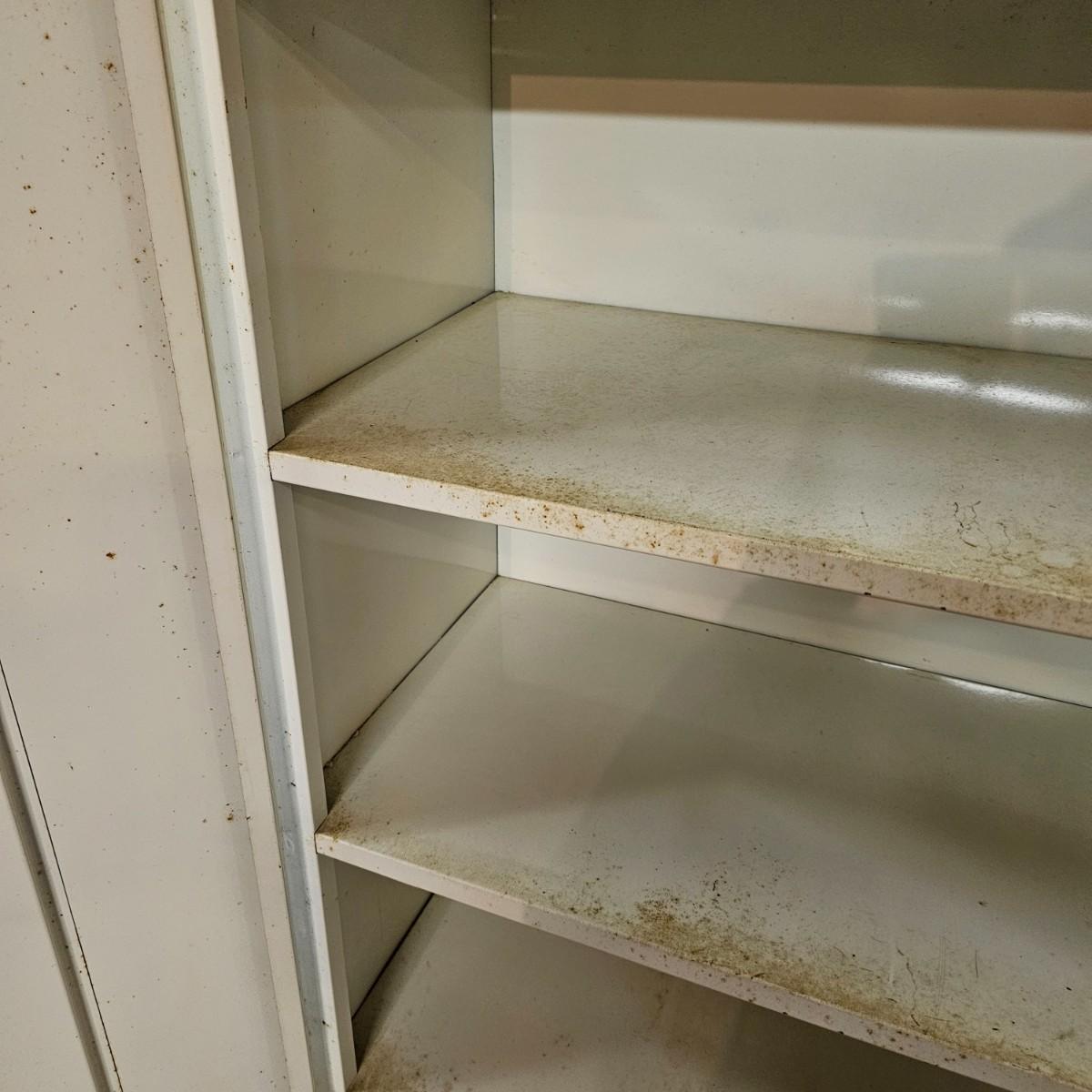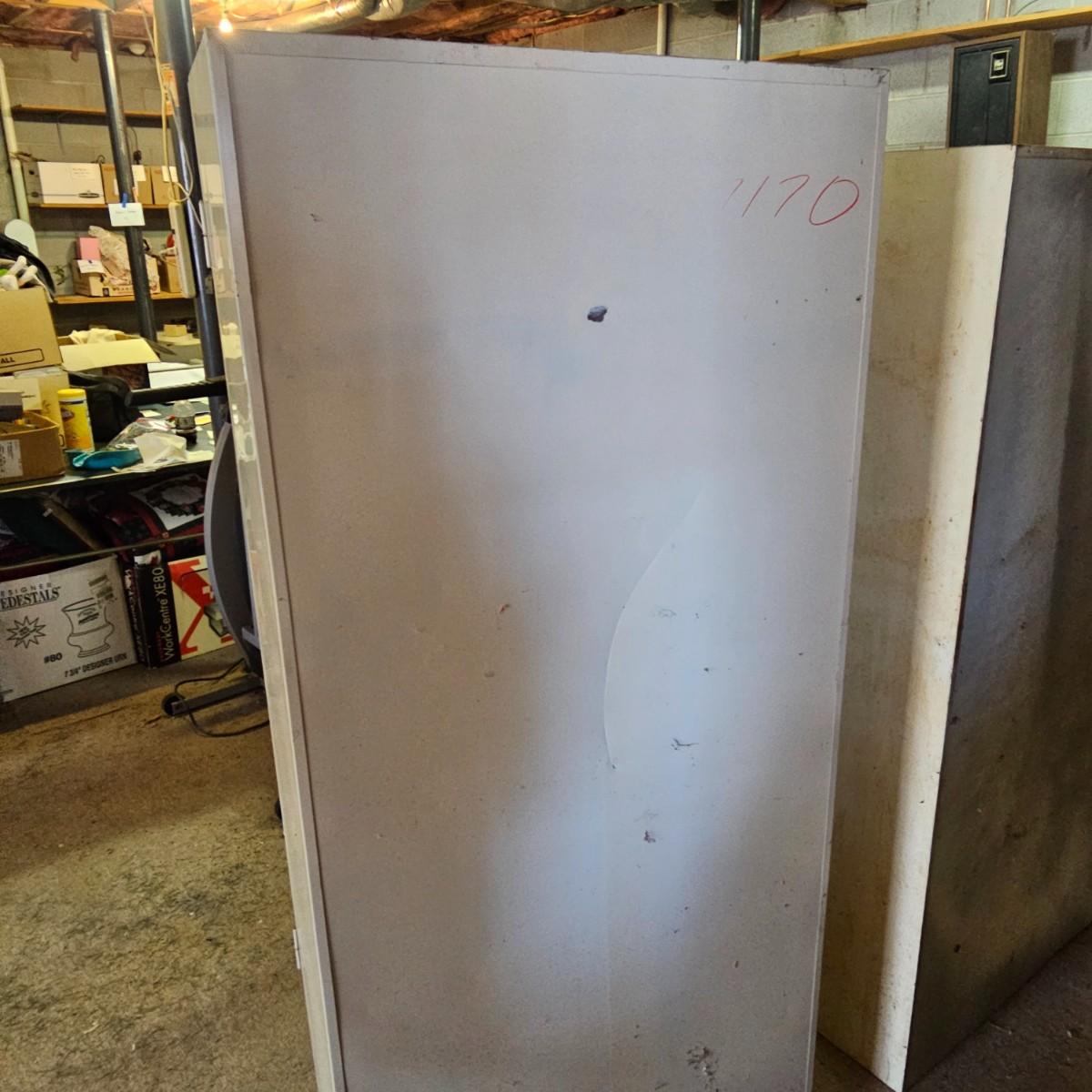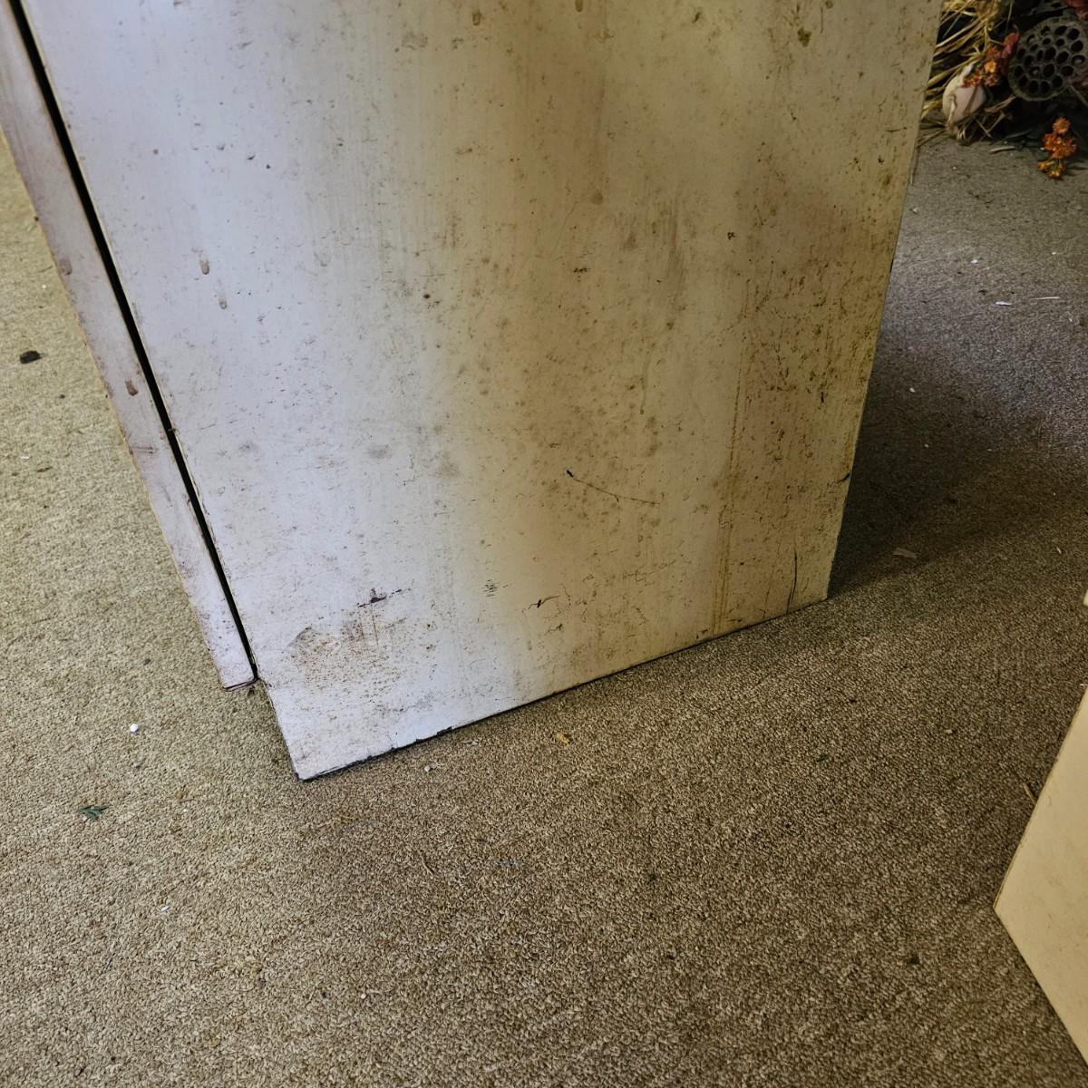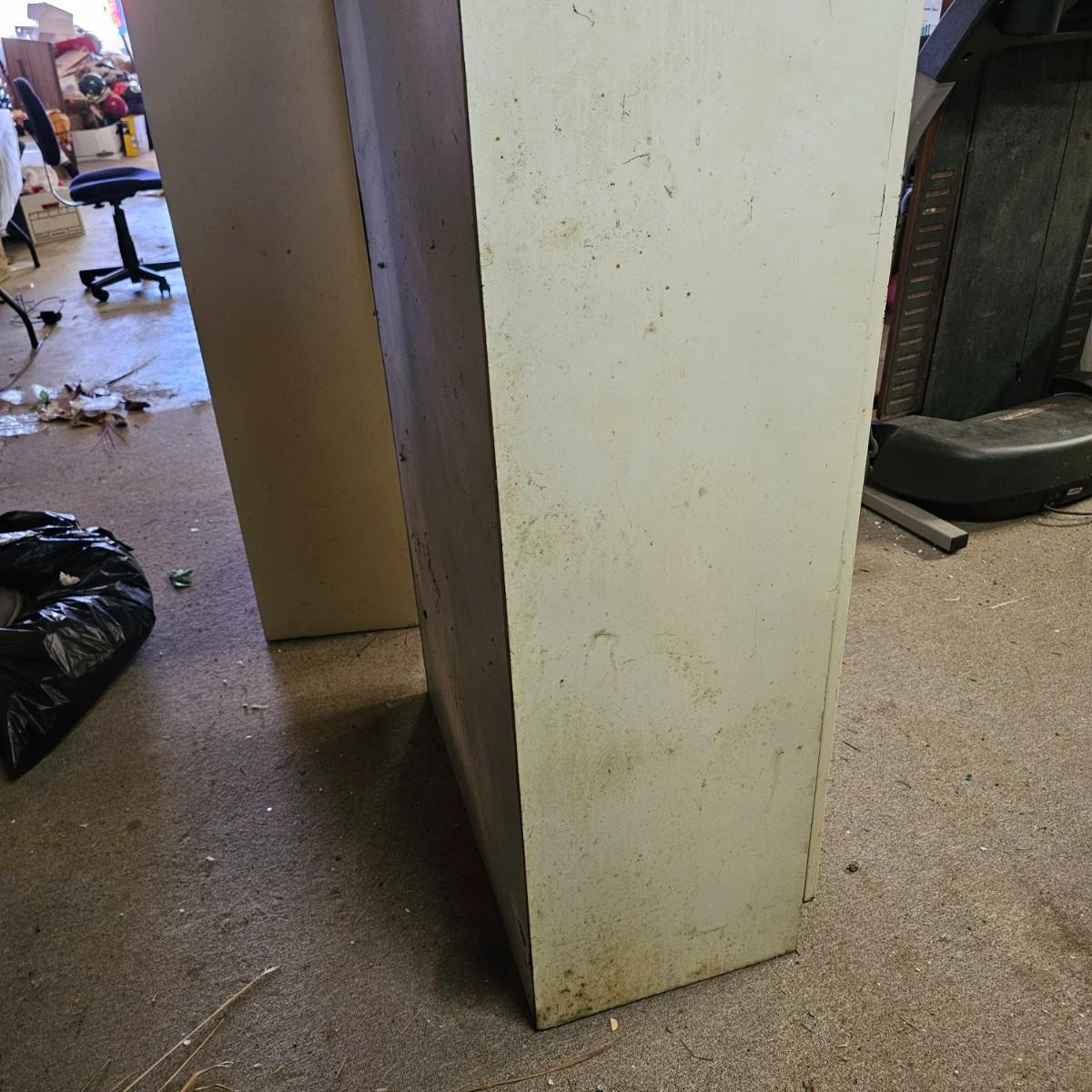 A pair of white metal storage cabinets. Taller unit, 30" x15" x 66"h has four fixed shelves and a deeper well in bottom.shorter unit, 30" 16" x 63"h has five fixed shelves. Some discoloring and rust on both units, see photos for details. Local pickup only.
