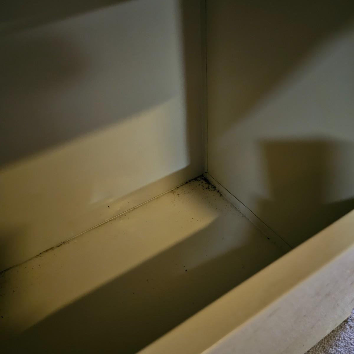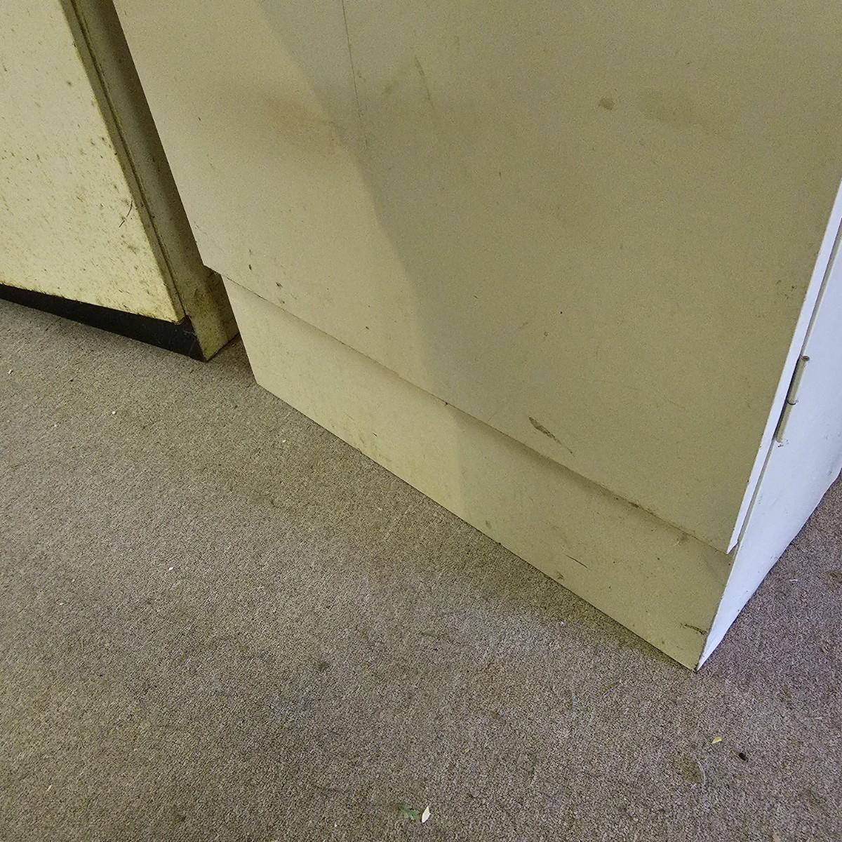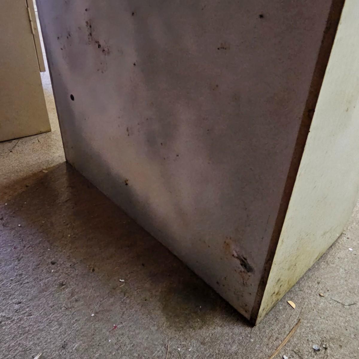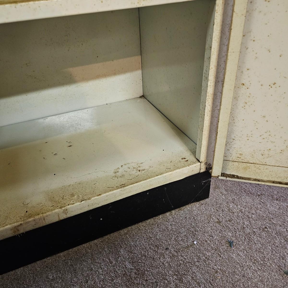 A pair of white metal storage cabinets. Taller unit, 30" x15" x 66"h has four fixed shelves and a deeper well in bottom.shorter unit, 30" 16" x 63"h has five fixed shelves. Some discoloring and rust on both units, see photos for details. Local pickup only.