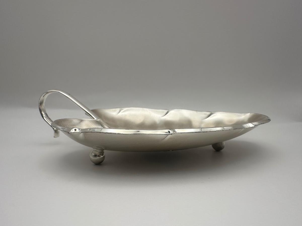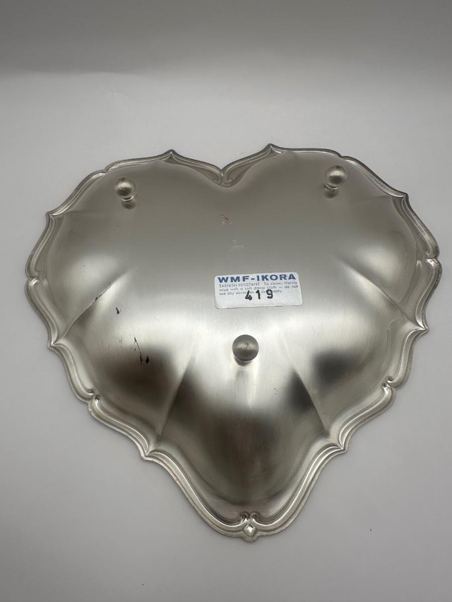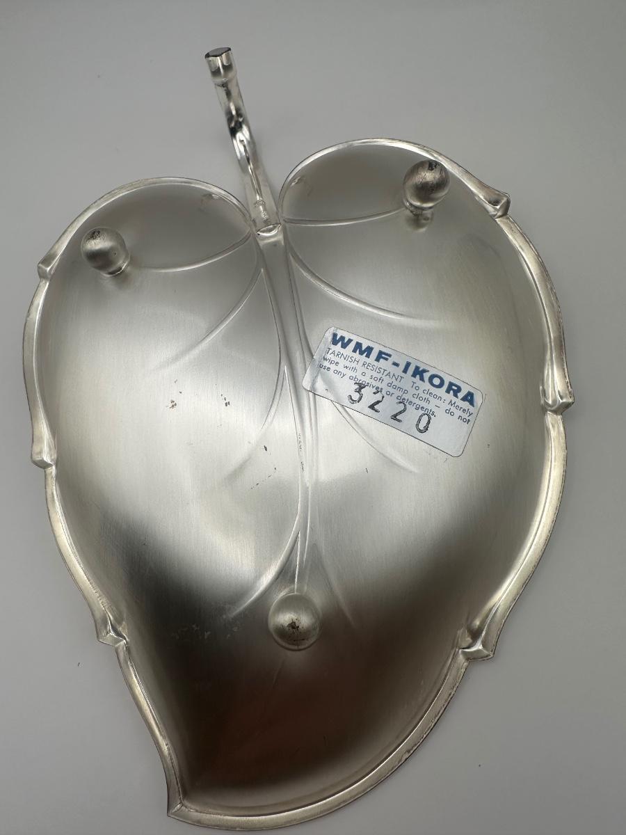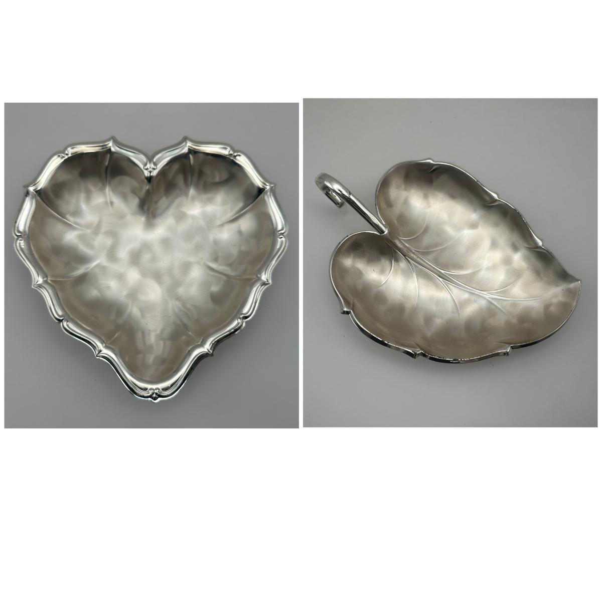 Set of two WMF Ikora decorative metal bowls, Germany. Includes one leaf-form bowl with integrated handle and one heart scalloped-edge bowl.