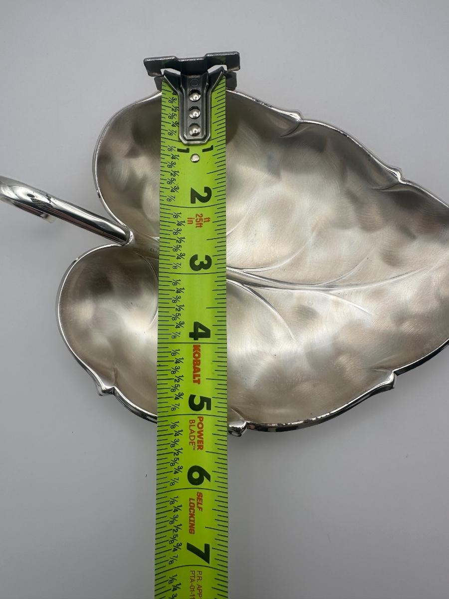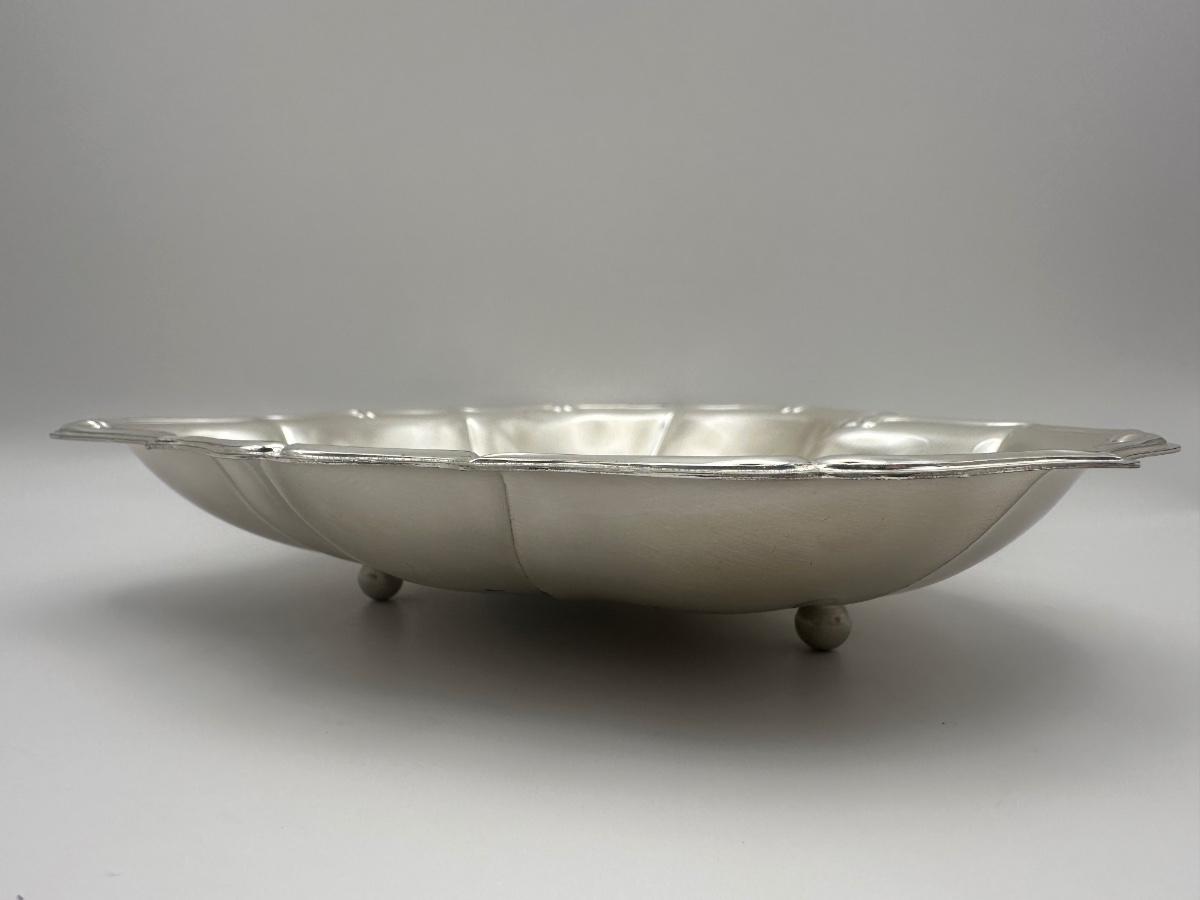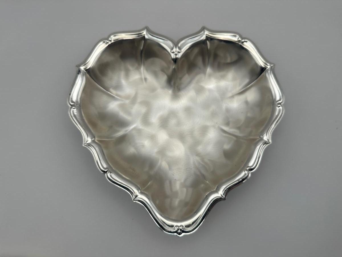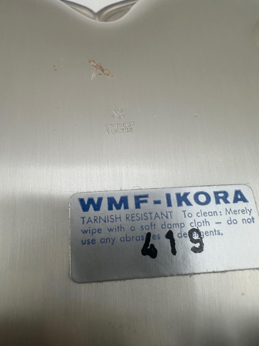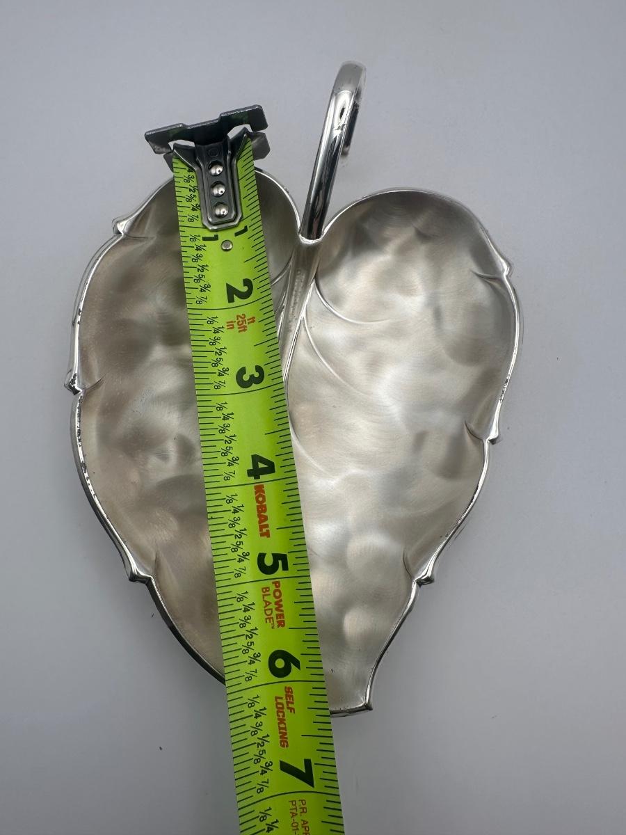 Set of two WMF Ikora decorative metal bowls, Germany. Includes one leaf-form bowl with integrated handle and one heart scalloped-edge bowl.