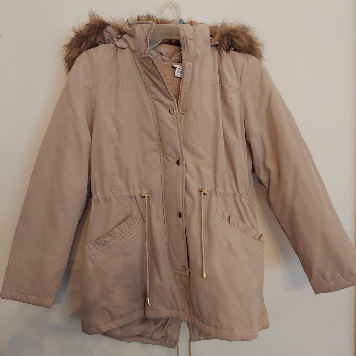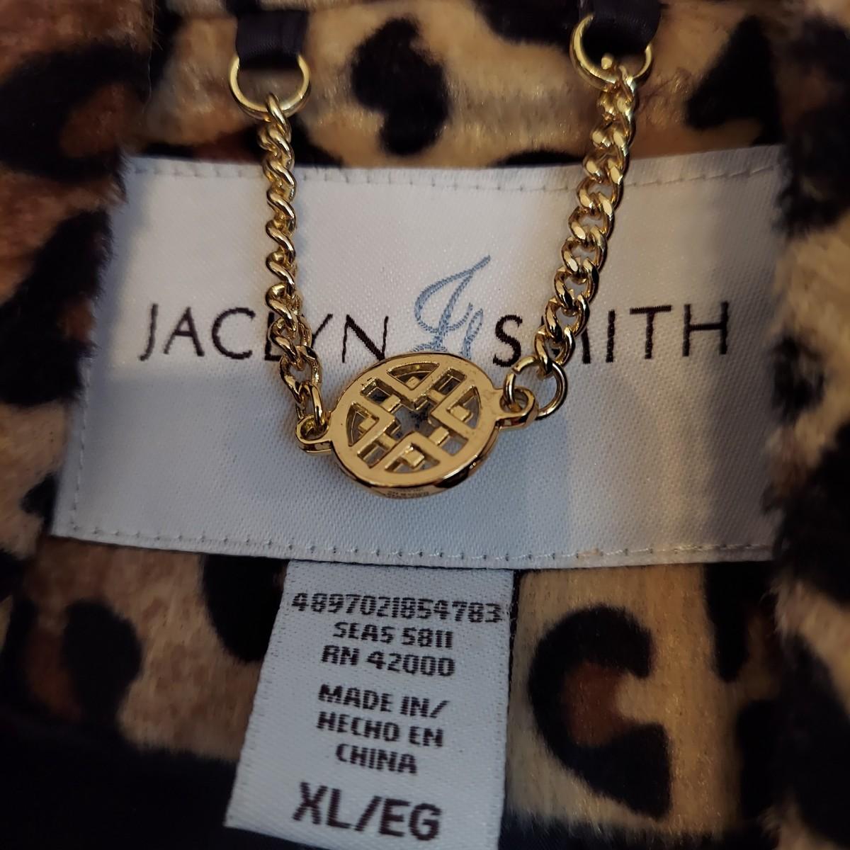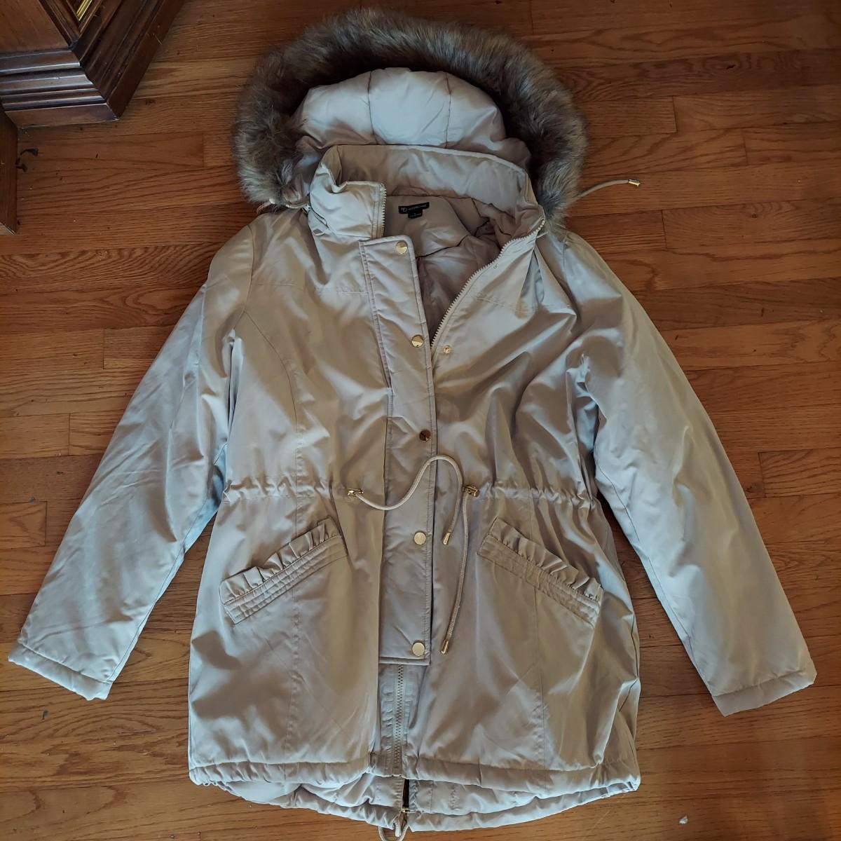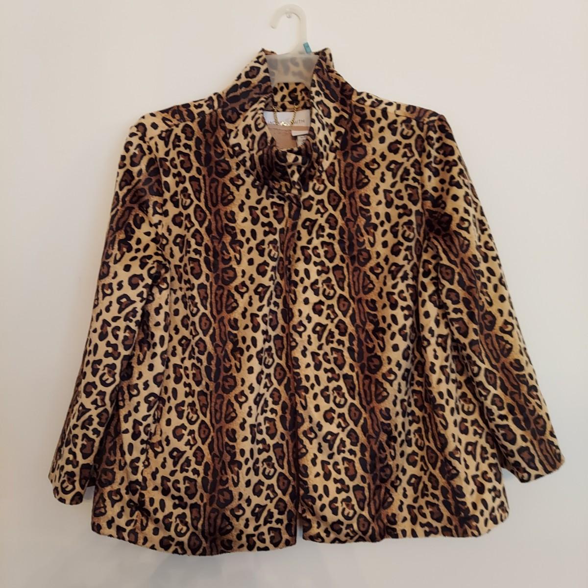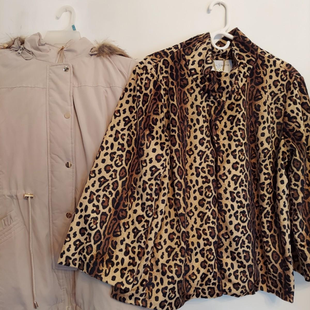 Lot of two women's coats. Jacqueline Smith brand Leopard print caplet style jacket is an XL. Tan Winter coat is a parka style with faux fur around the hood. New Directions brand in size Large. Local Pickup Only.
