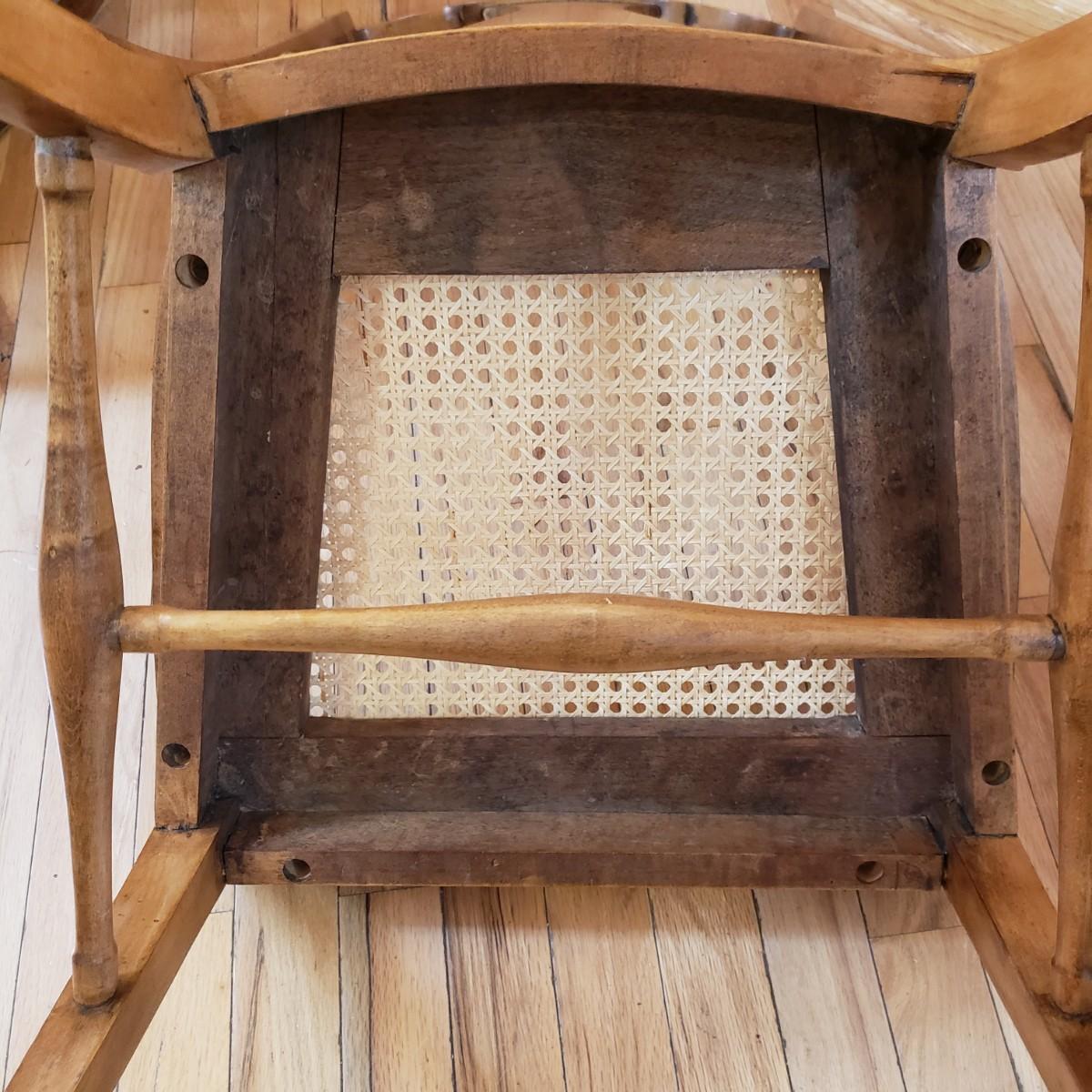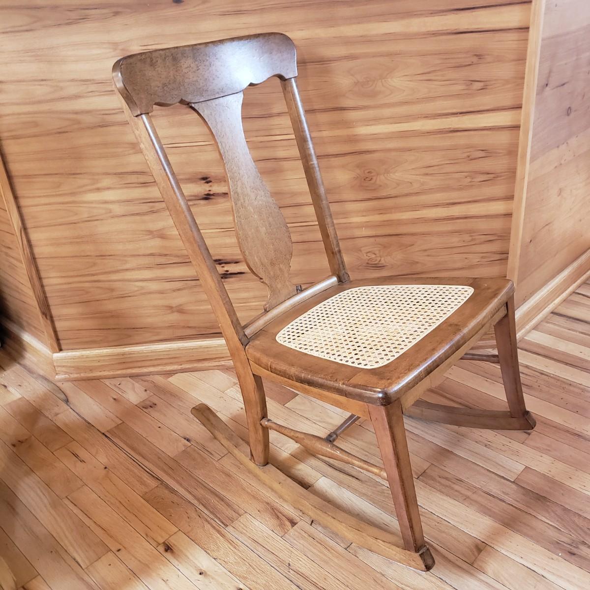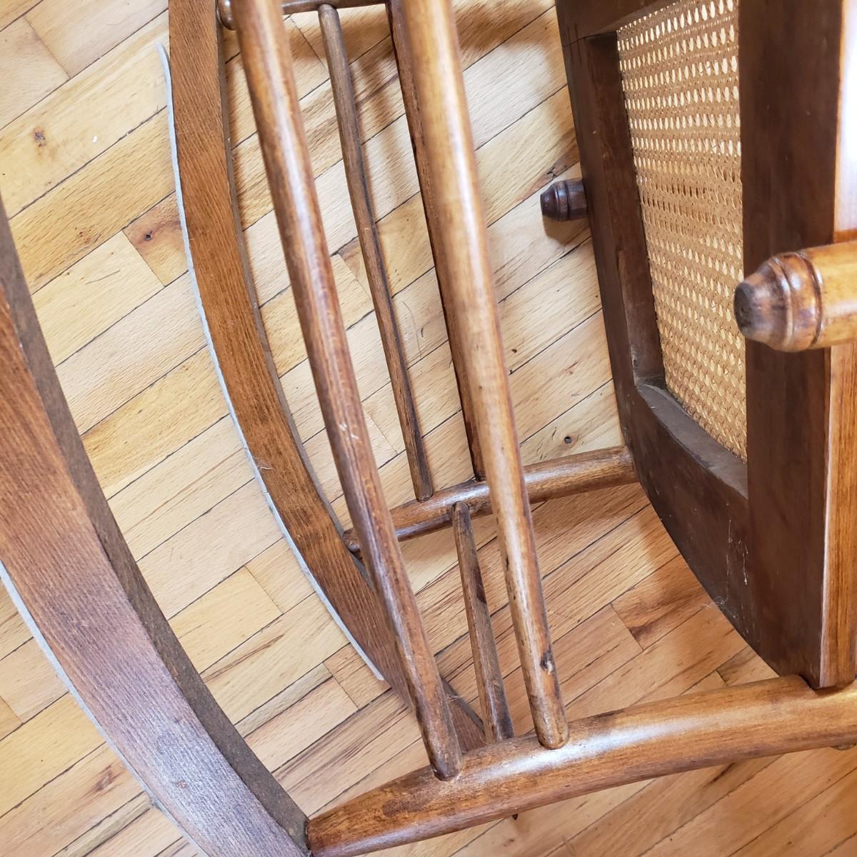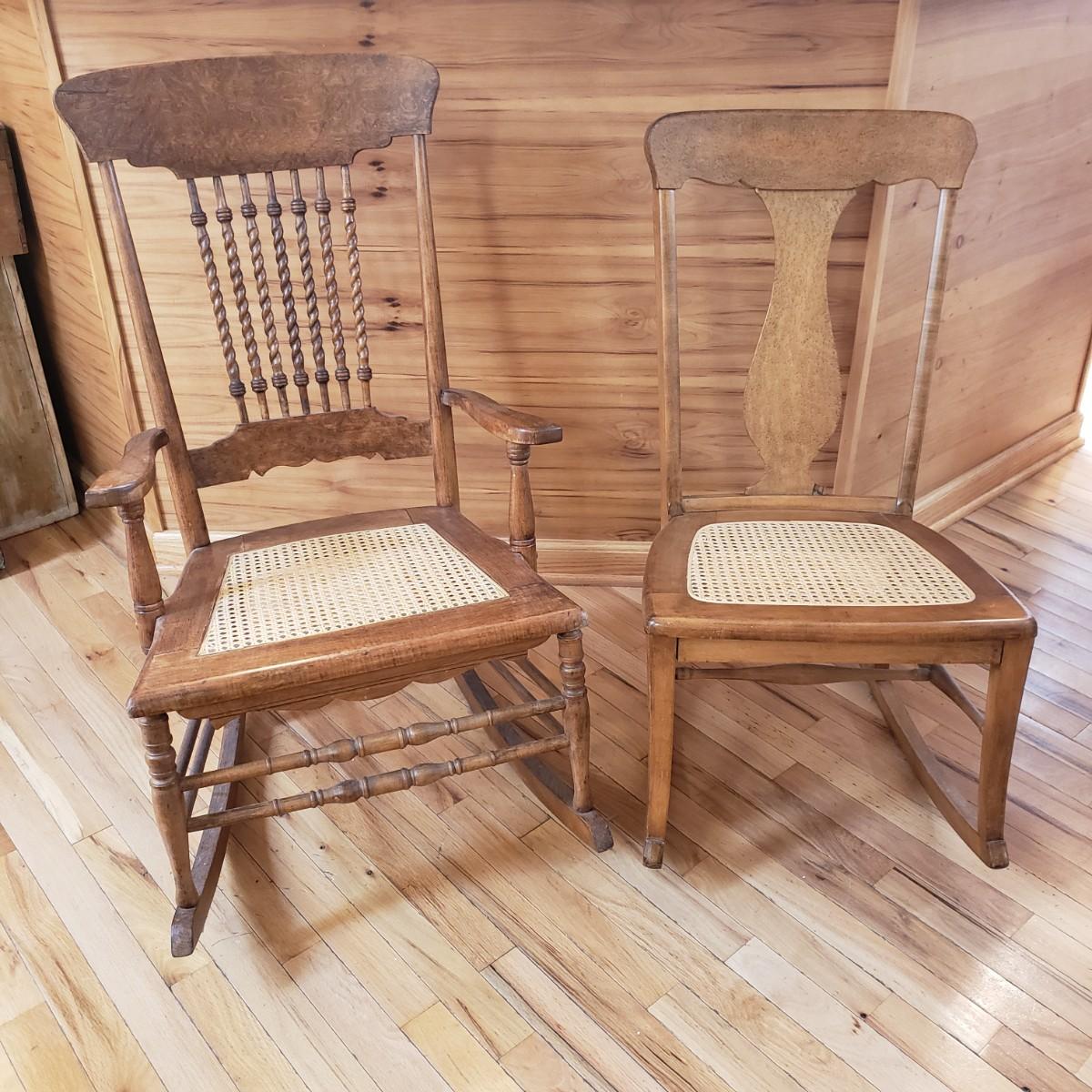 These two wood with cane seat rocking chairs are perfect for relaxing. They both feel sturdy when sitting and rocking. The rocker with armrests measures 32" x 20" x 37"H with the seat 16" from the ground. The other rocker measures 26" x 17" x 34"H with the seat 14" from the ground.