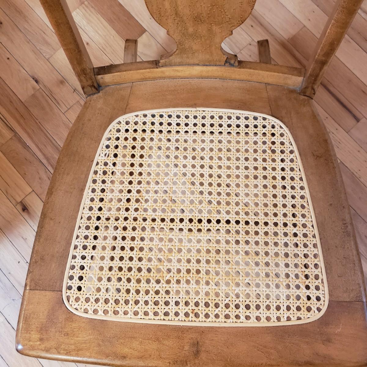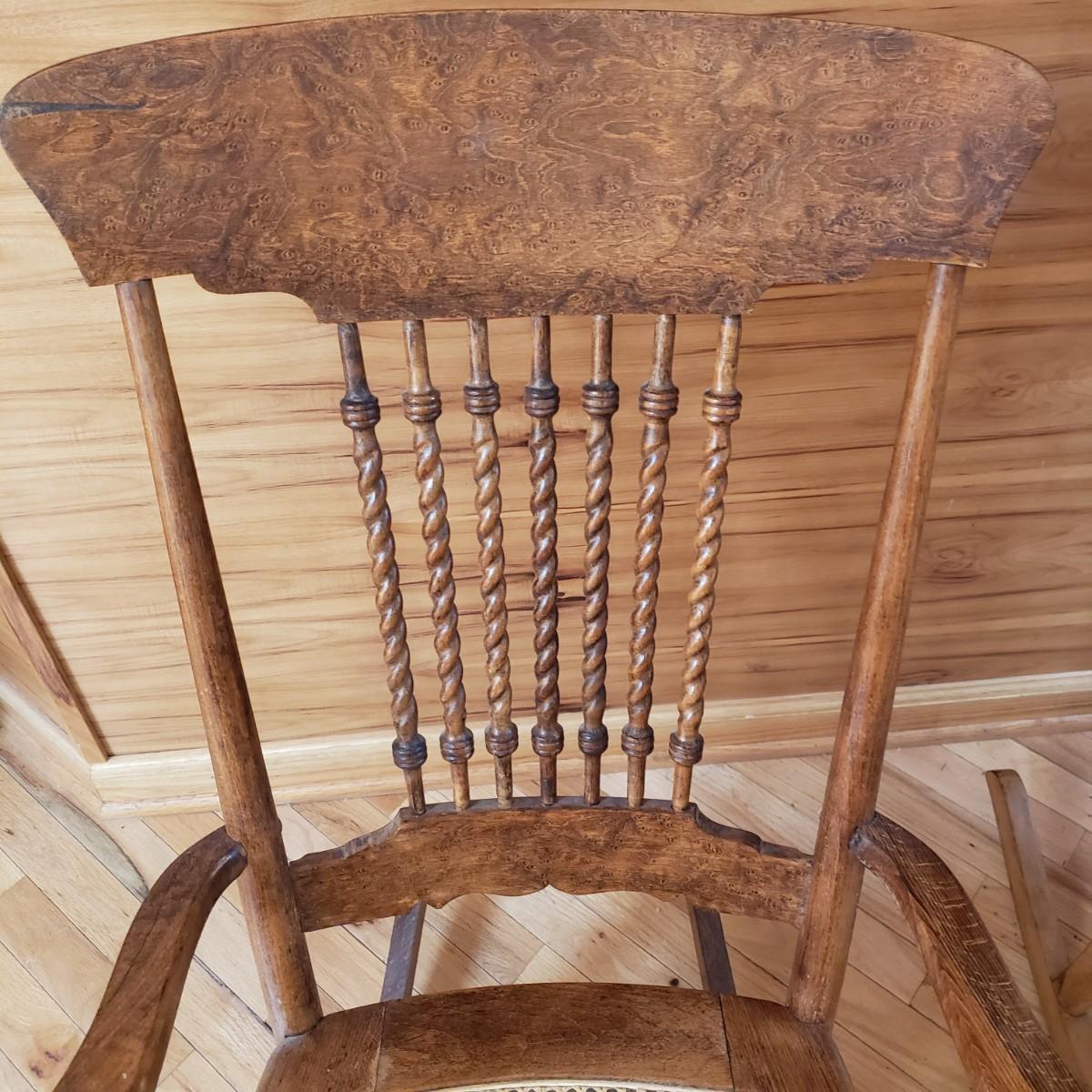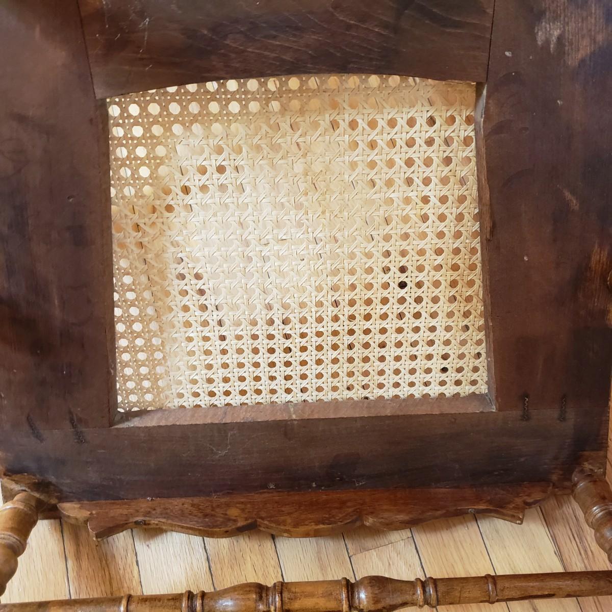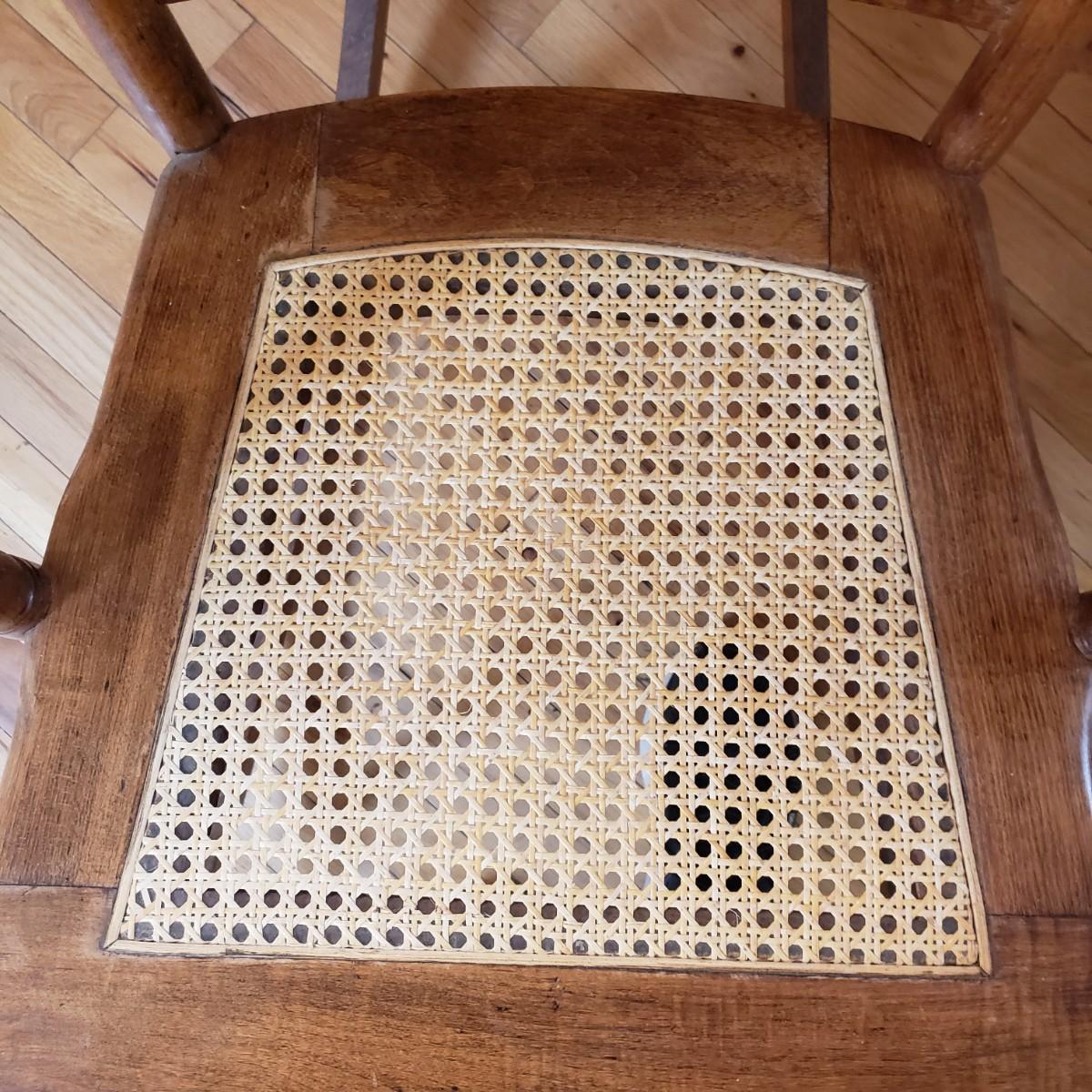 These two wood with cane seat rocking chairs are perfect for relaxing. They both feel sturdy when sitting and rocking. The rocker with armrests measures 32" x 20" x 37"H with the seat 16" from the ground. The other rocker measures 26" x 17" x 34"H with the seat 14" from the ground.