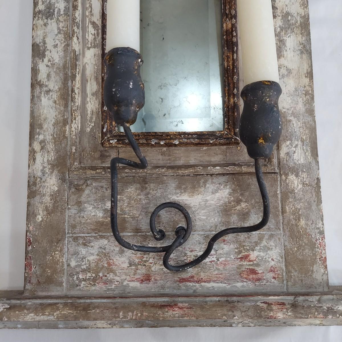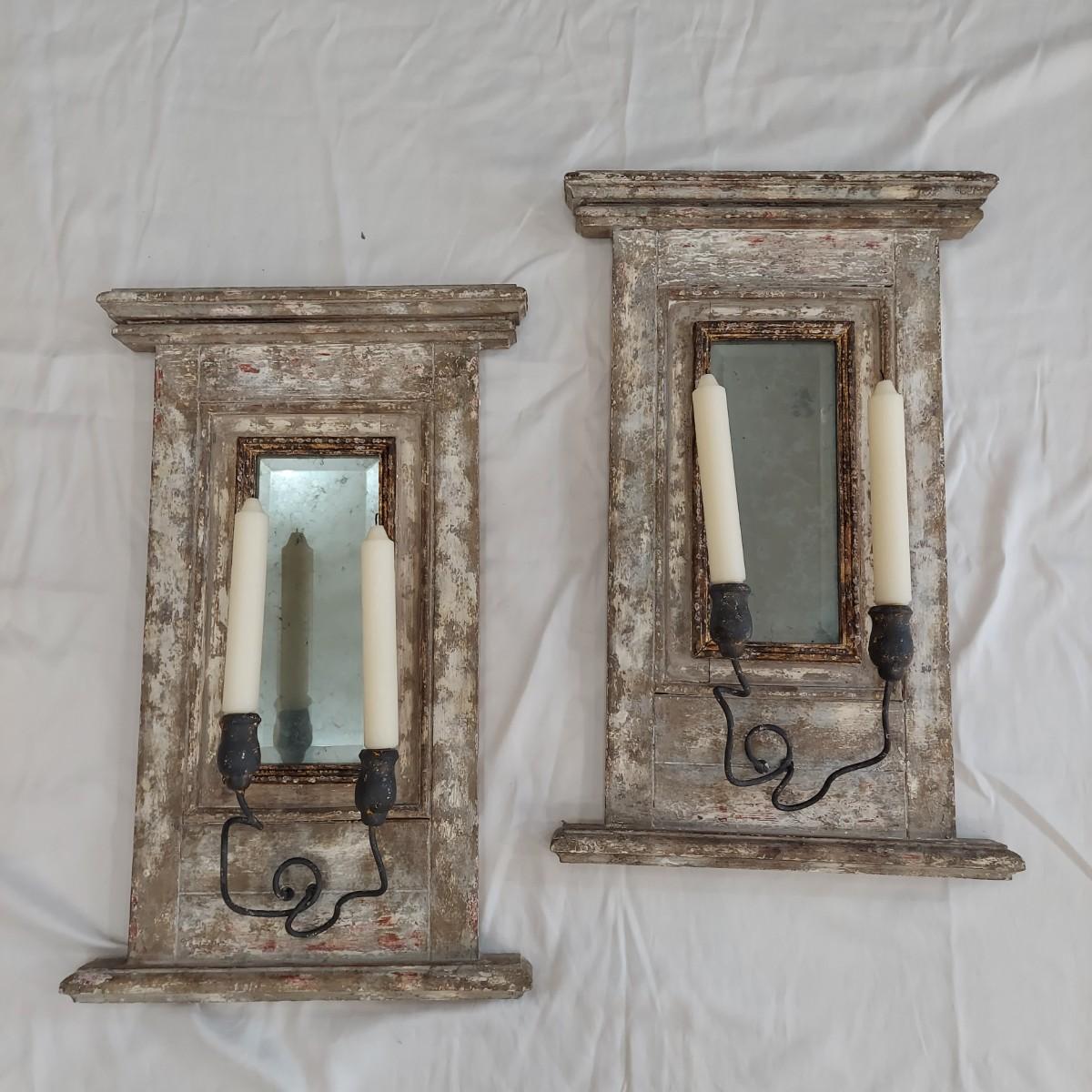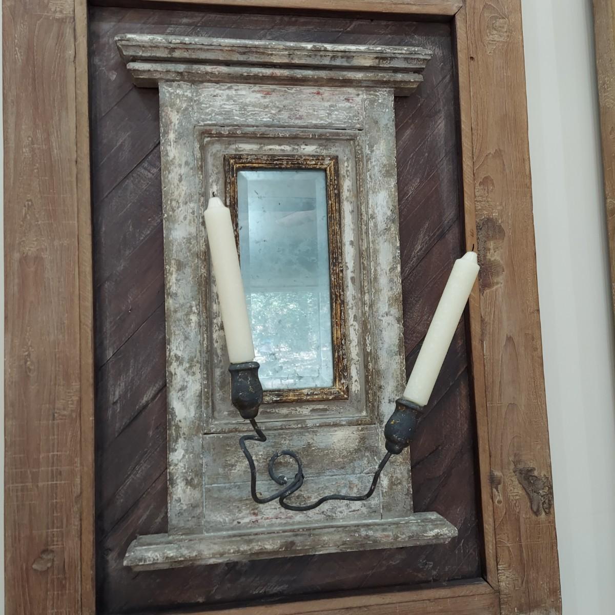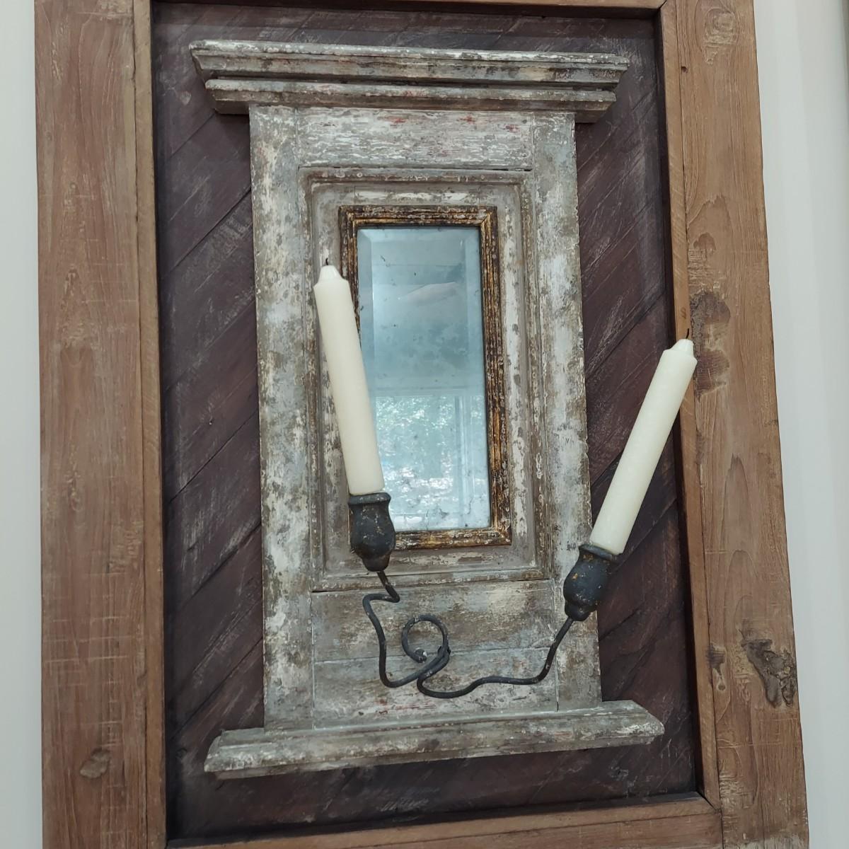 Lot of two wooden wall sconces with mirror backgrounds. Candle holders are metal. They appear to be wrought iron. One of the sets of candle holders is a little loose. Can possibly be tightened in the back. Please see photos. They each measure approximately 17" x 2" x 28"H. They are shown individually hanging on the rustic doors being sold in another lot in this sale, and therefore are not included with these sconces. Shipping available. Shipping can be costly. We suggest calling our local UPS with dimensions and getting an estimate before bidding: (828) 252-6930