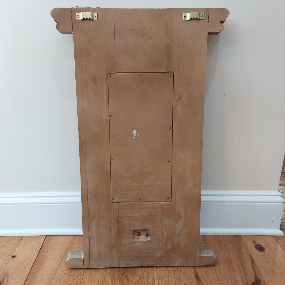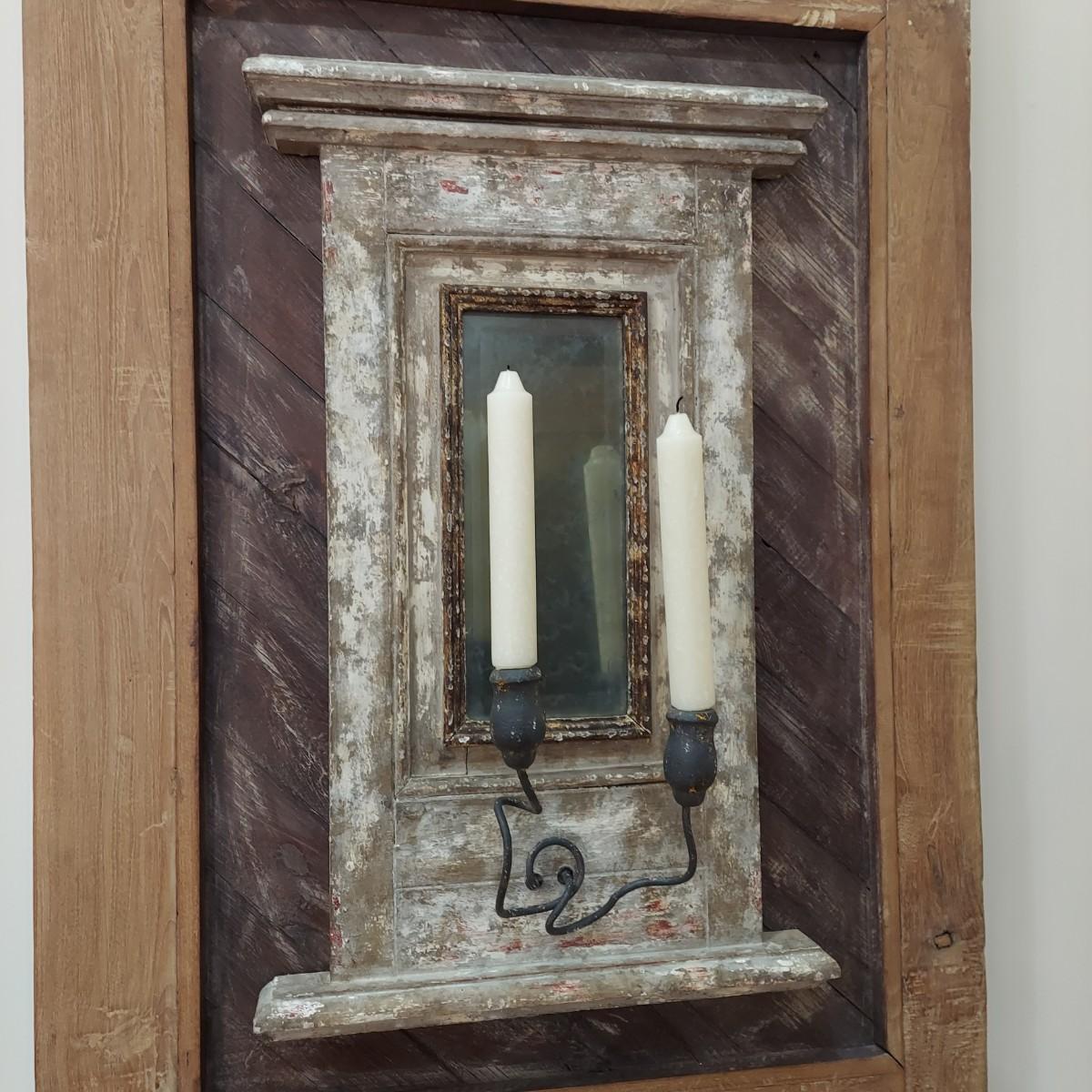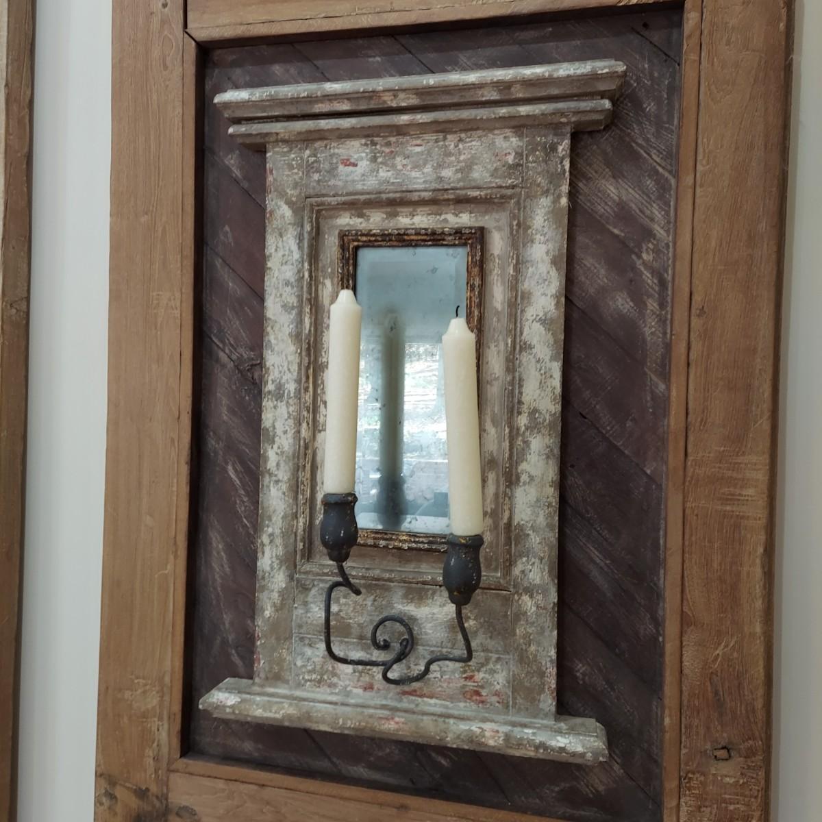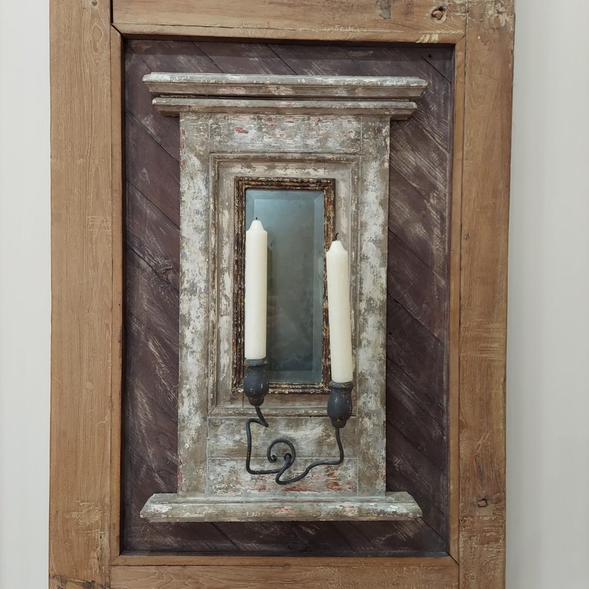 Lot of two wooden wall sconces with mirror backgrounds. Candle holders are metal. They appear to be wrought iron. One of the sets of candle holders is a little loose. Can possibly be tightened in the back. Please see photos. They each measure approximately 17" x 2" x 28"H. They are shown individually hanging on the rustic doors being sold in another lot in this sale, and therefore are not included with these sconces. Shipping available. Shipping can be costly. We suggest calling our local UPS with dimensions and getting an estimate before bidding: (828) 252-6930