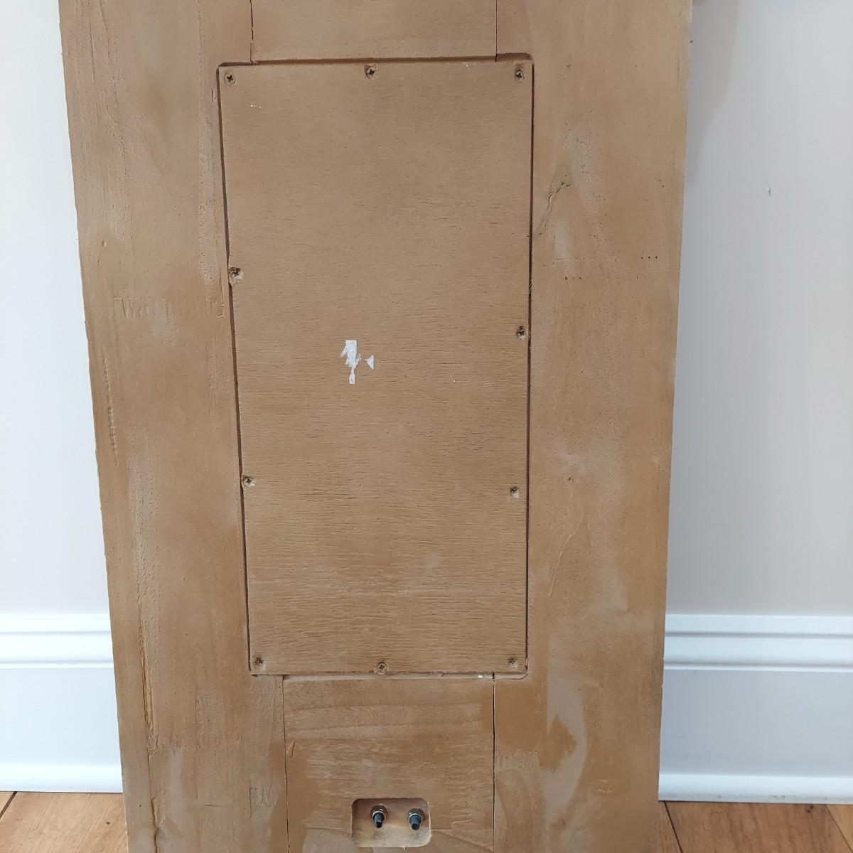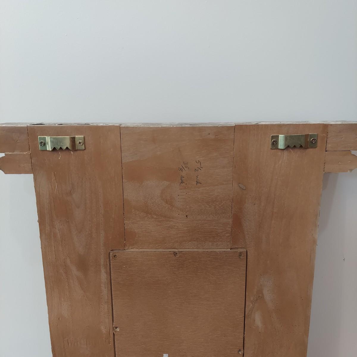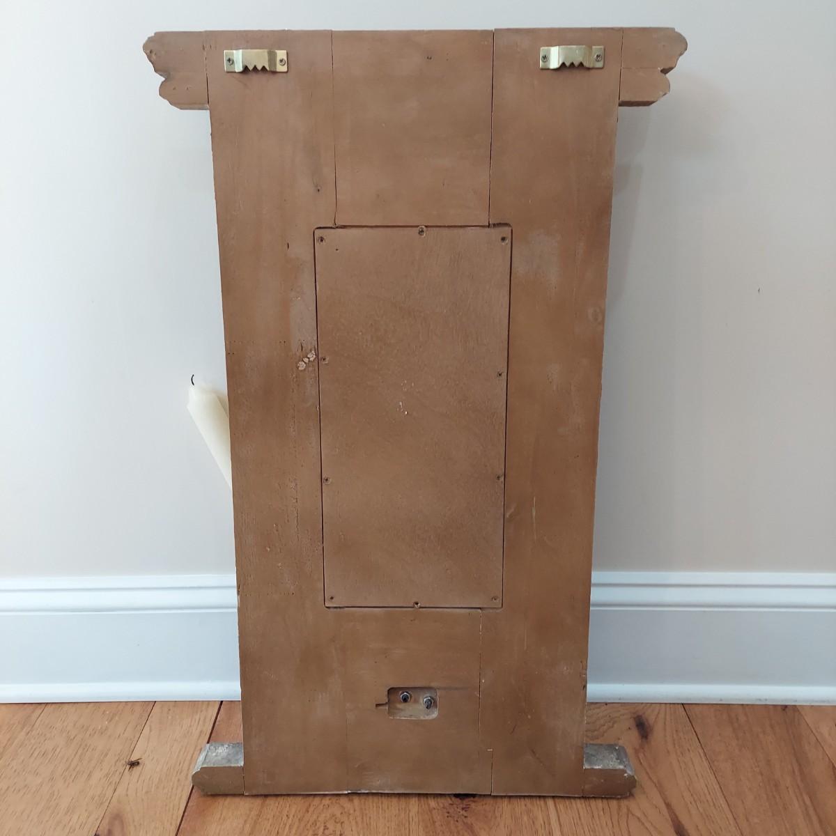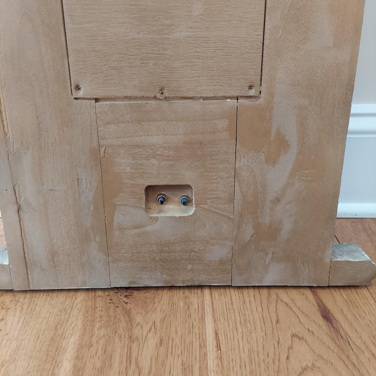 Lot of two wooden wall sconces with mirror backgrounds. Candle holders are metal. They appear to be wrought iron. One of the sets of candle holders is a little loose. Can possibly be tightened in the back. Please see photos. They each measure approximately 17" x 2" x 28"H. They are shown individually hanging on the rustic doors being sold in another lot in this sale, and therefore are not included with these sconces. Shipping available. Shipping can be costly. We suggest calling our local UPS with dimensions and getting an estimate before bidding: (828) 252-6930