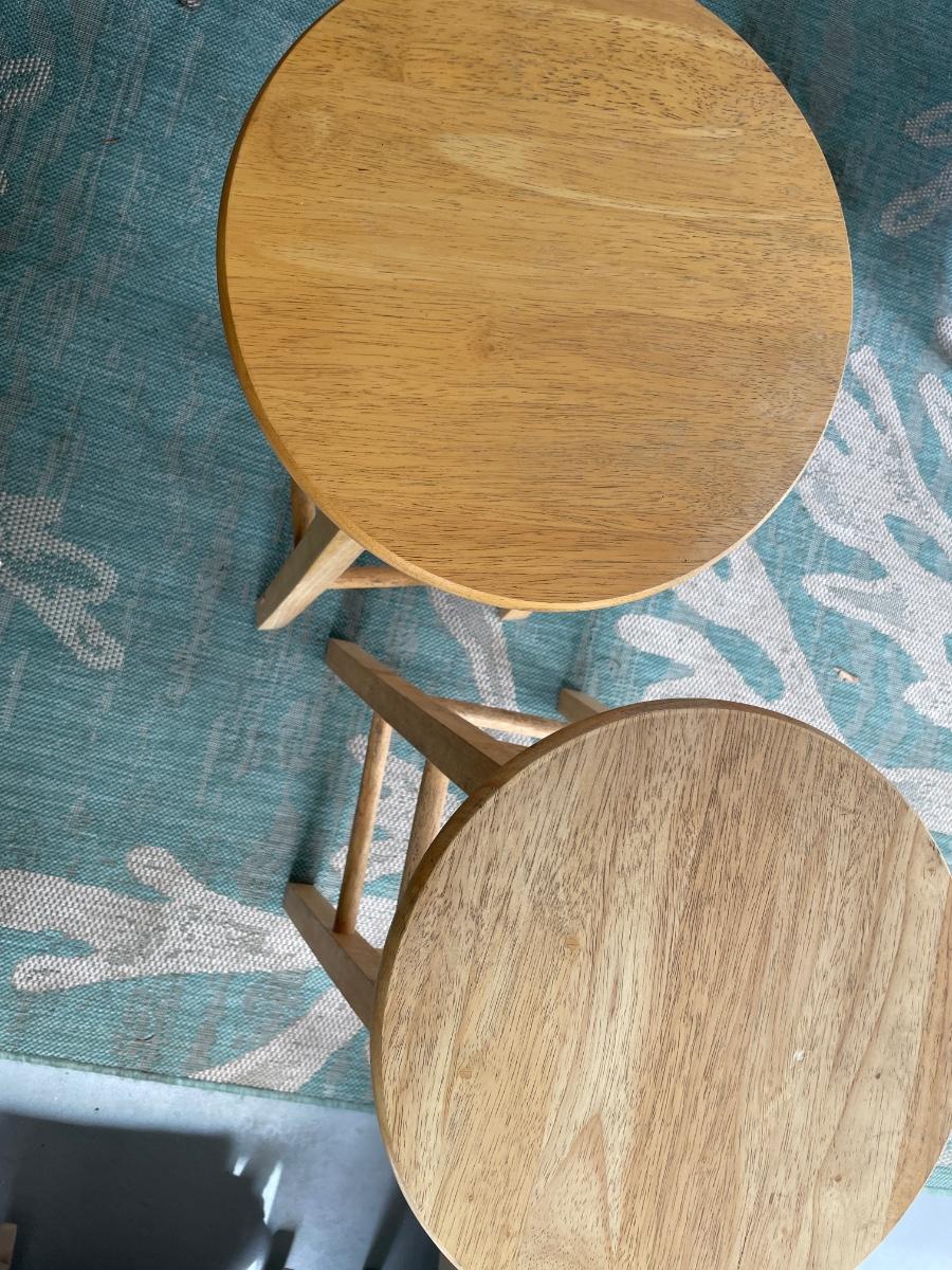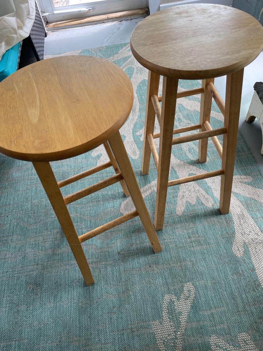 Two wood counter high stools