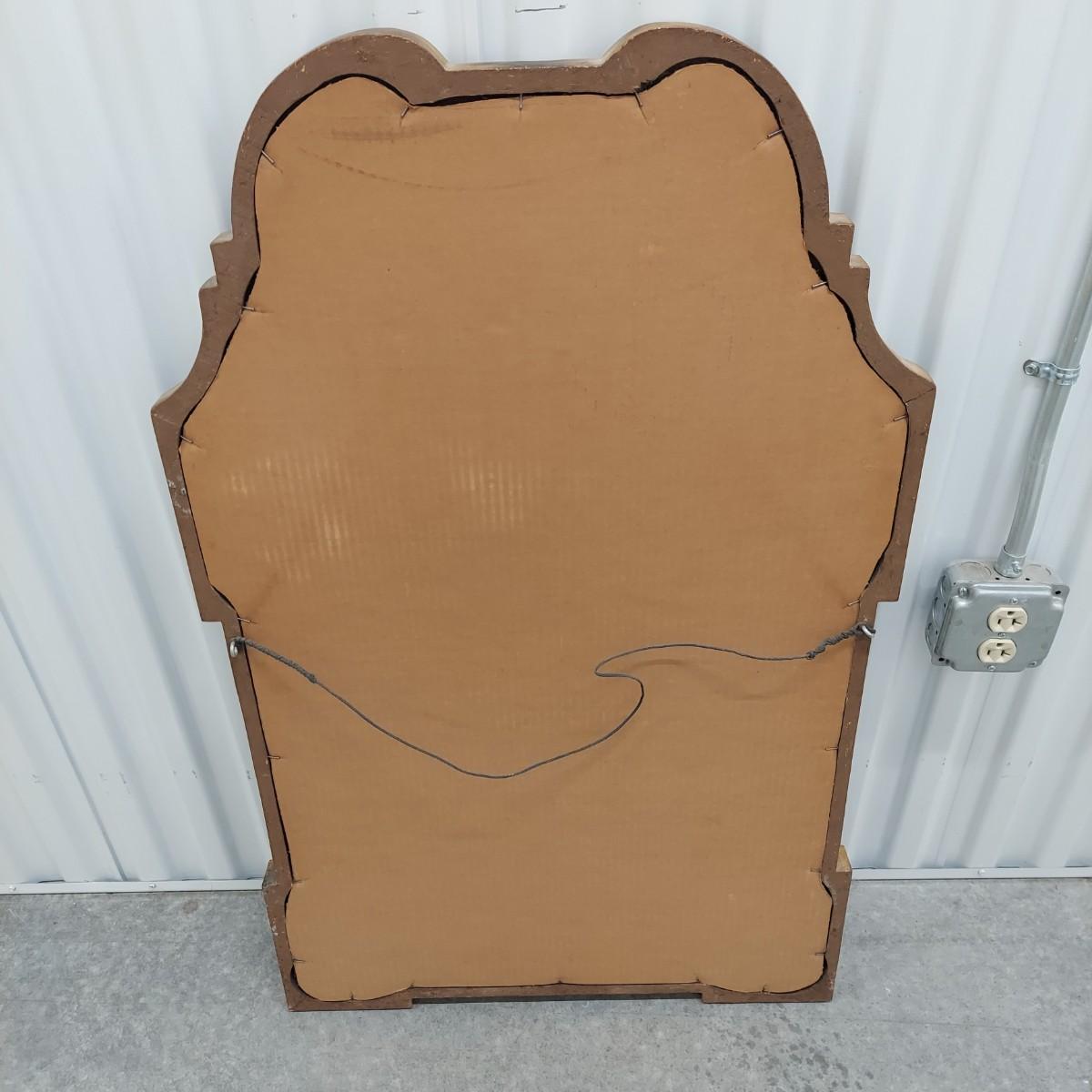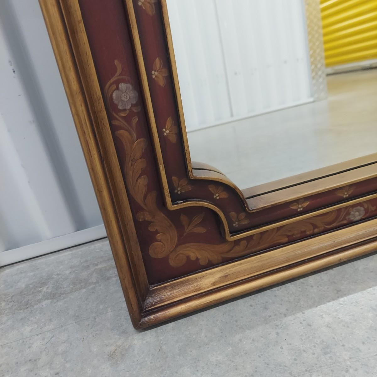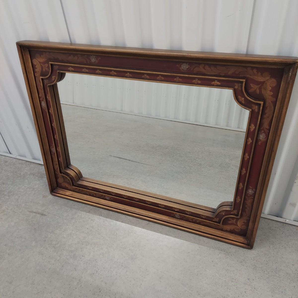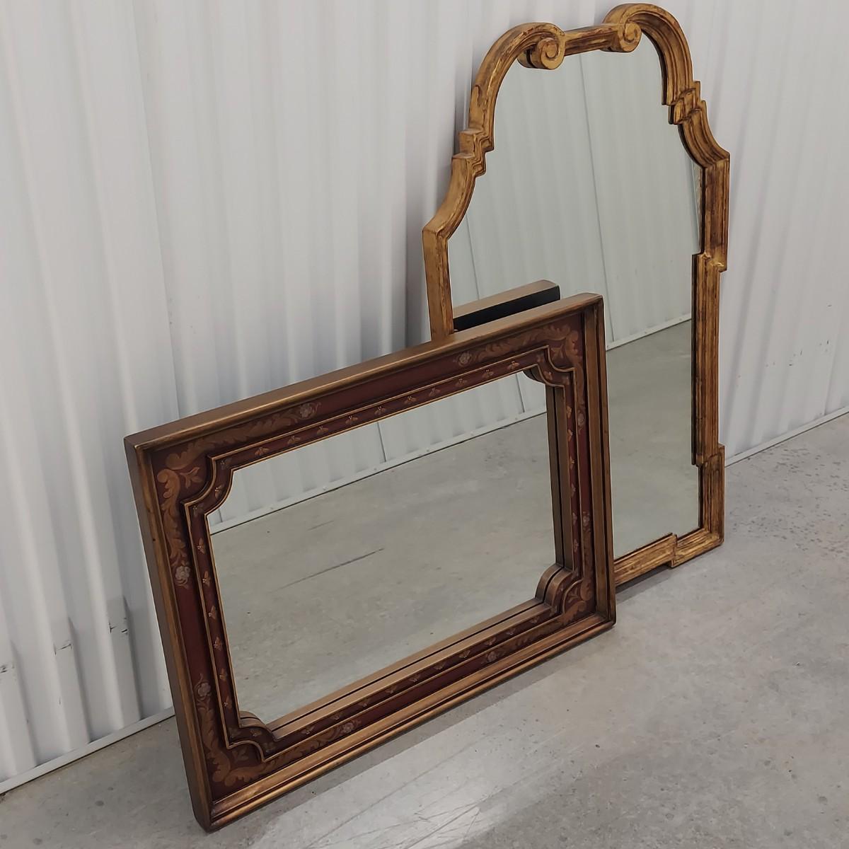 Two large wall hanging mirrors with ornate wooden frames. The gold frame is quite heavy and measures approximately 24” x 40"H. The floral frame can be hung portrait or landscape and measures approximately 32” x 24"H. This one has a label showing that it's from the South Cone Trading Company. Please see photos for details. Local Pickup Only