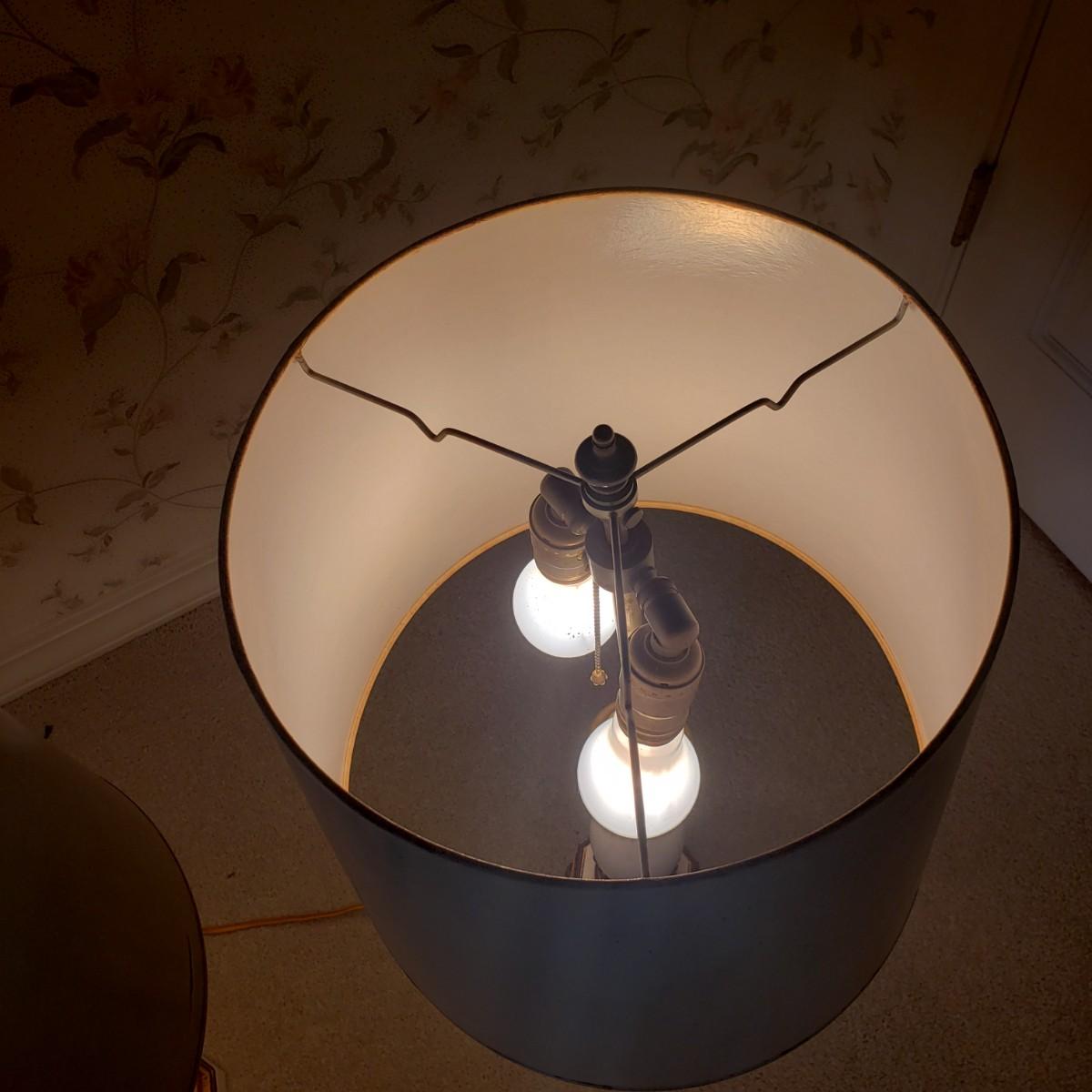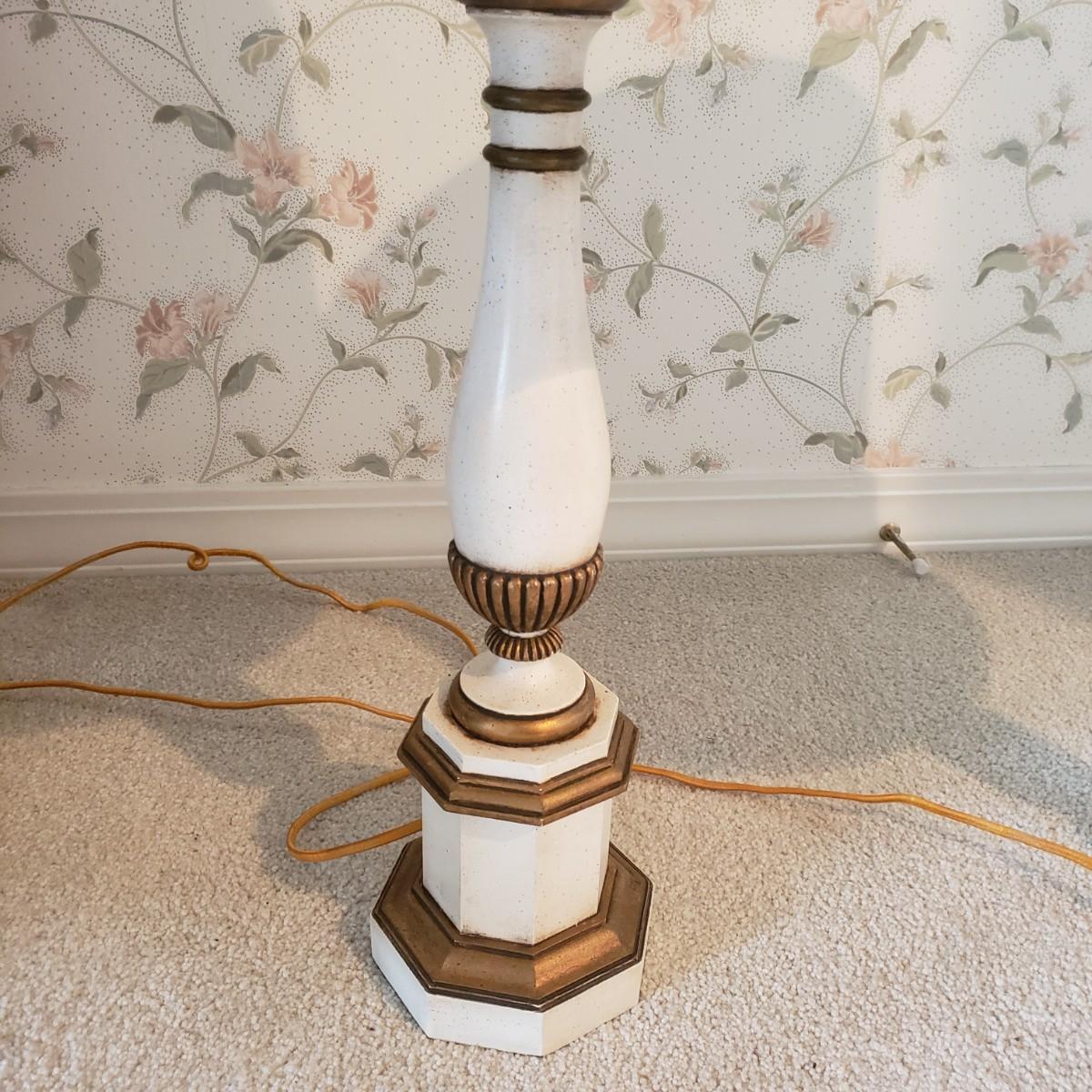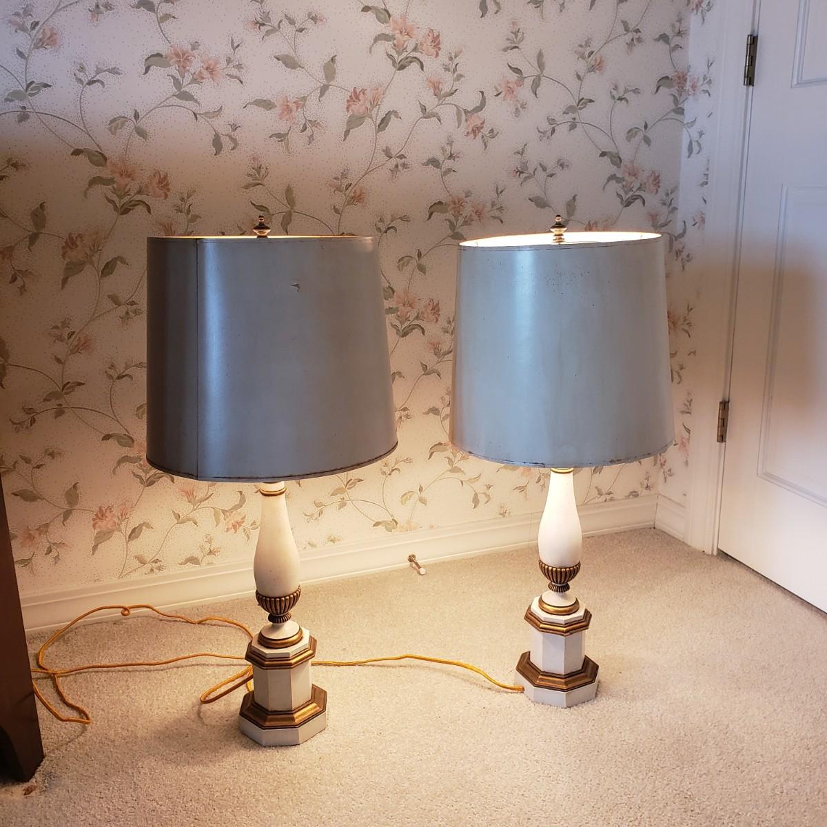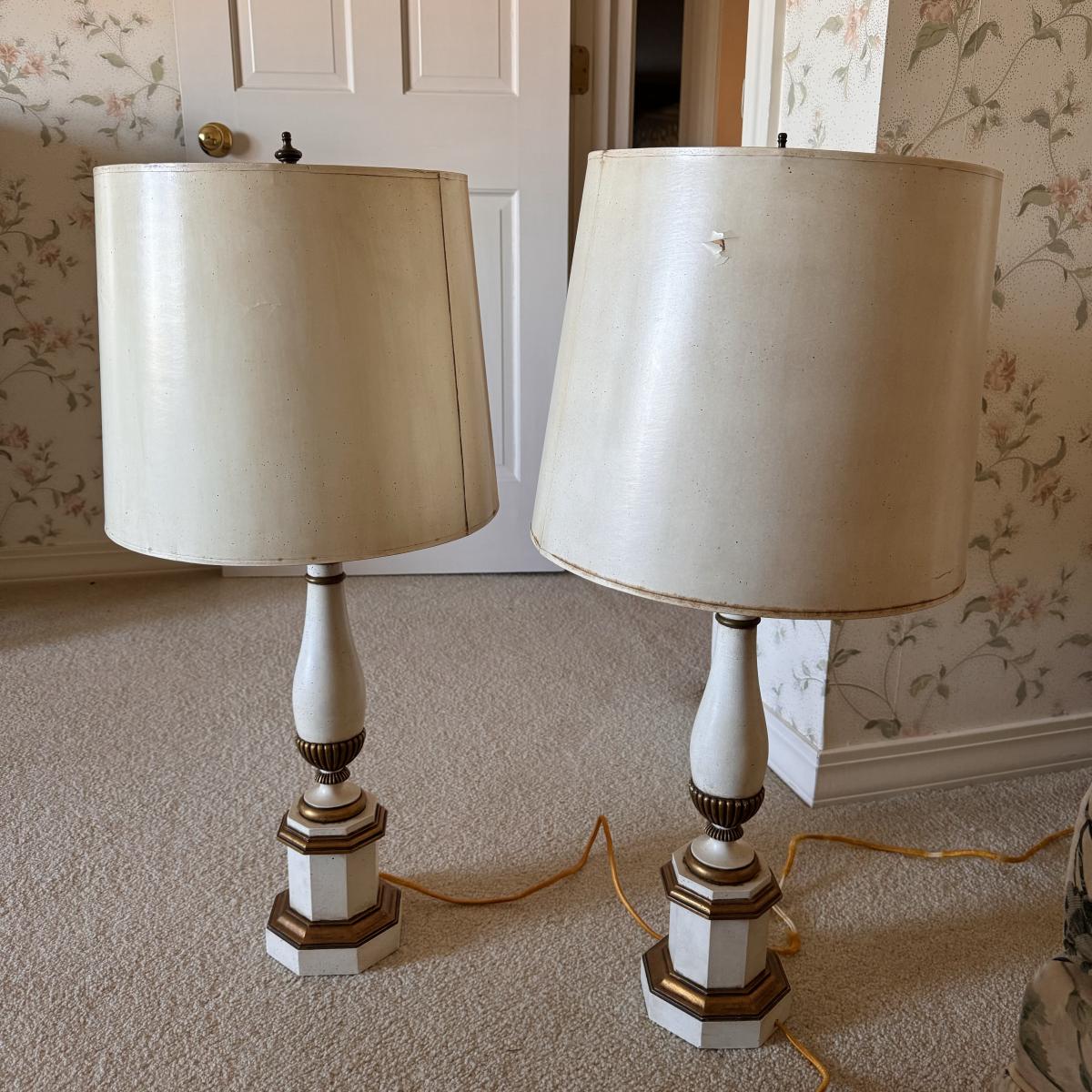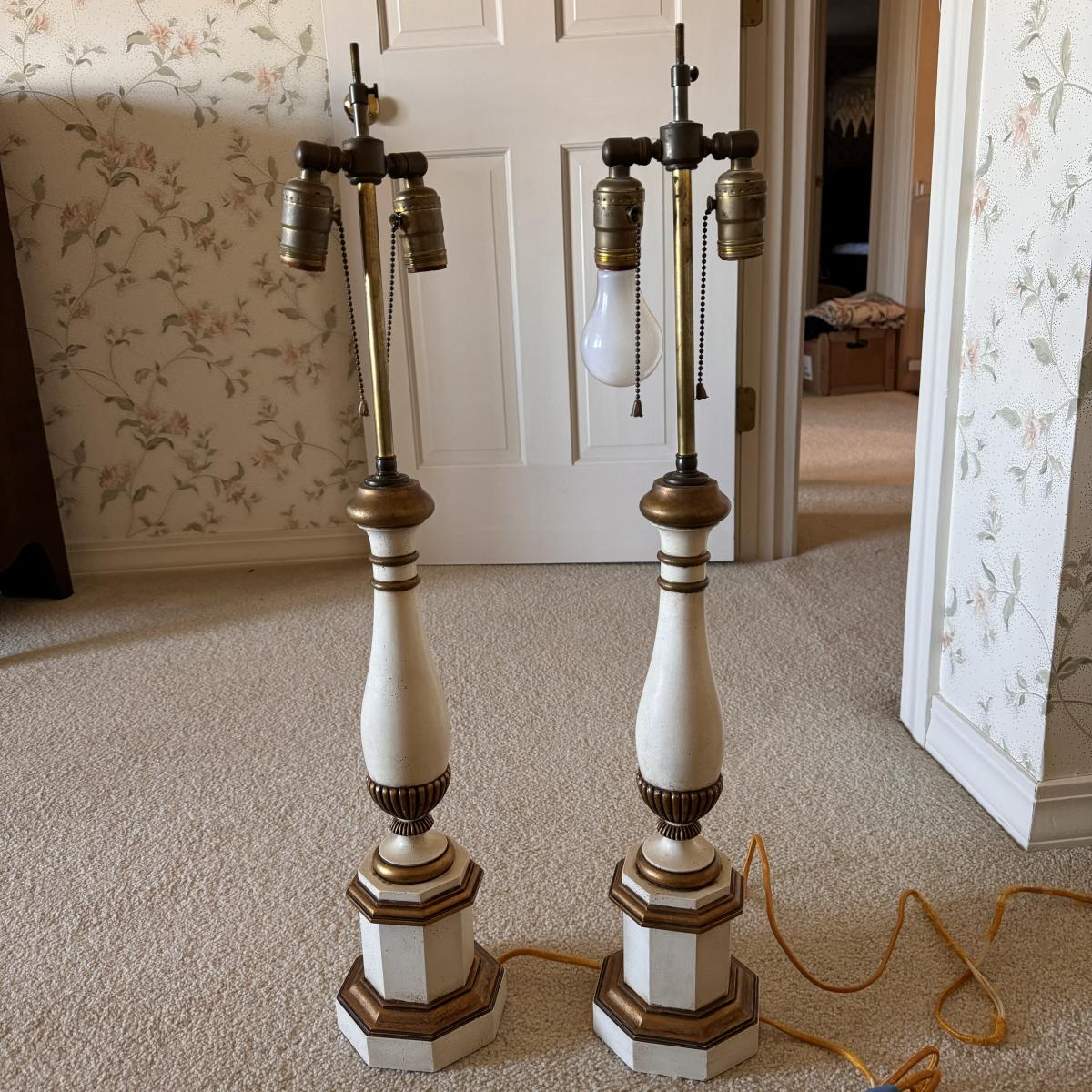These matching lamps have two pull chain bulbs in each. They both power on when plugged in. The bases are wood painted with white/Gold with hints of black. The cords are old and very long. The shades are a thick paper with black specks. They do show their age in places along the rim, plus a small blemish on one shade, but that can be easily fixed by turning the shade! The lamp with shade measures 30". The shade itself measures 12" x 12" D.