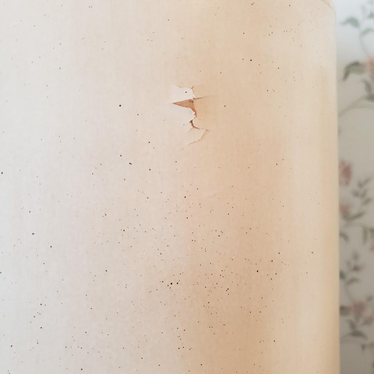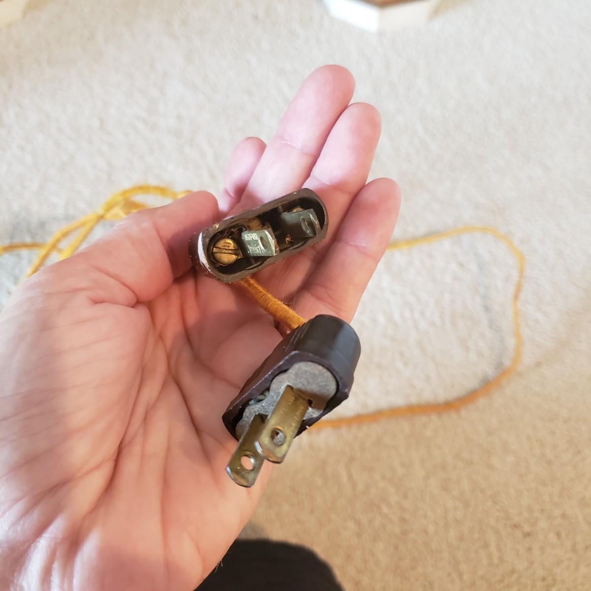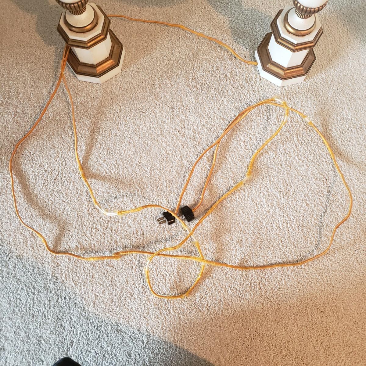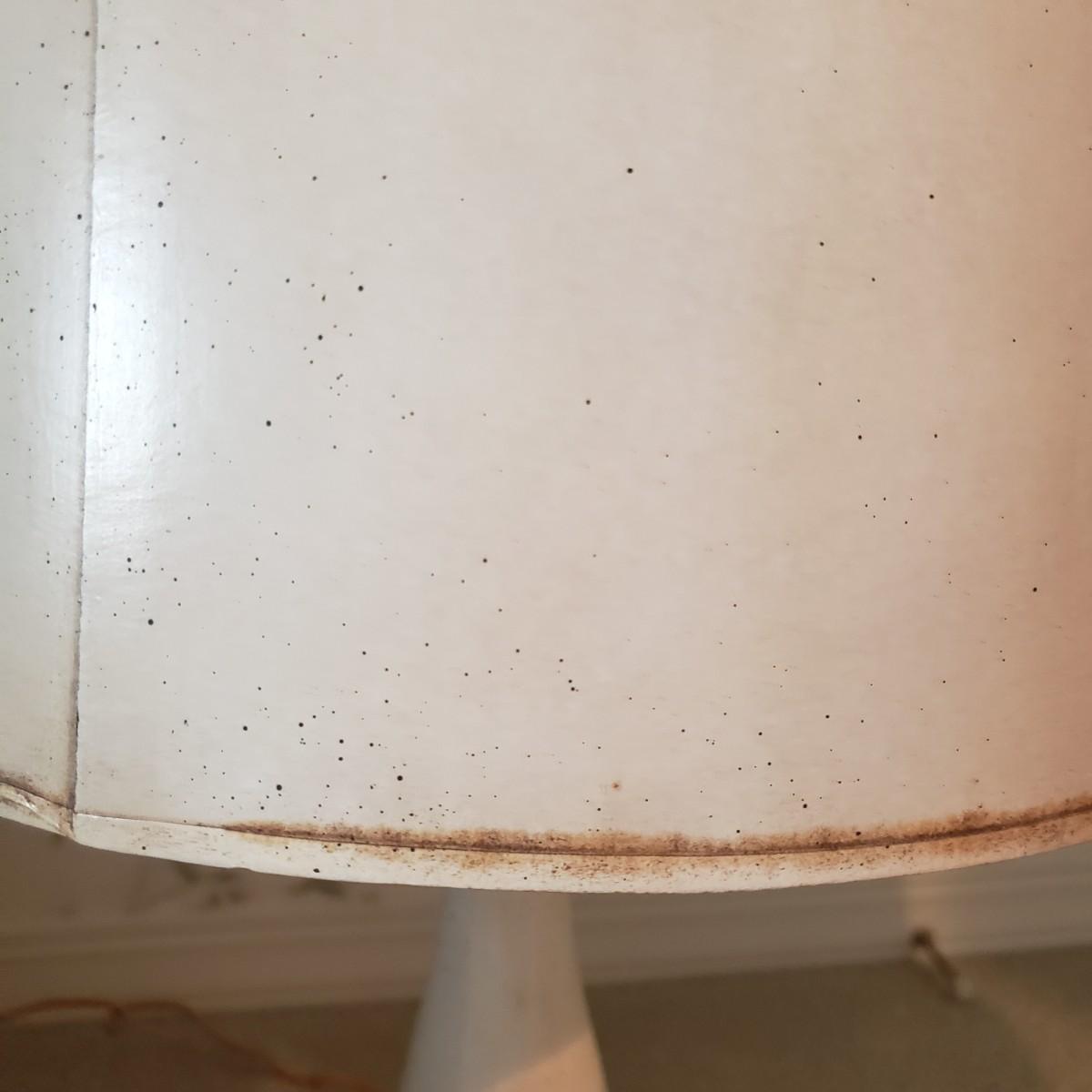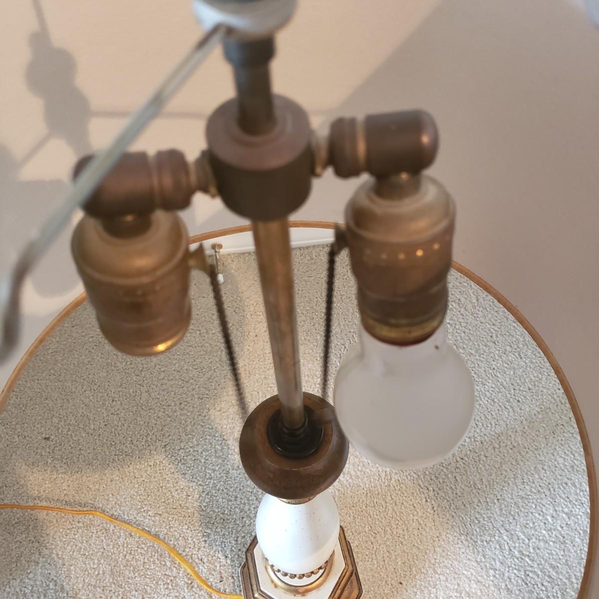 These matching lamps have two pull chain bulbs in each. They both power on when plugged in. The bases are wood painted with white/Gold with hints of black. The cords are old and very long. The shades are a thick paper with black specks. They do show their age in places along the rim, plus a small blemish on one shade, but that can be easily fixed by turning the shade! The lamp with shade measures 30". The shade itself measures 12" x 12" D.