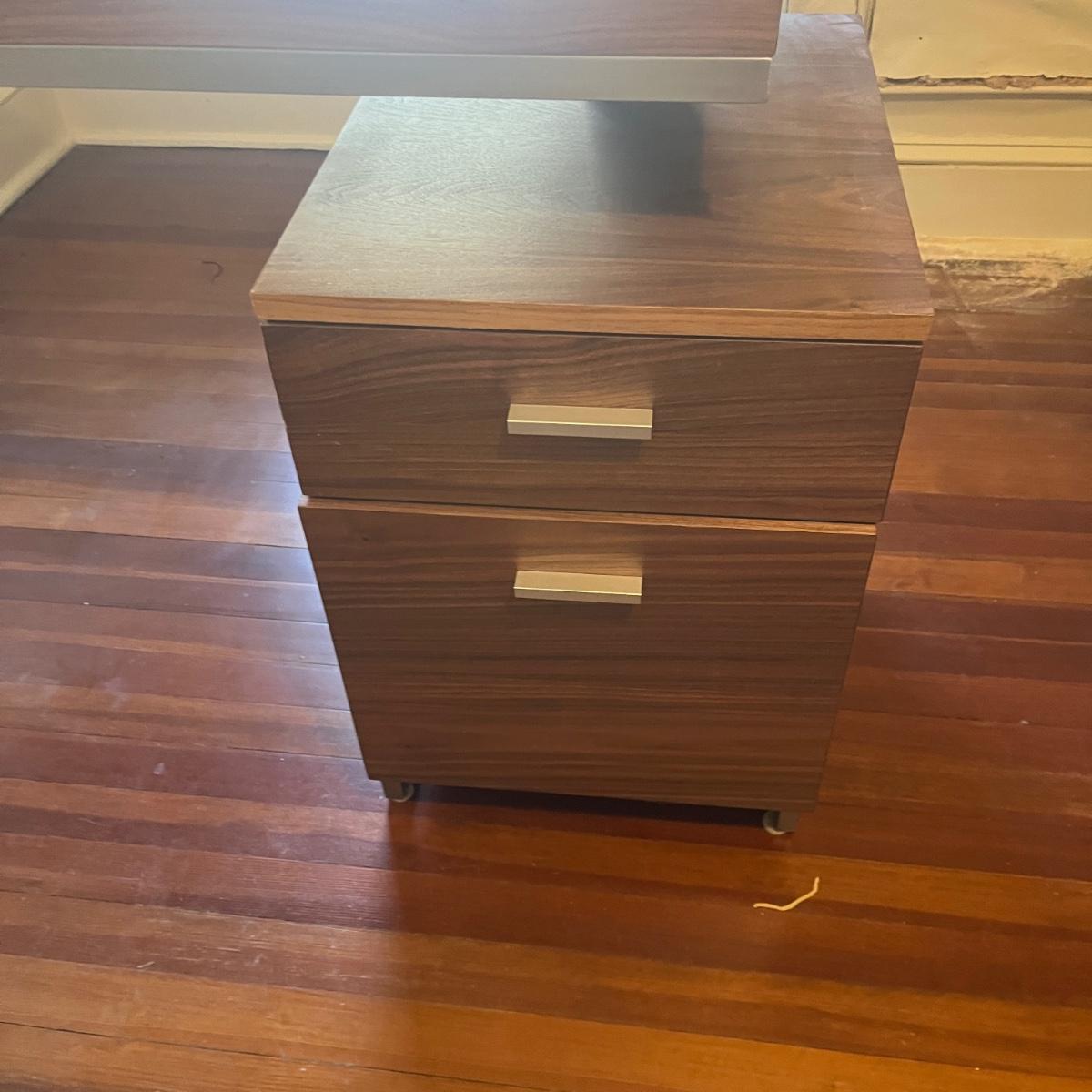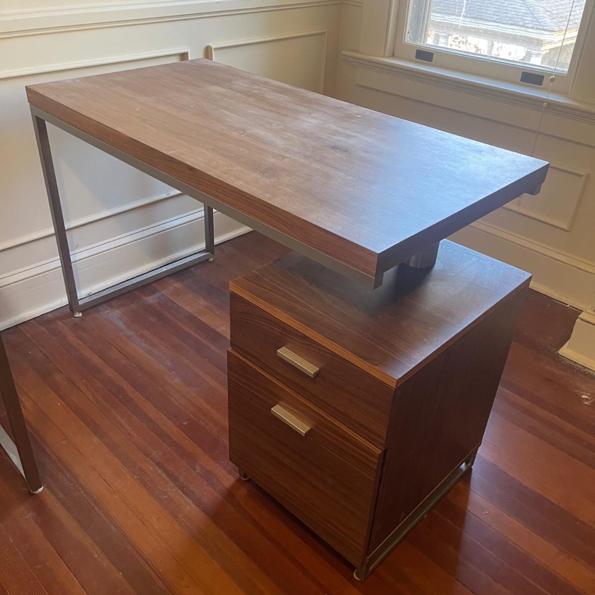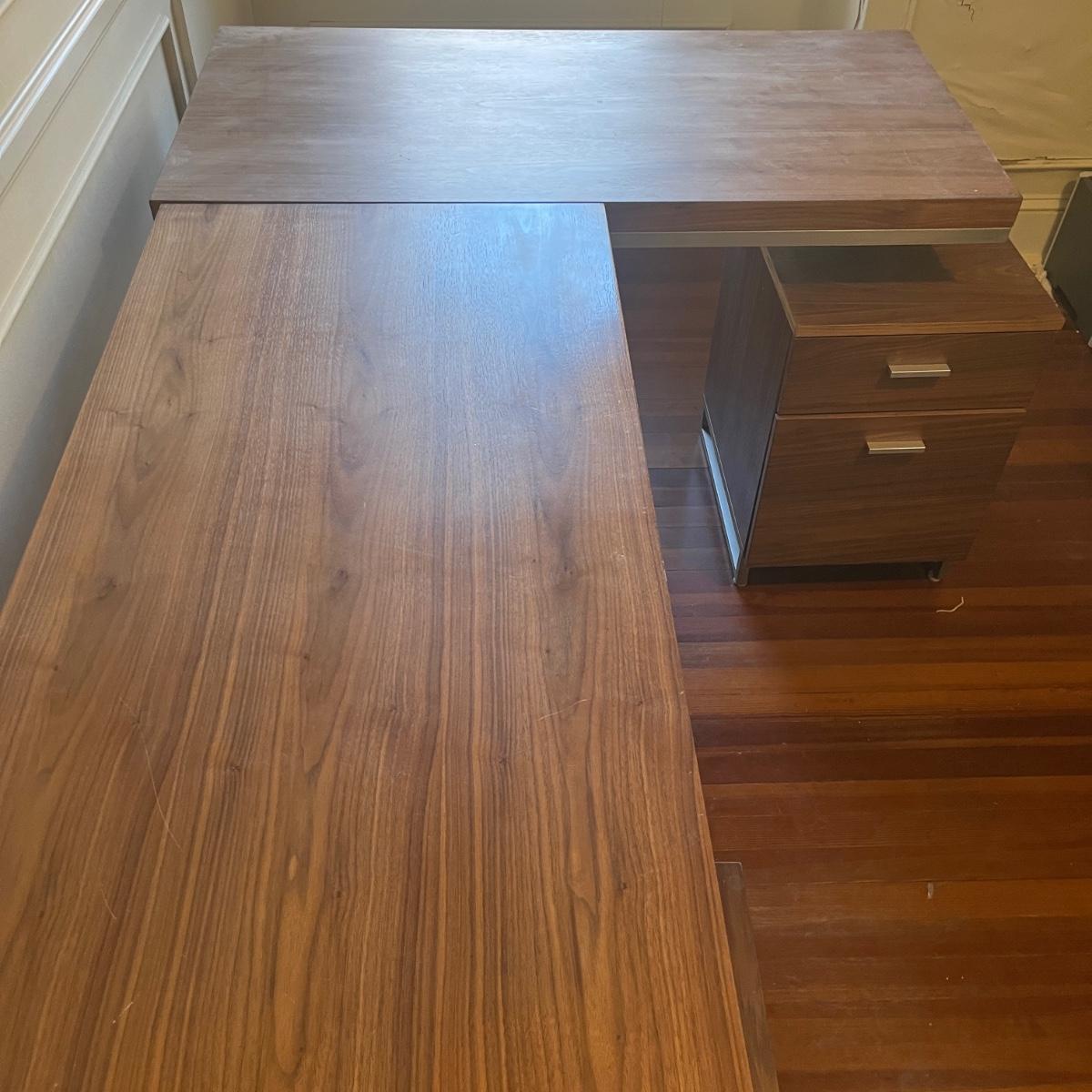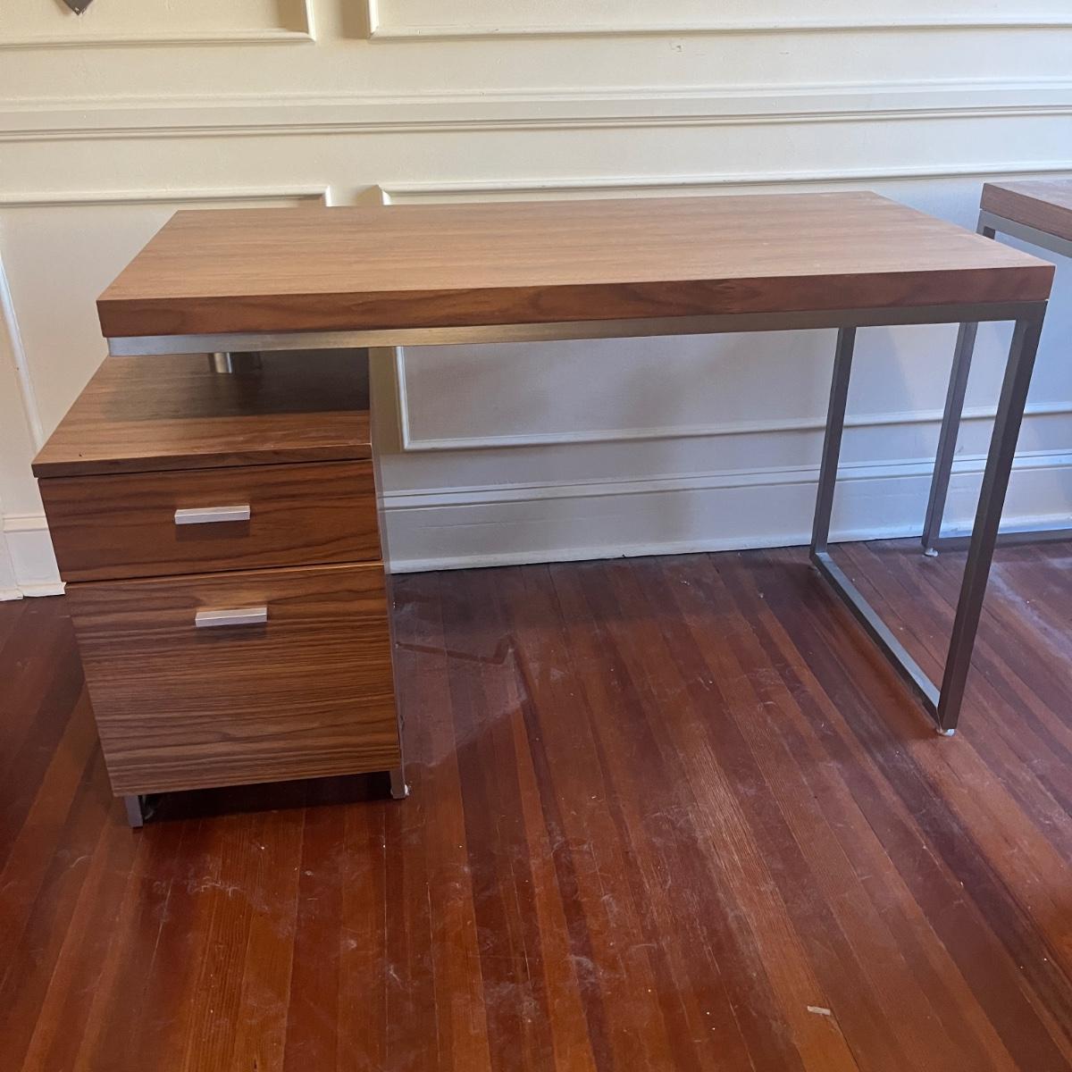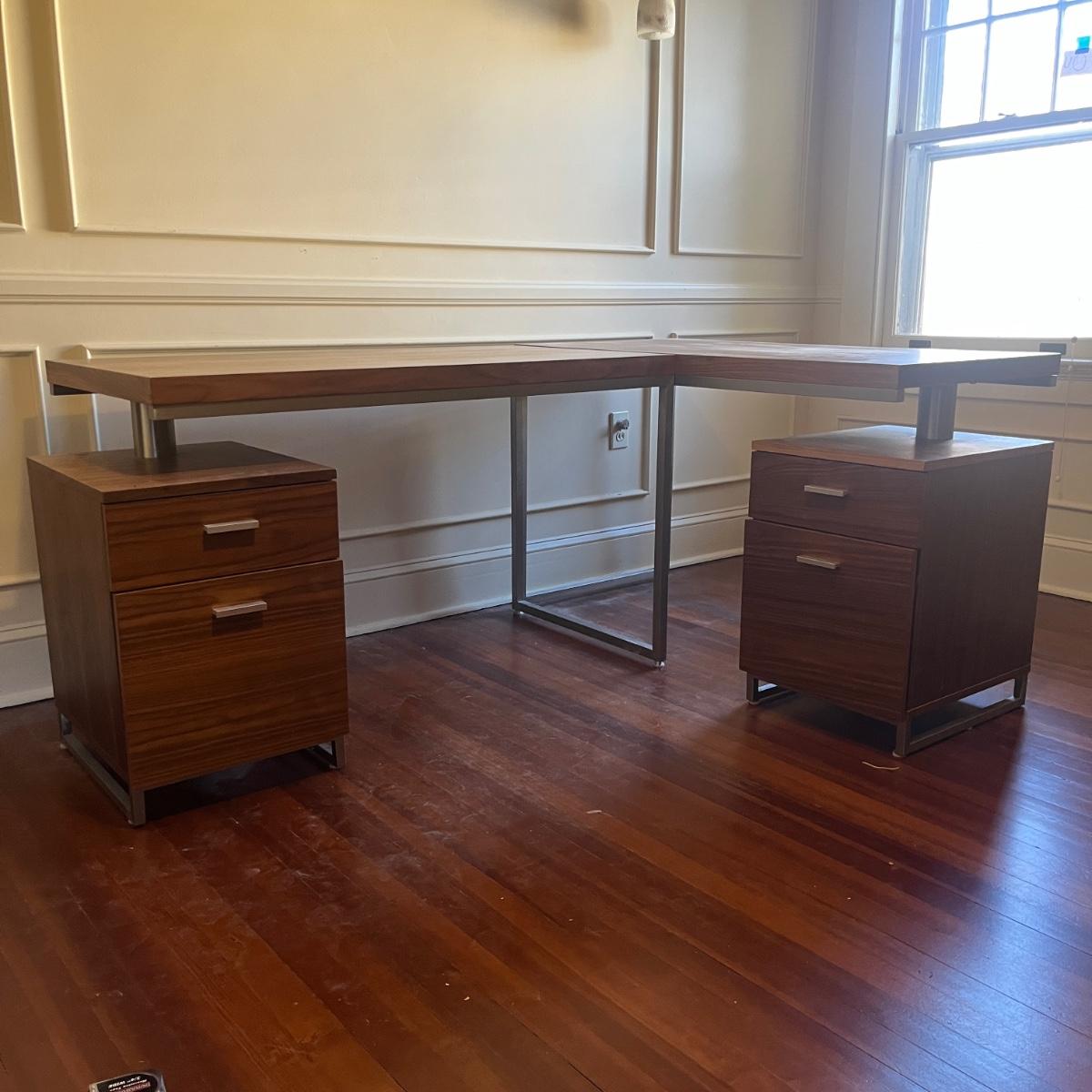 These unique desks have a metal frame with veneer wood top and attached file cabinets with veneer wood. Each desk measure 51” x 26” x 29.5”H. Can be used as two separate desks or pushed together as an L shaped corner desk. Desks are up one flight of stairs. One desk has scratches on top, see pictures. There is an identical desk in this auction.