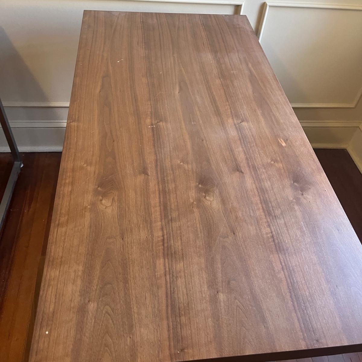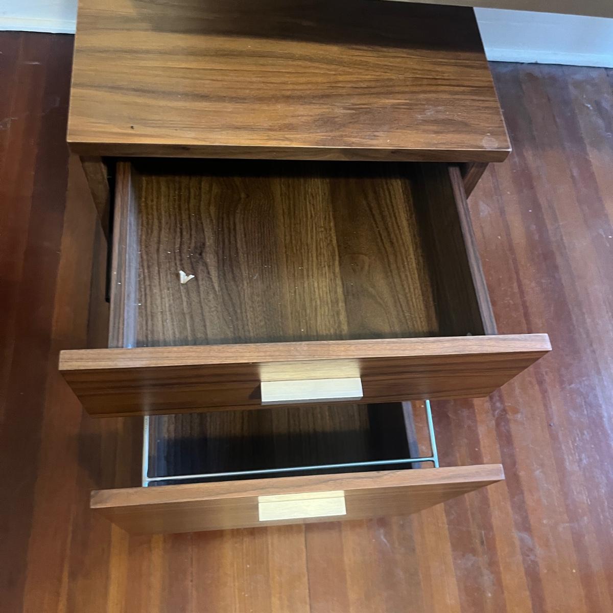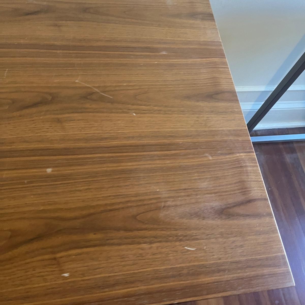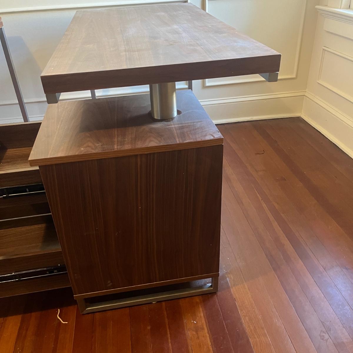 These unique desks have a metal frame with veneer wood top and attached file cabinets with veneer wood. Each desk measure 51” x 26” x 29.5”H. Can be used as two separate desks or pushed together as an L shaped corner desk. Desks are up one flight of stairs. One desk has scratches on top, see pictures. There is an identical desk in this auction.