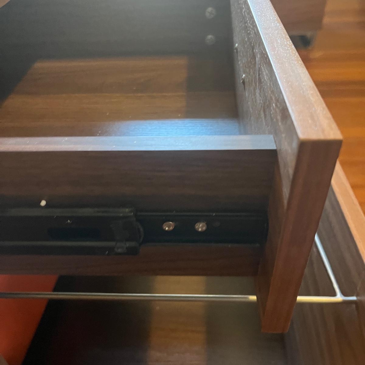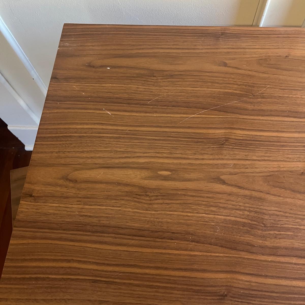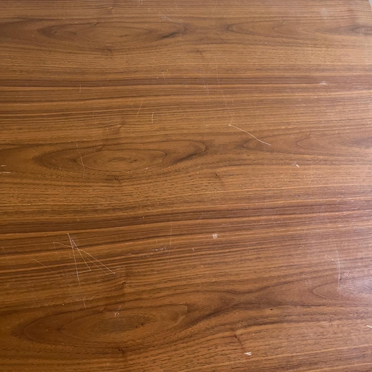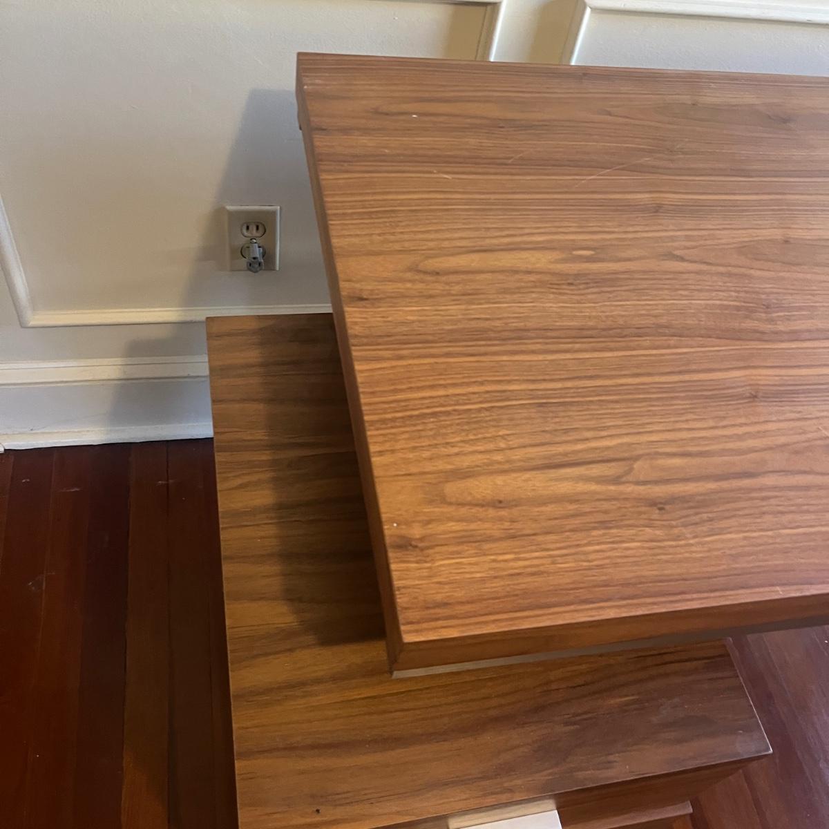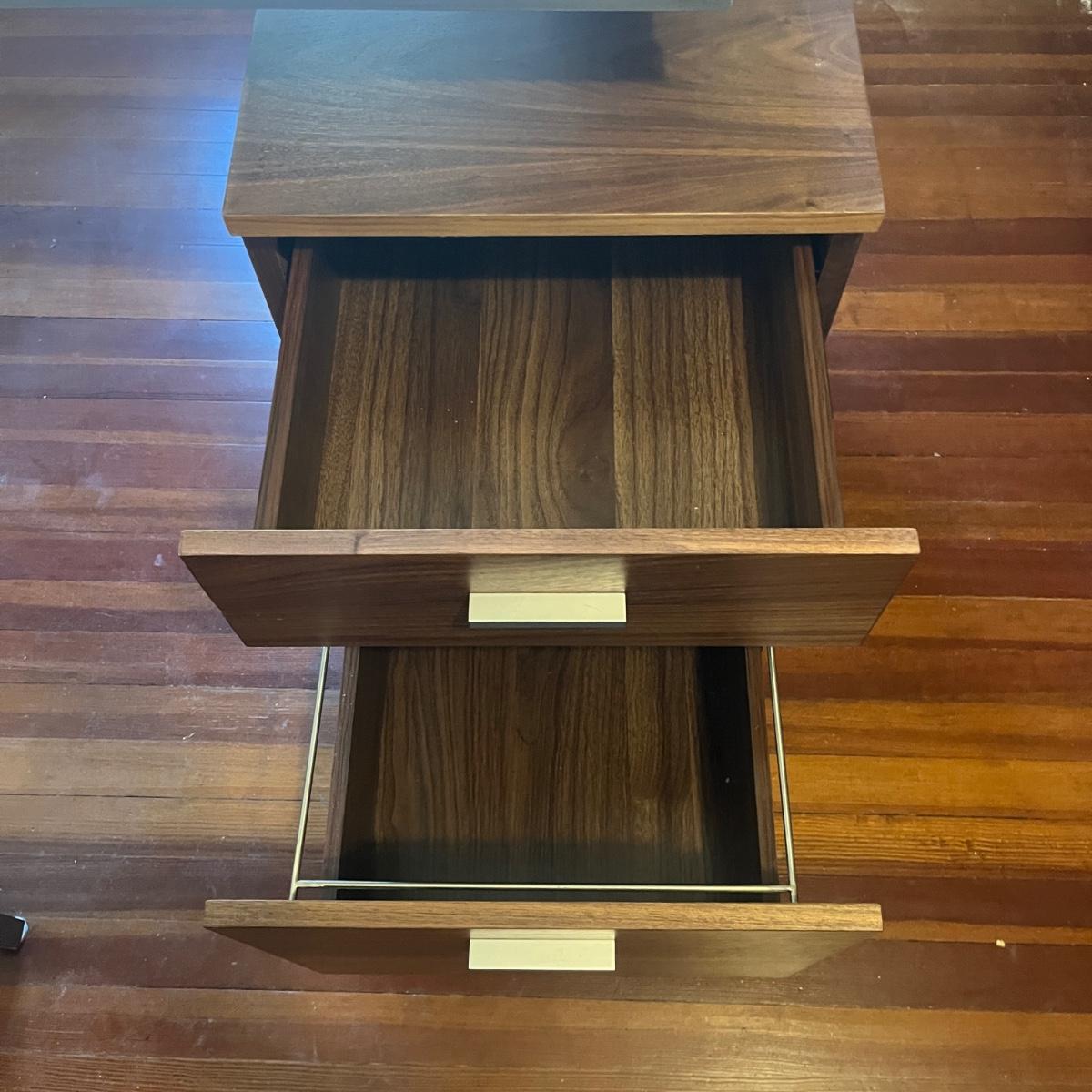 These unique desks have a metal frame with veneer wood top and attached file cabinets with veneer wood. Each desk measure 51” x 26” x 29.5”H. Can be used as two separate desks or pushed together as an L shaped corner desk. Desks are up one flight of stairs. One desk has scratches on top, see pictures. There is an identical desk in this auction.