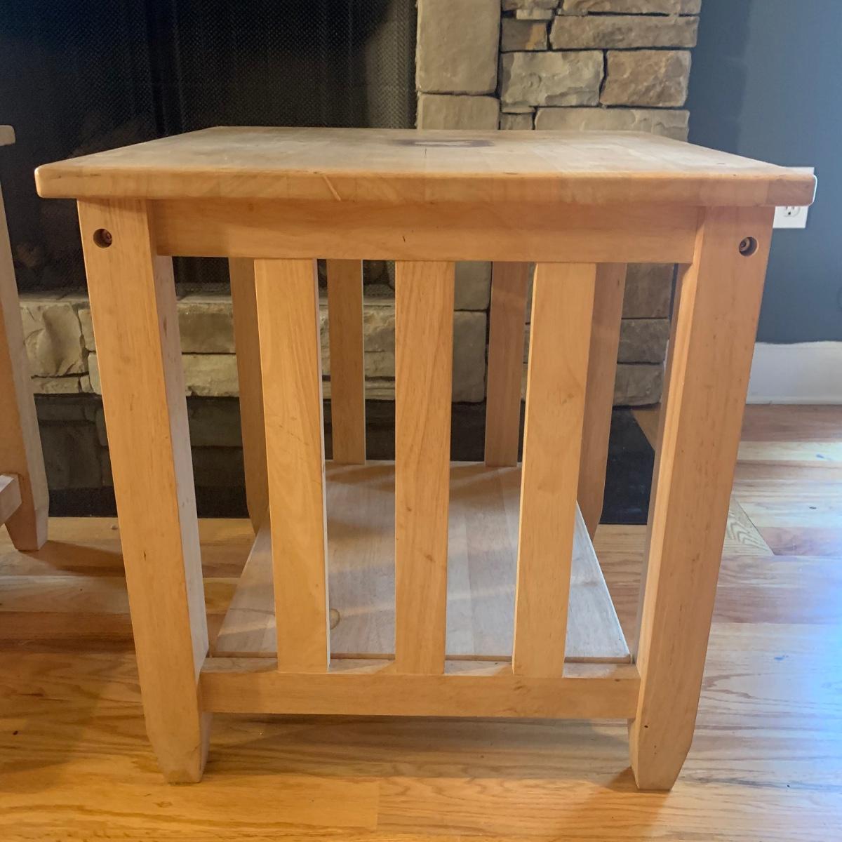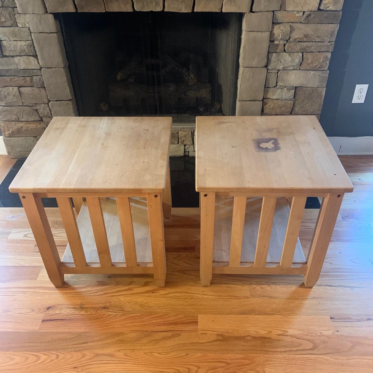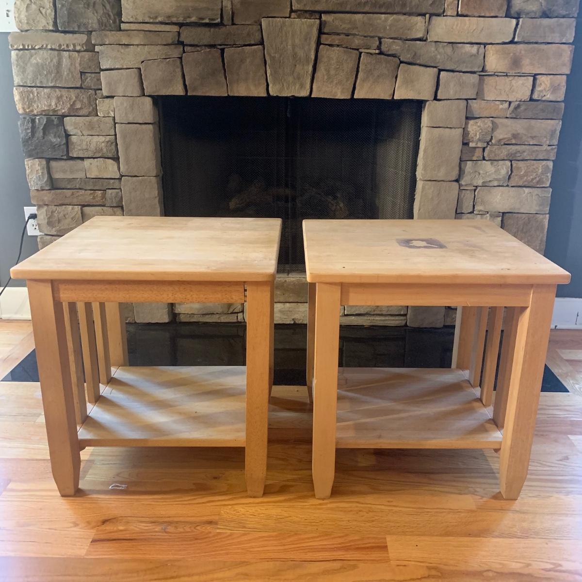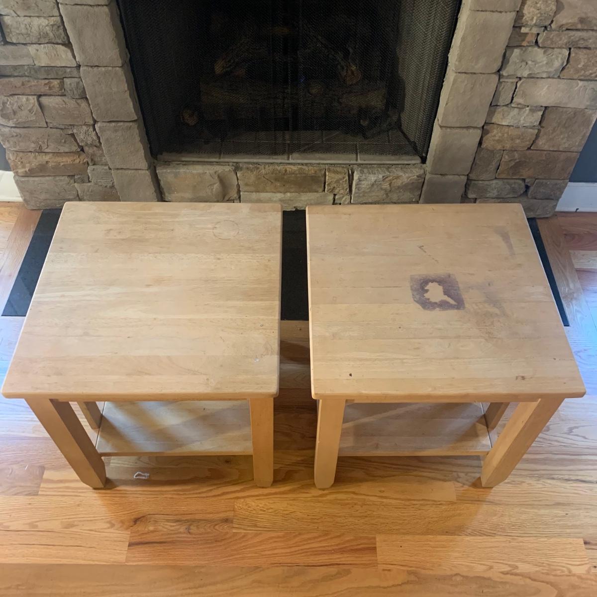 Two matching wood side tables with low shelf. Each table measures, 21”L x 21”W x 22”H. Please note, tables do have a few blemishes and will need to have hardware tightened. Give these tables a bit of attention and they will make great additions to any room!