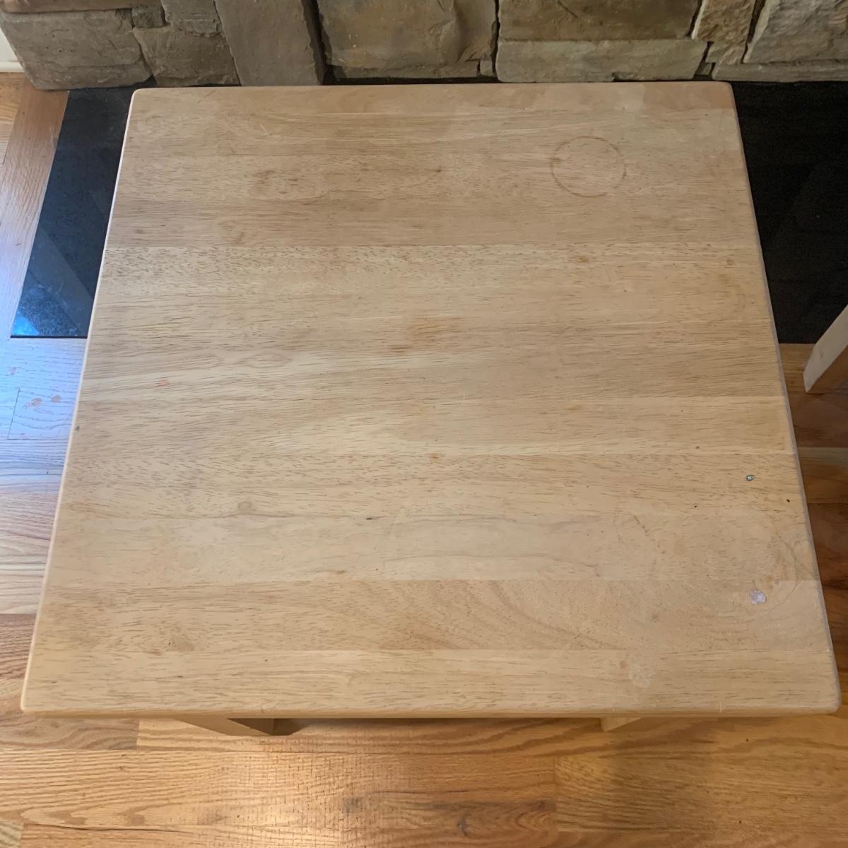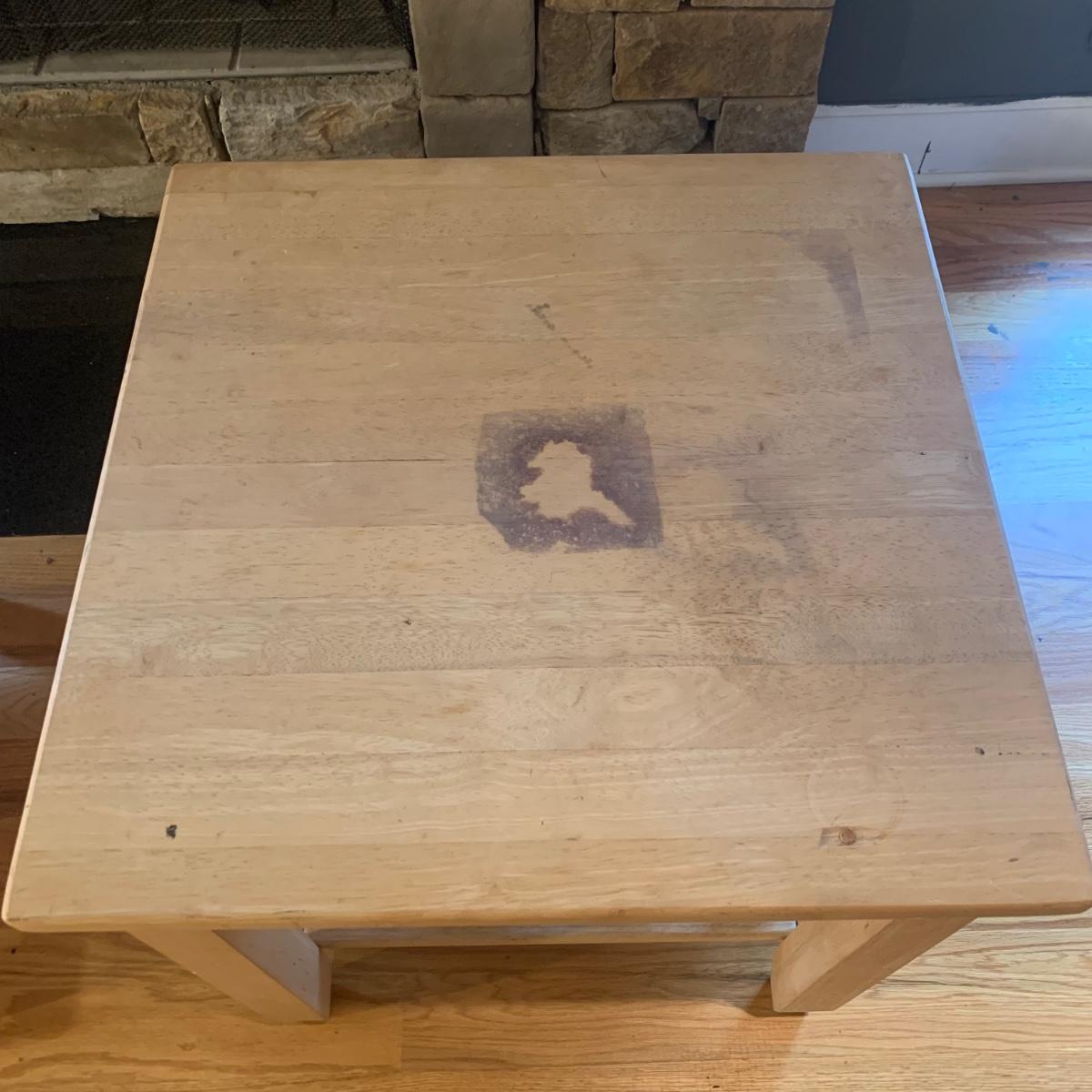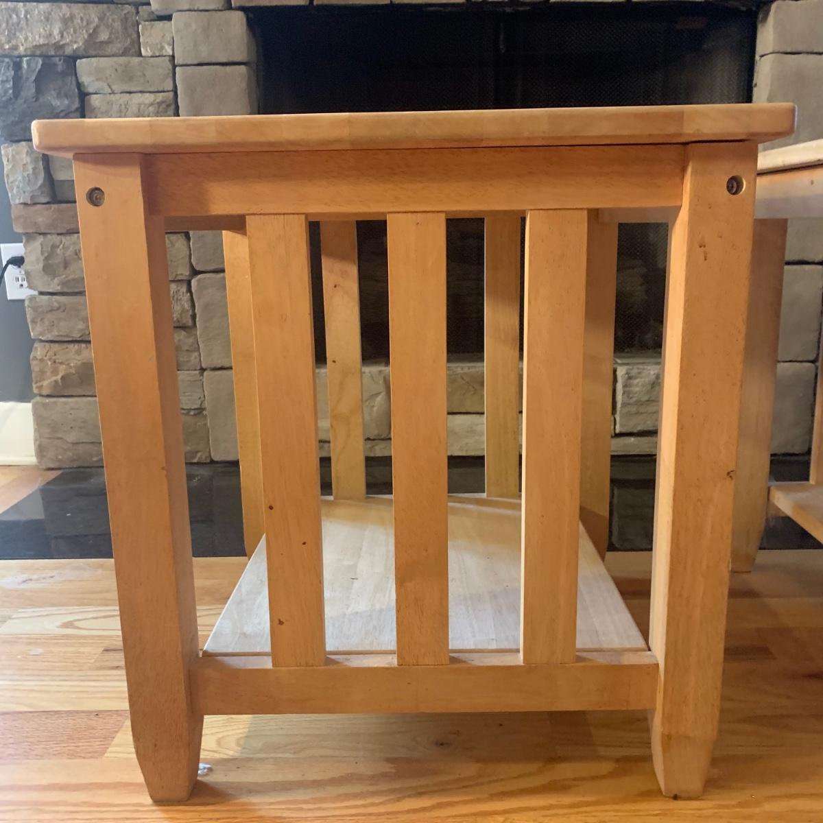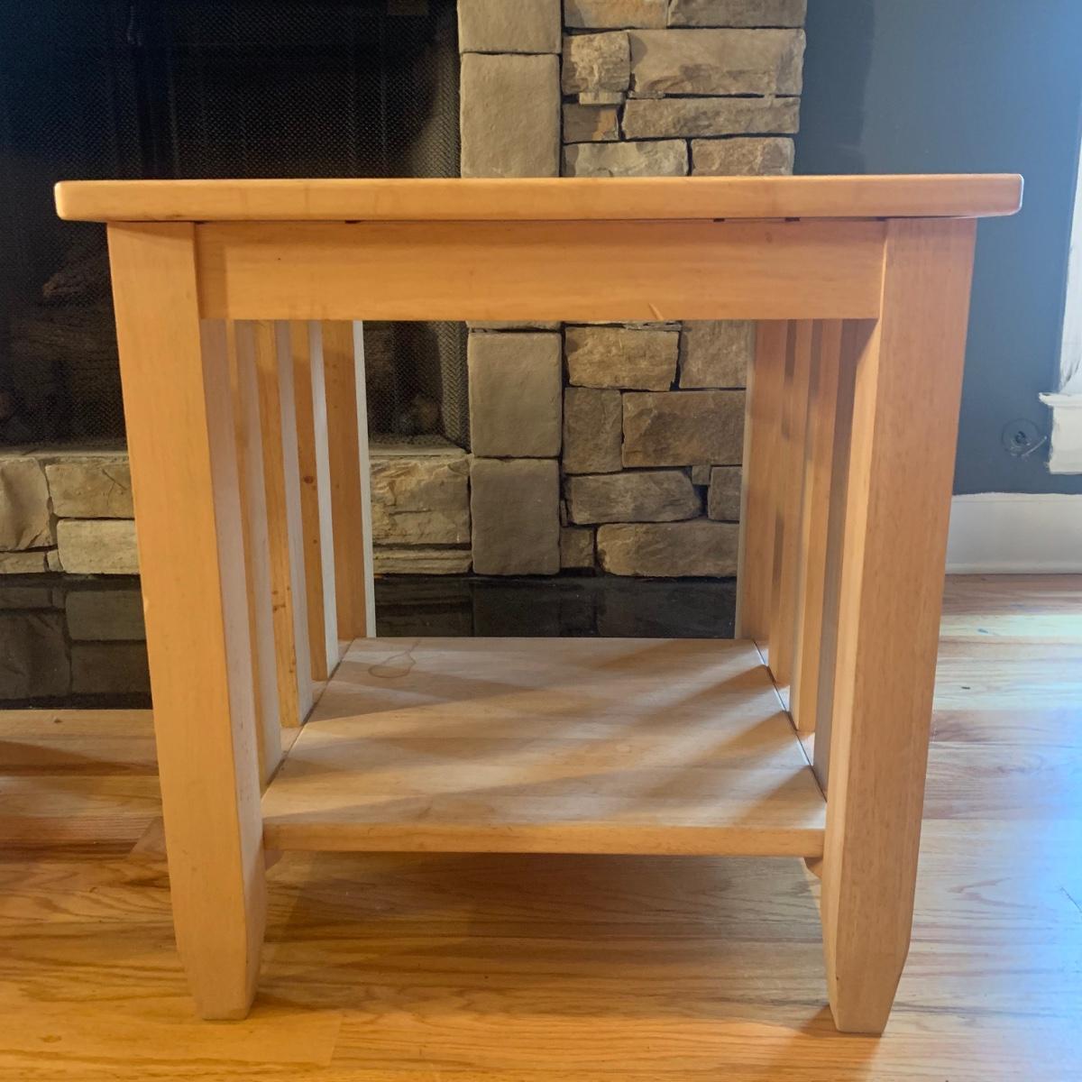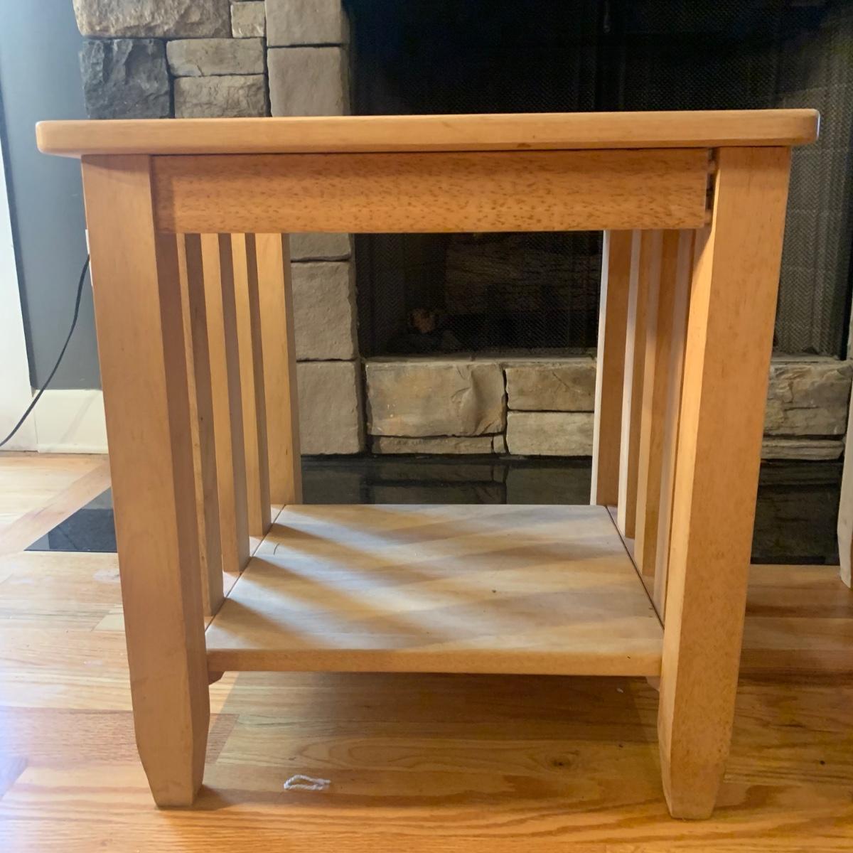 Two matching wood side tables with low shelf. Each table measures, 21”L x 21”W x 22”H. Please note, tables do have a few blemishes and will need to have hardware tightened. Give these tables a bit of attention and they will make great additions to any room!