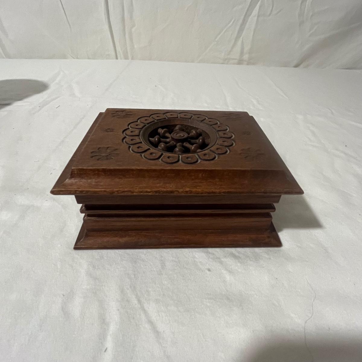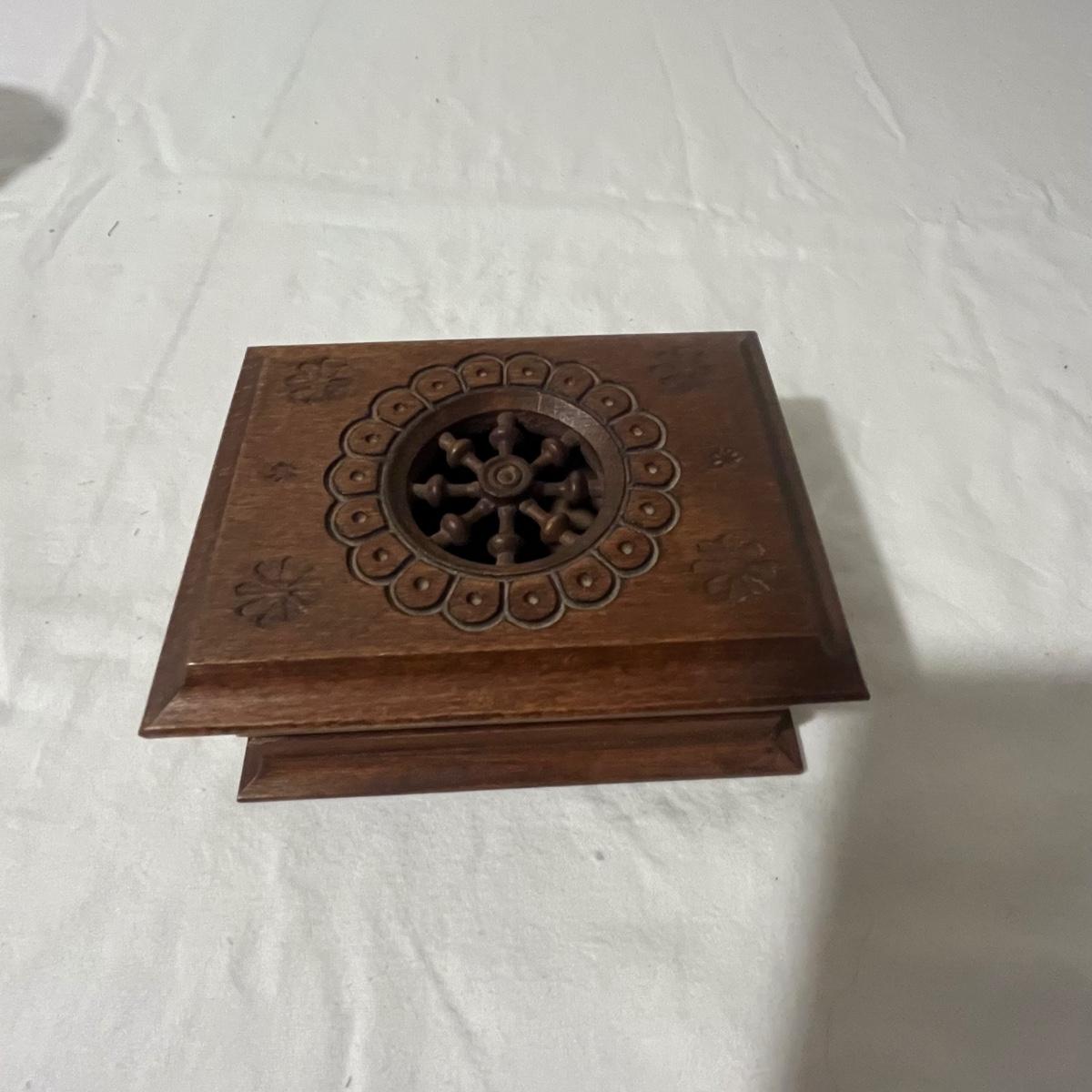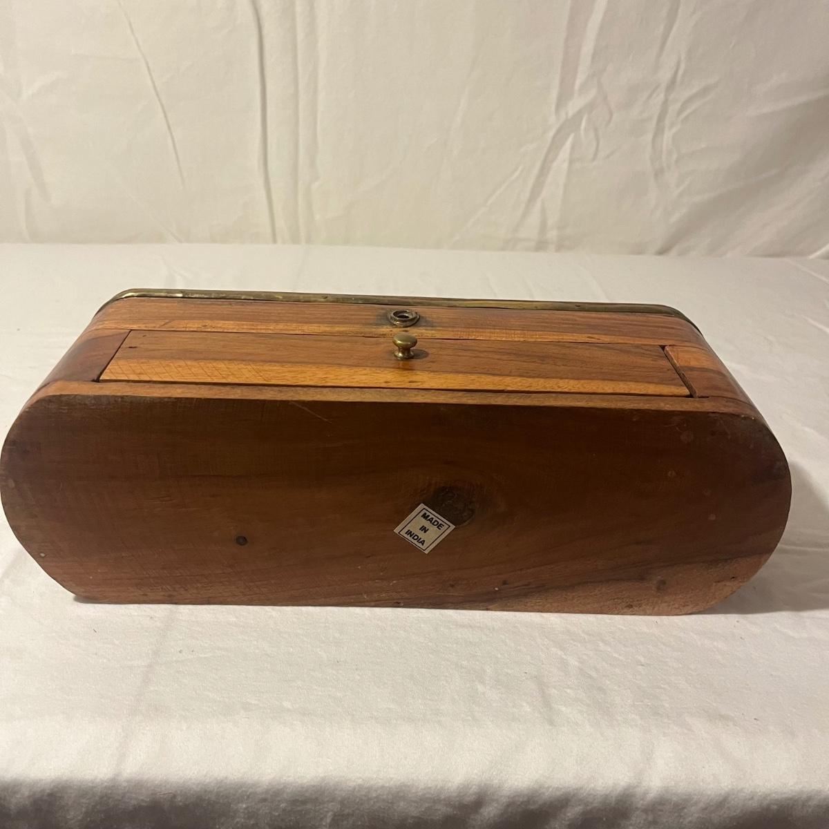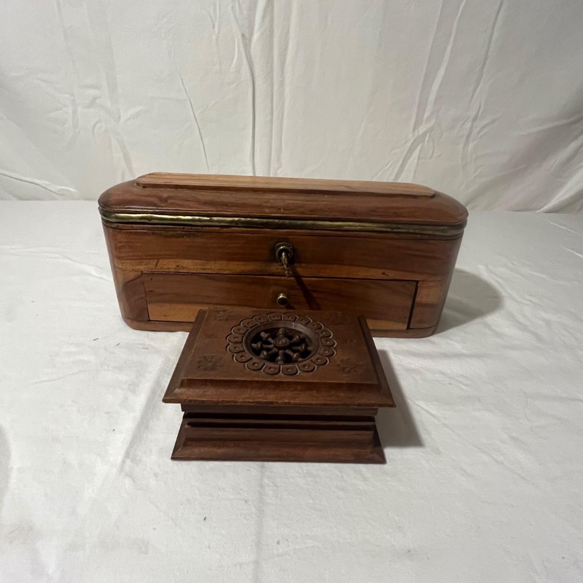 Lot includes two small wooden trinket or jewelry boxes. The larger box was made in India and has brass colored trim. There is a locking top with a drawer below. Key included. It measures 5” x 13.5” x 5.25”H. Also includes a small wooden box with a circular cutout on top.